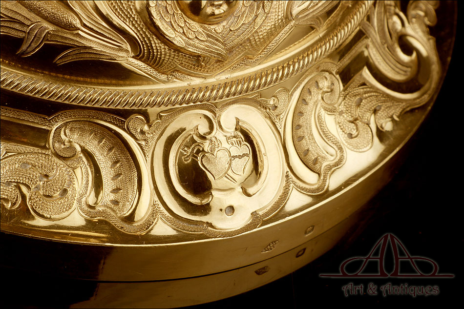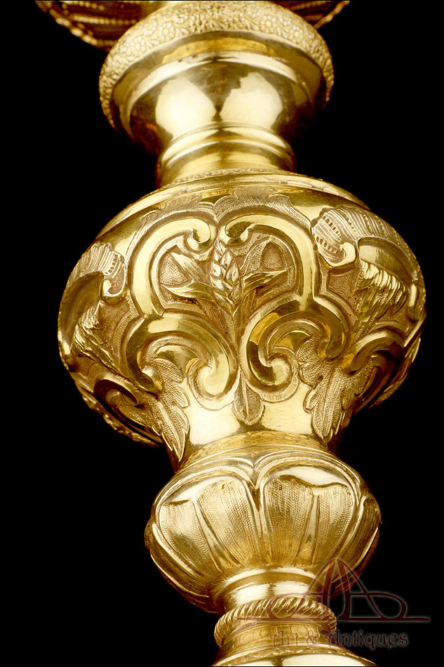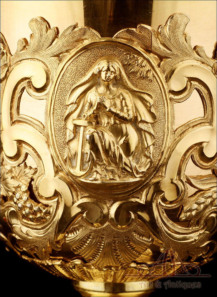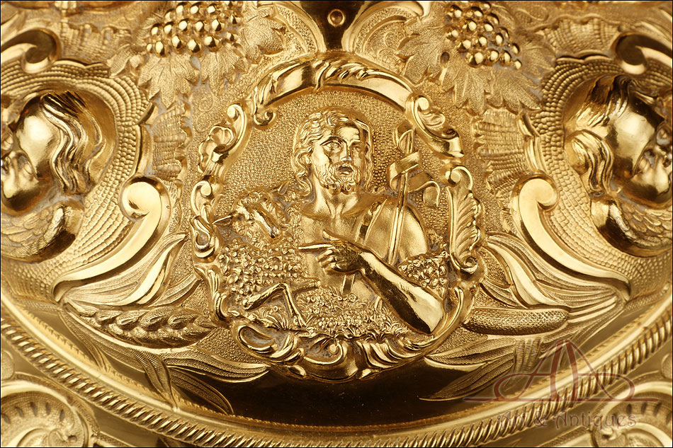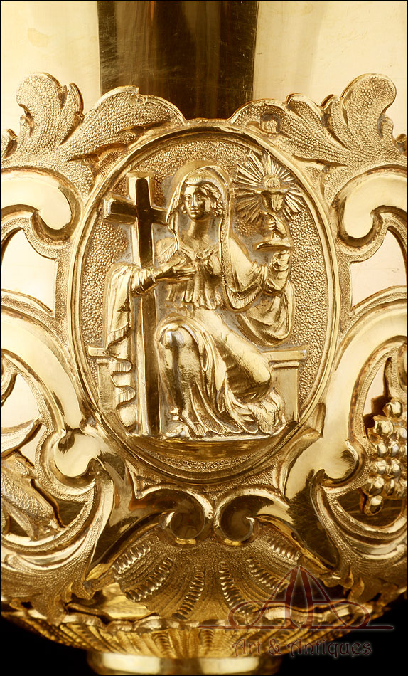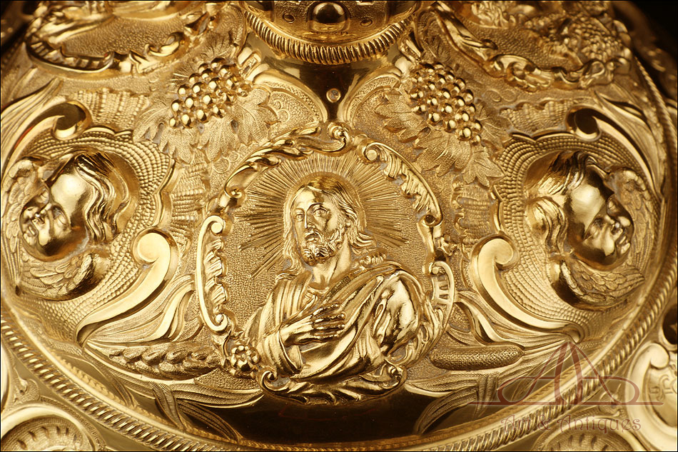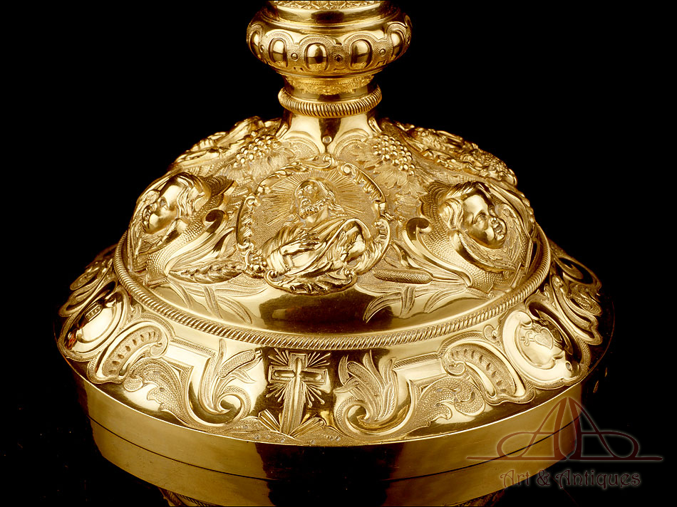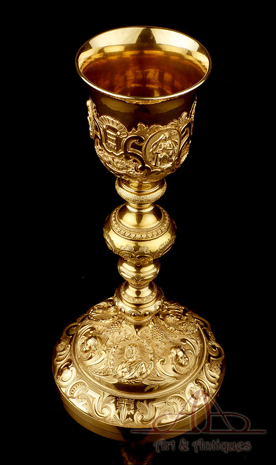 Fantásticos cáliz y patena antiguos de plata dorada fabricados en Francia en el siglo XIX, en muy buenas condiciones y con espectacular decoración grabada a mano. El cáliz, concretamente, es una pieza digna de un museo: la superficie de la pieza está totalmente cubierta por motivos en relieve o grabados en el metal, que conforman una decoración tan preciosista como magnífica. La base del cáliz es circular y amplia; el borde lleva grabados tres símbolos católicos (la Cruz en el Calvario, el Sagrado Corazón atravesado por una lanza y el Ojo de la Providencia), separados por hermosas volutas superpuestas.