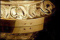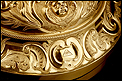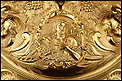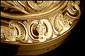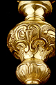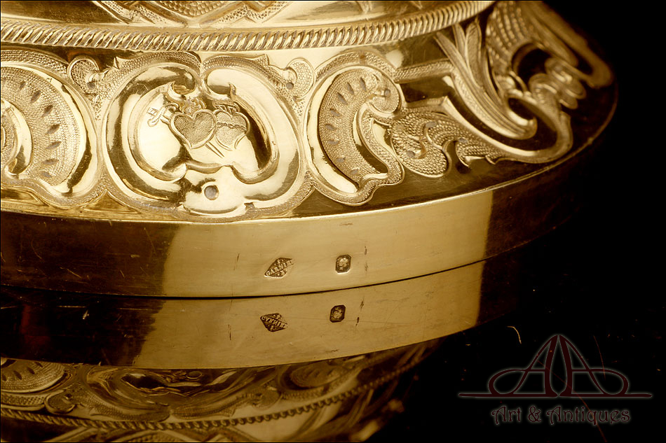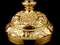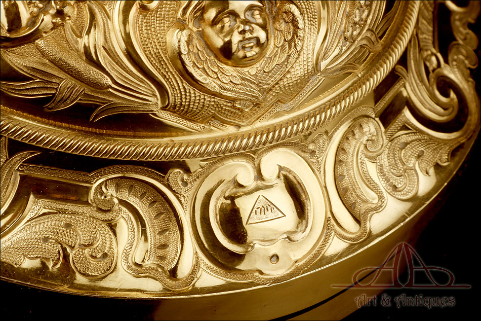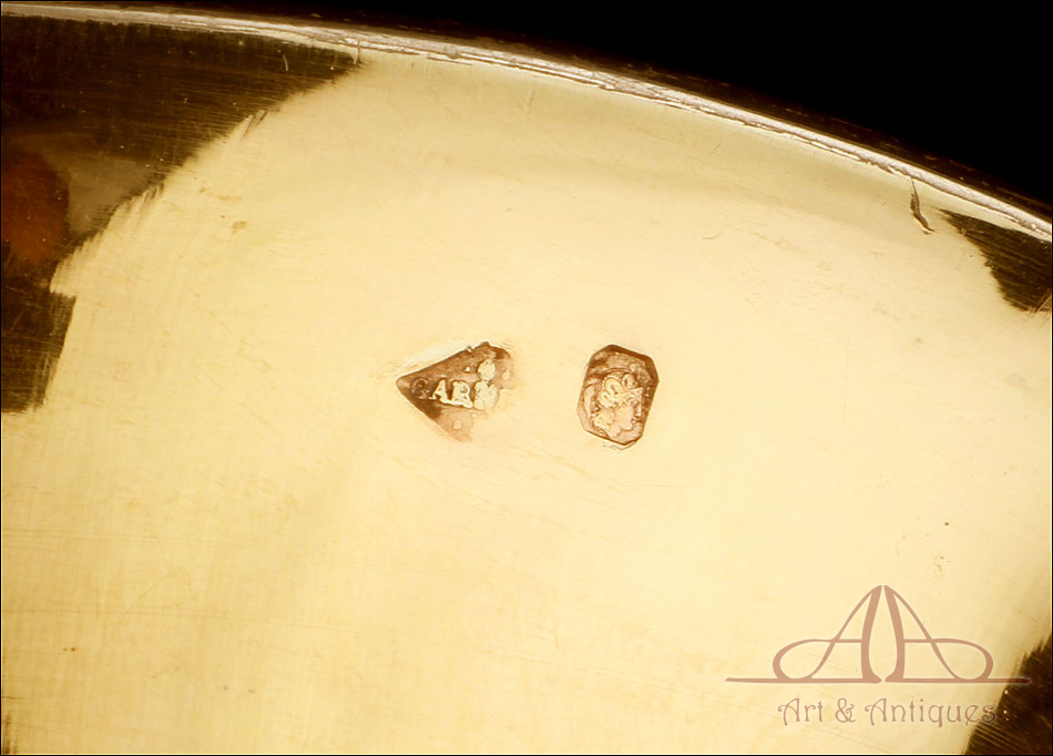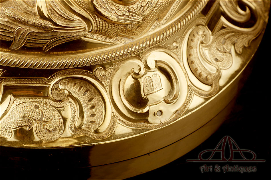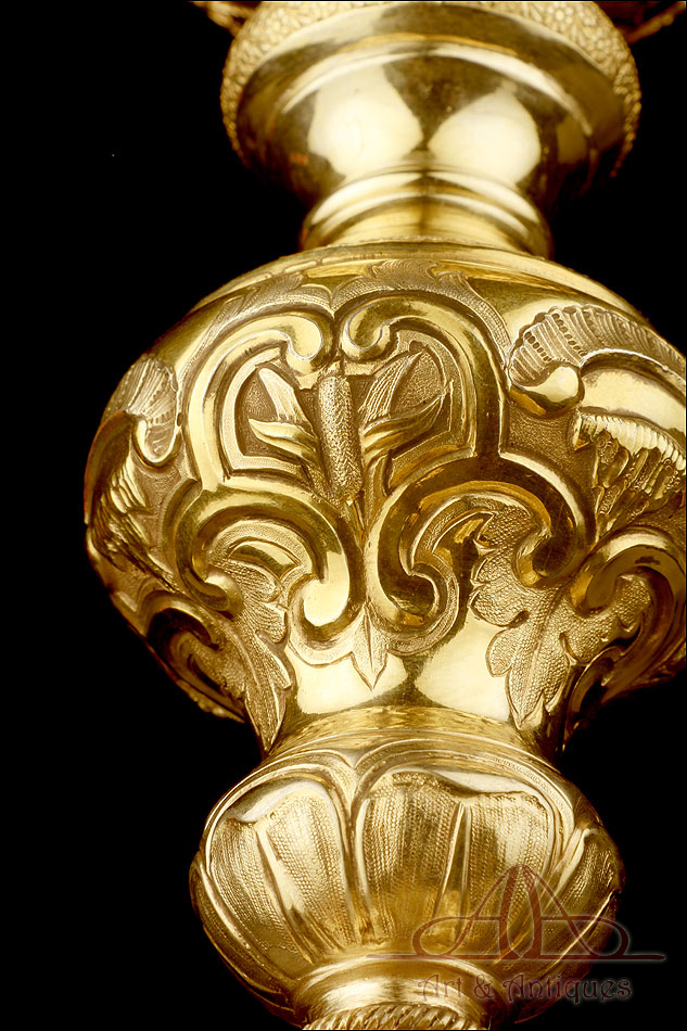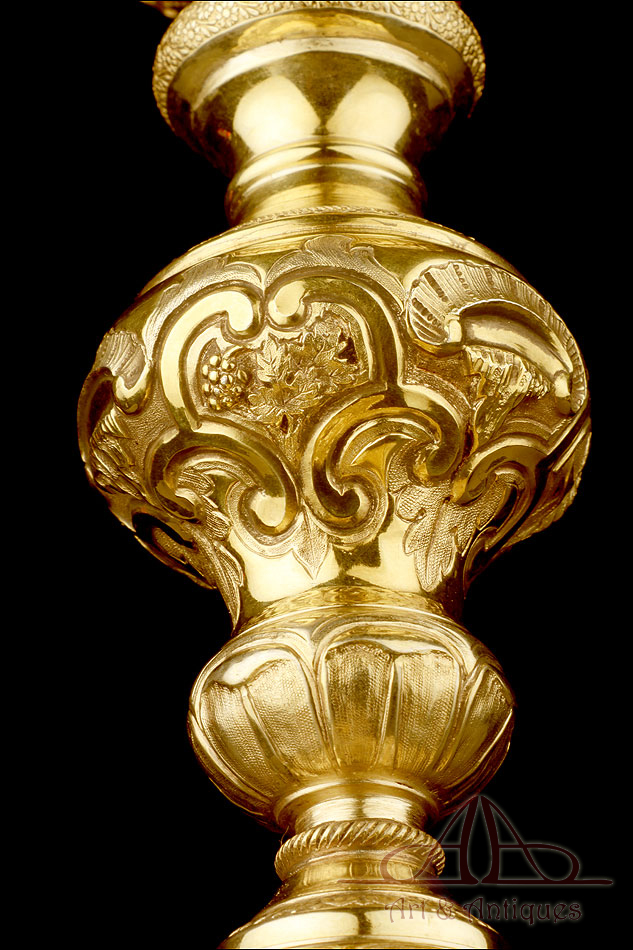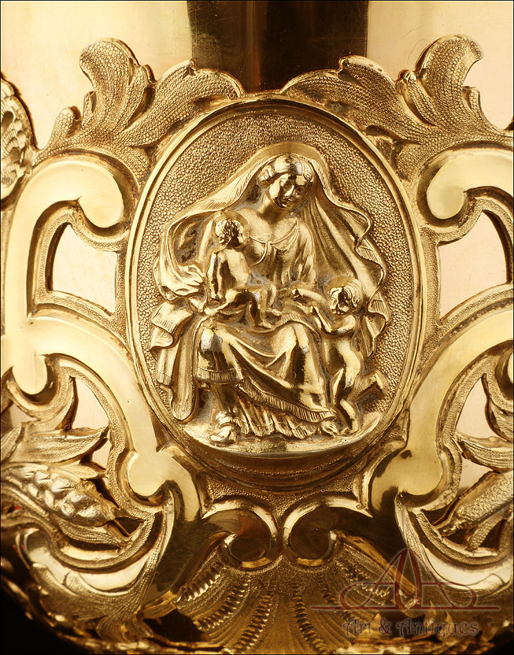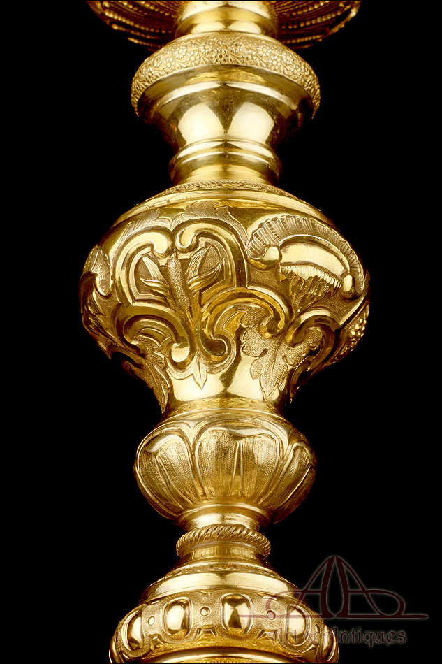 Fantásticos cáliz y patena antiguos de plata dorada fabricados en Francia en el siglo XIX, en muy buenas condiciones y con espectacular decoración grabada a mano. El cáliz, concretamente, es una pieza digna de un museo: la superficie de la pieza está totalmente cubierta por motivos en relieve o grabados en el metal, que conforman una decoración tan preciosista como magnífica. La base del cáliz es circular y amplia; el borde lleva grabados tres símbolos católicos (la Cruz en el Calvario, el Sagrado Corazón atravesado por una lanza y el Ojo de la Providencia), separados por hermosas volutas superpuestas.