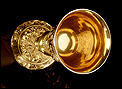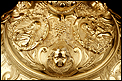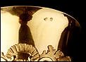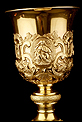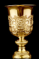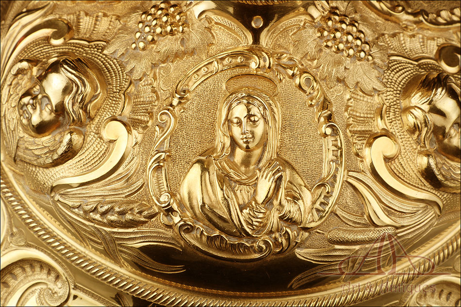 La copa que remata el cáliz lleva una preciosa sobrecopa de filigrana, formada por volutas y con tres medallones. Cada medallón contiene una efigie de una de las tres Virtudes Teologales: Fe, Esperanza y Caridad. De nuevo, cabe destacar la extraordinaria calidad del trabajo de labrado que se puede percibir en las imágenes. Las Virtudes están acompañadas por los símbolos de la Eucaristía. La patena que completa el conjunto, también de plata dorada, está decorada con el acrónimo IHS y el Sagrado Corazón grabados a mano y rodeados por una corona de espinas. Tanto el cáliz como la patena llevan el contraste de la plata francesa antigua y el del orfebre, Garnier.