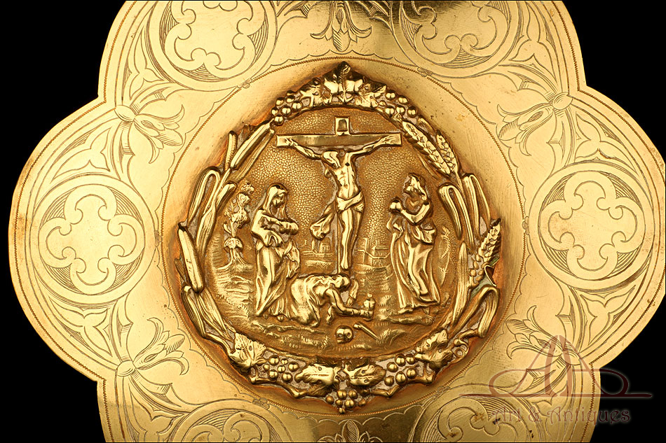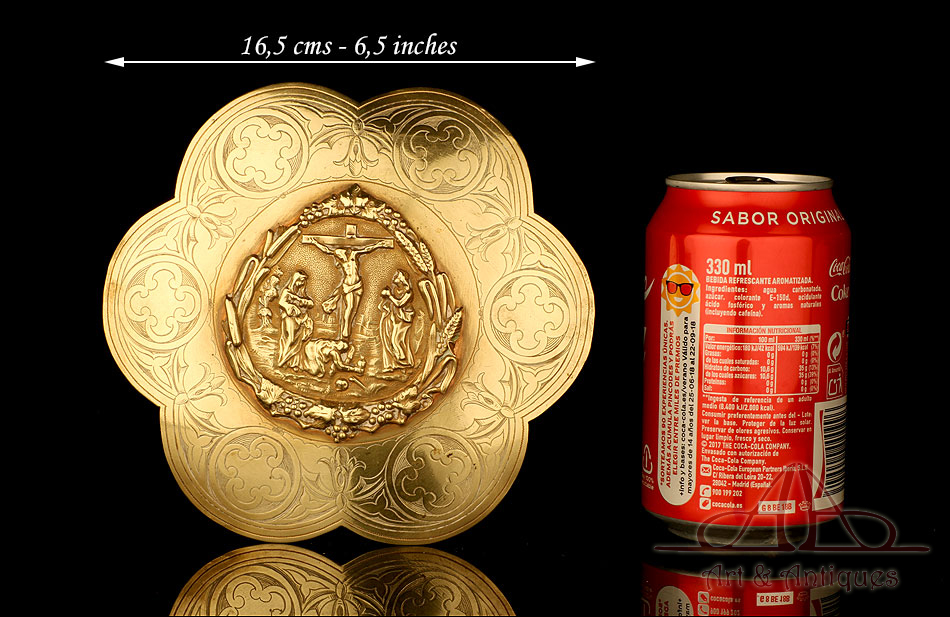 Raro y antiguo portapaz polilobulado en latón, fabricado en el siglo XIX (probablemente en Francia) y en muy buenas condiciones. El portapaz es un objeto litúrgico empleado para dar el ósculo de la paz durante la celebración de la misa. Su uso fue popular en las misas solemnes, en las cuales el sacerdote entregaba el portapaz a los fieles y estos se lo entregaban unos a otros en lugar de besarse o abrazarse. También lo solían besar, evitando así el contacto entre los fieles. El artículo que vemos en las imágenes es bastante raro por su forma polilobulada, muy poco habitual en este tipo de piezas. En el centro lleva una bella imagen de Jesucristo crucificado en el Calvario, con la Virgen María, su hermana (la mujer de Cleofás) y María Magdalena. La escena está realizada al detalle y muestra un magnífico dominio de la profundidad y el trabajo sobre el metal. A su alrededor podemos ver juncos, espigas de trigo y racimos de uvas en la vid, símbolos clásicos del Pueblo de Dios y la Eucaristía. En el marco que rodea a la escena, el portapaz lleva una delicada decoración grabada formada por detalles de inspiración medieval, simples y simétricos.