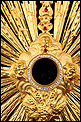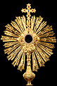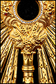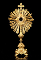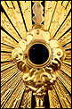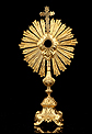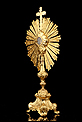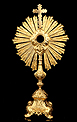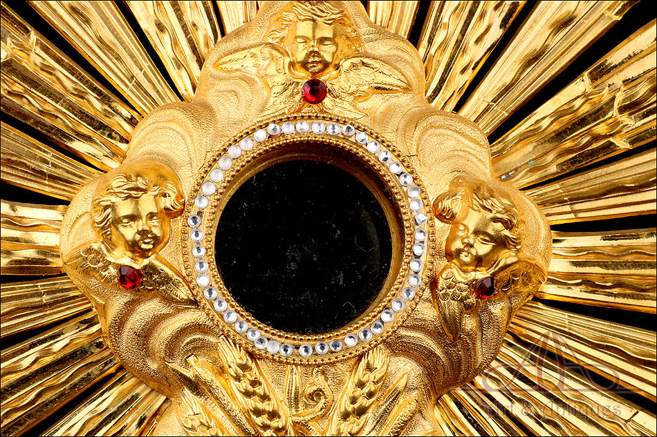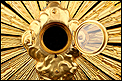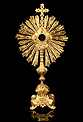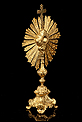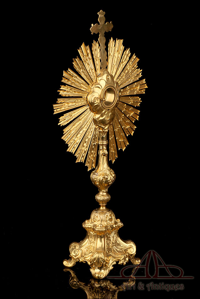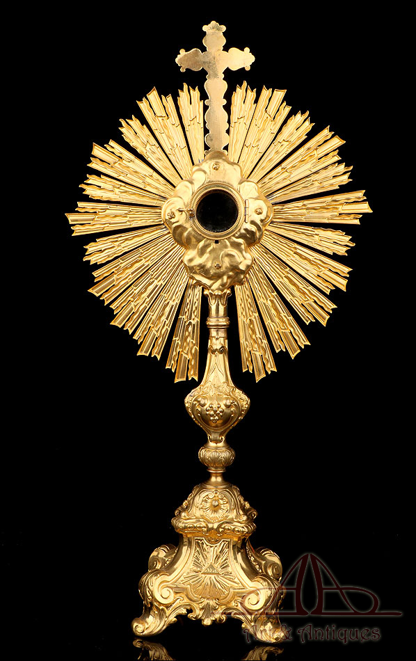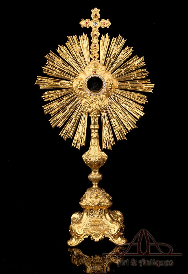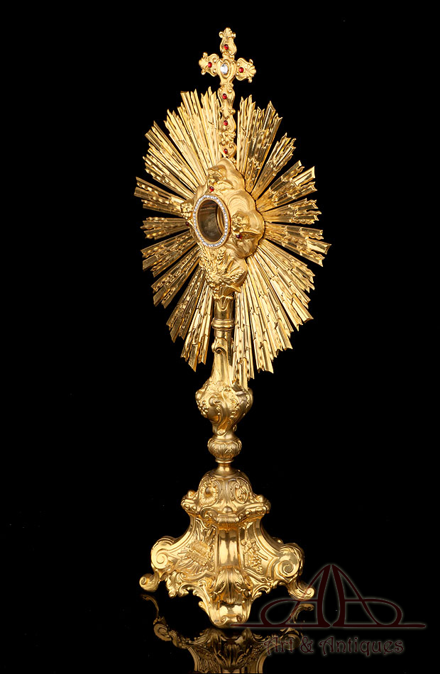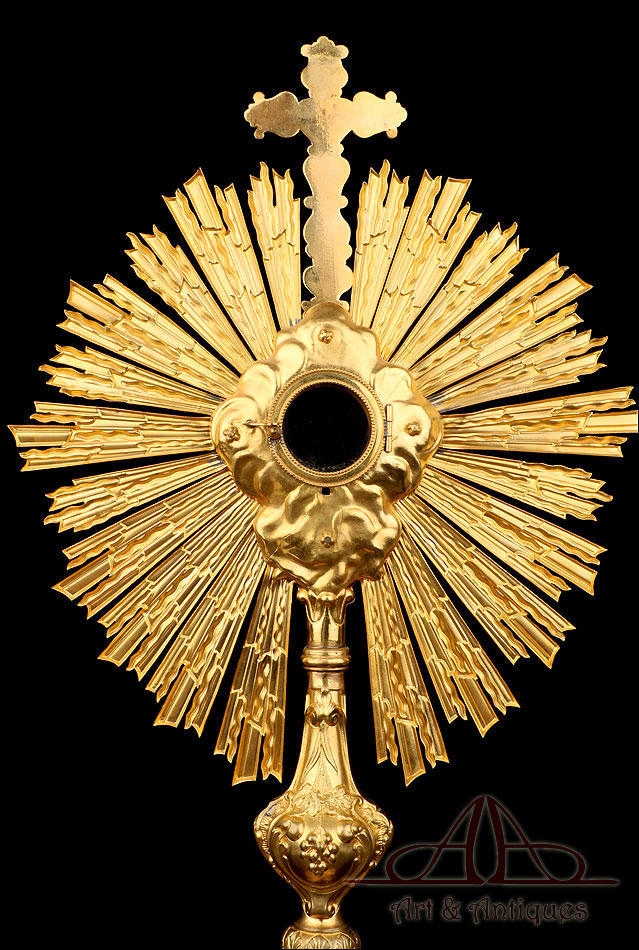 Esta antigua custodia enjoyada en metal dorado será un magnífico obsequio para un sacerdote, o para cualquier amante de las piezas de artesanía religiosa de calidad.
