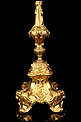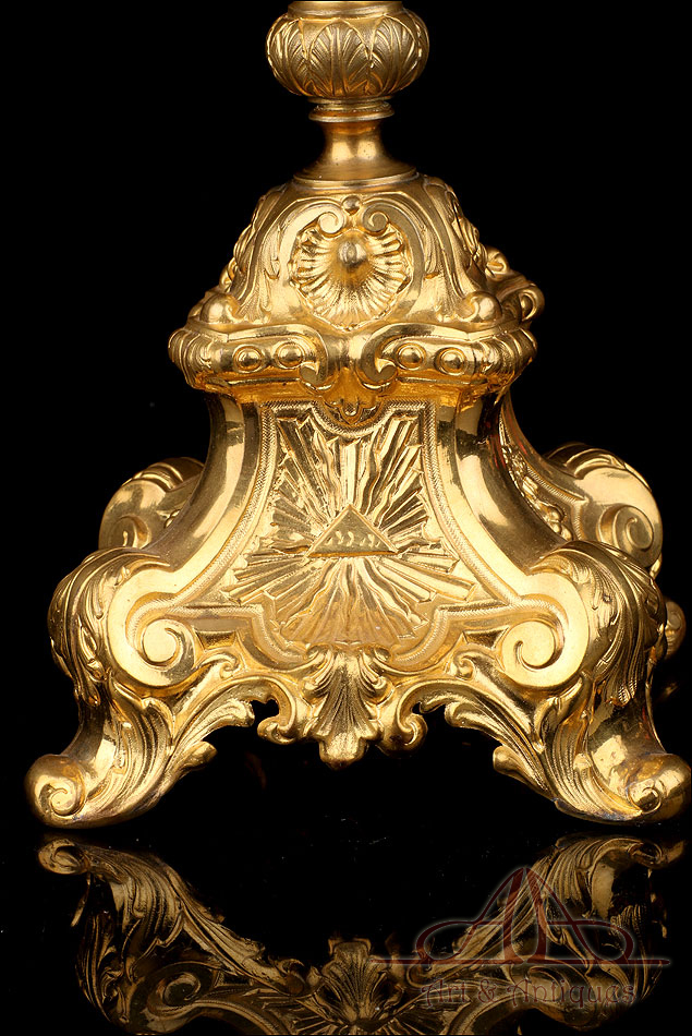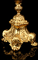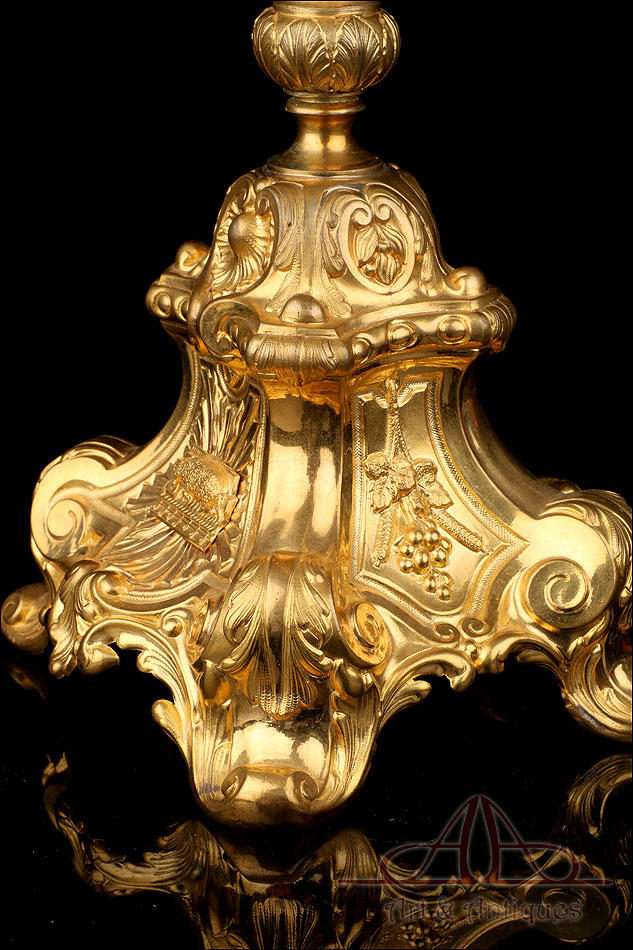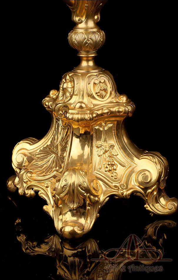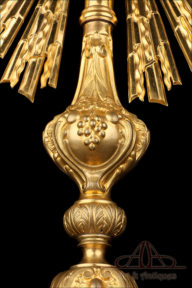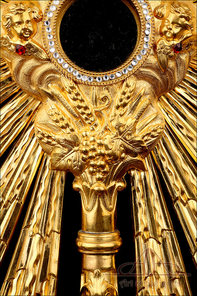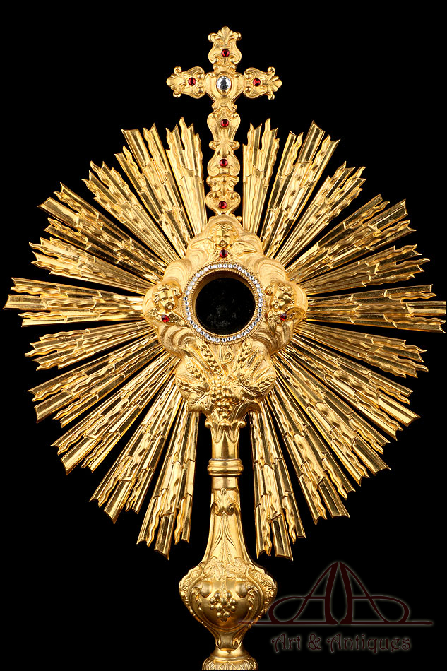 Fantástica y antigua custodia enjoyada en metal dorado fabricada a principios del siglo XX y muy bien conservada. Esta pieza destaca por su elegante porte y su atractiva decoración, con símbolos católicos y cristales de colores engarzados en el metal. La base es una sólida pieza con una atractiva decoración; entre las cuatro patas curvas, la peana lleva una serie de imágenes que representan el Cordero de Dios, el Ojo de la Providencia y racimos de uvas en la vid. El astil lleva un gran nudo que reproduce de nuevo este último motivo. En la parte superior, el sol conserva el viril original (sin luna) rodeado de cabezas de querubines, espigas de trigo y rayos finos y alargados. Alrededor del viril hay un marco circular formado por piedras blancas; también podemos ver varios cristales rojos entre los querubines. En la parte superior, la cruz que remata la pieza está decorada también con cristales rojos y blancos, creando un atractivo juego de colores y texturas.
