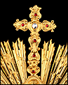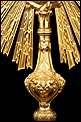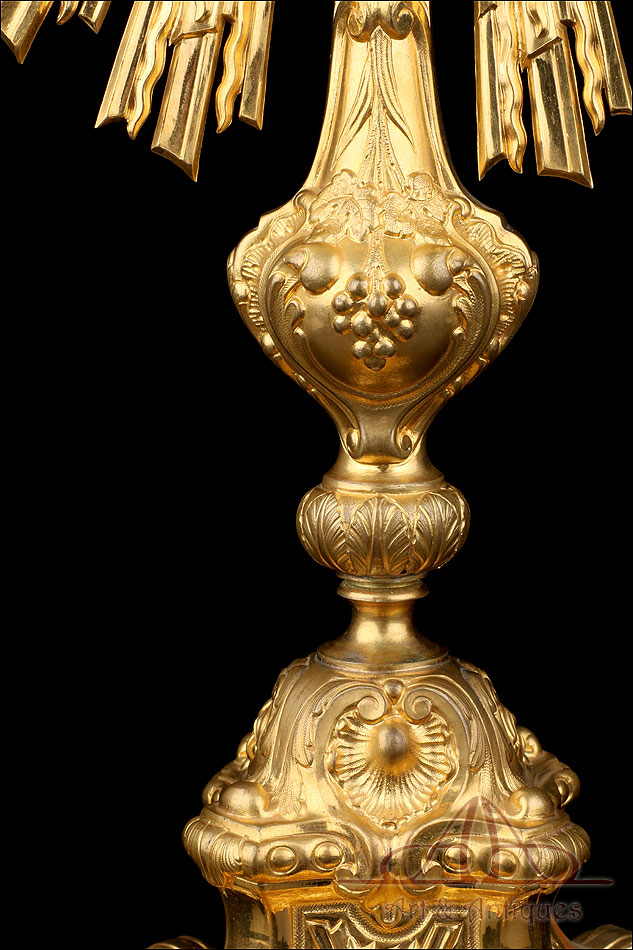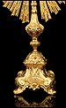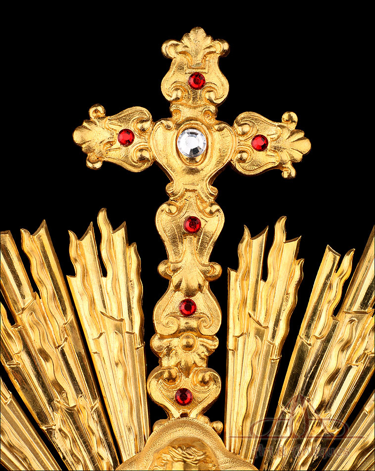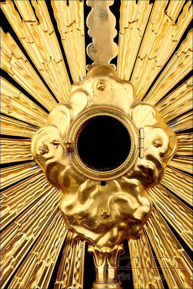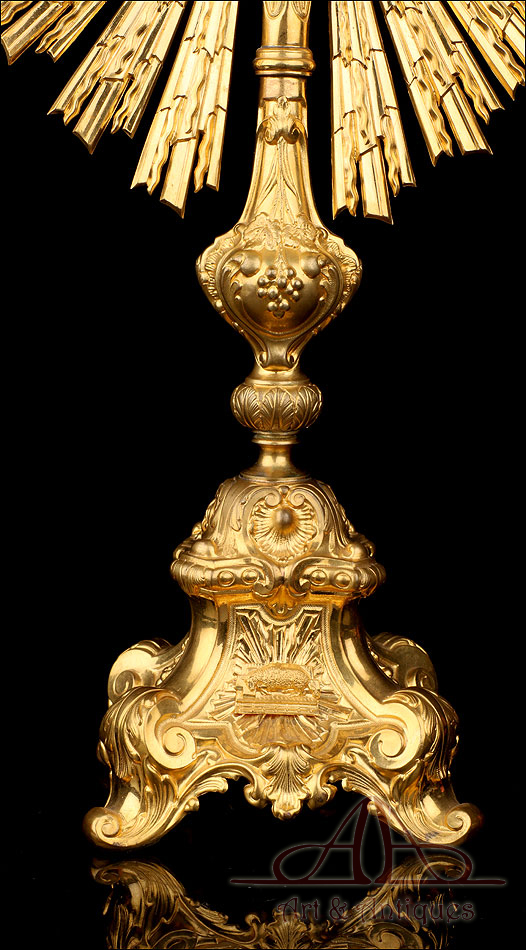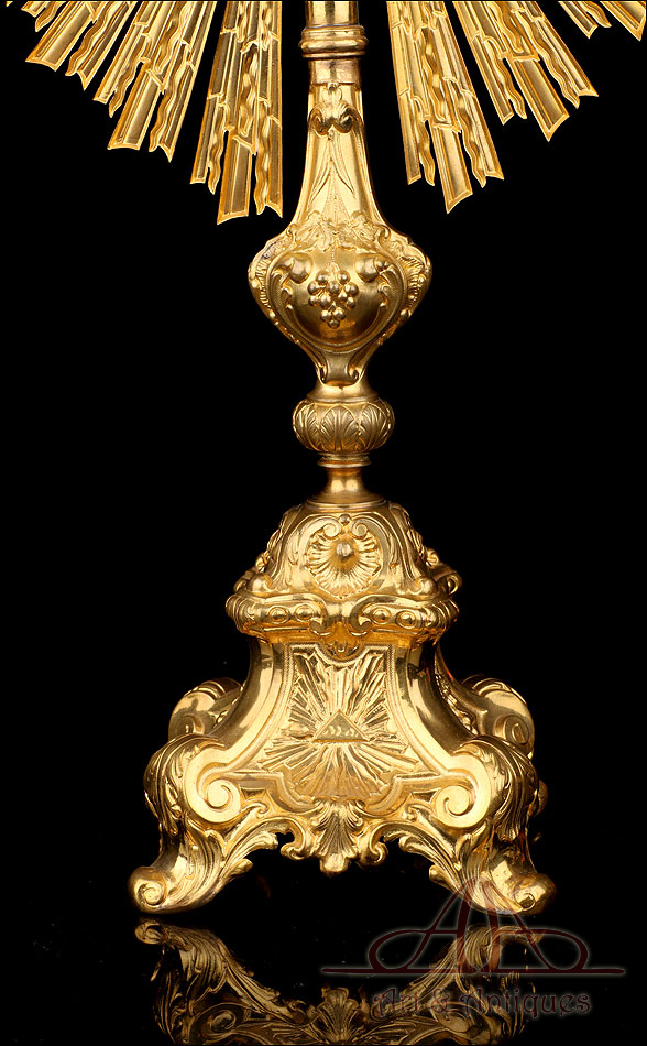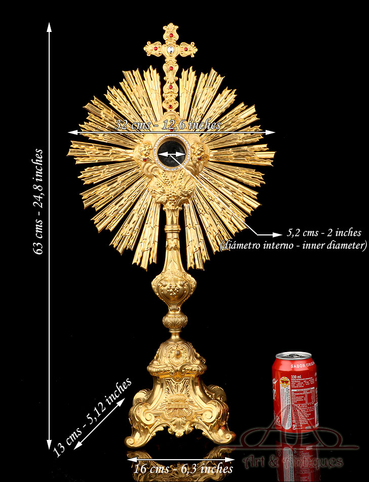 Medidas: Base: Ancho: 16 cm. Fondo: 13 cm. Ancho del Sol: 32 cm. Diámetro Interno del Viril: 5,2 cm. Altura: 63 cm.