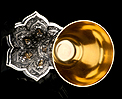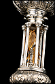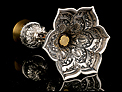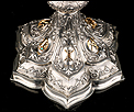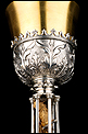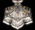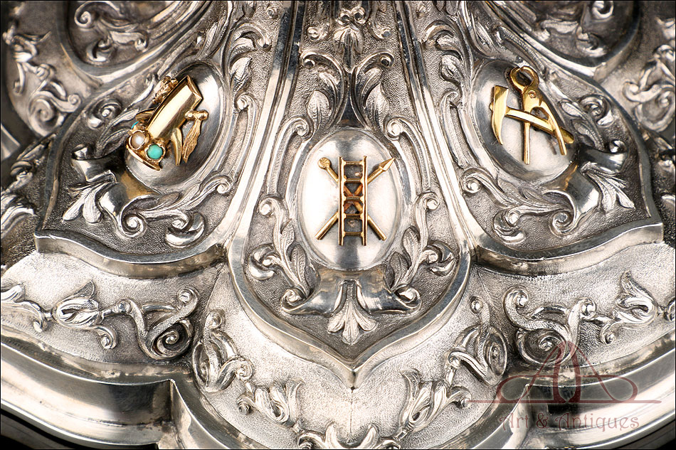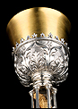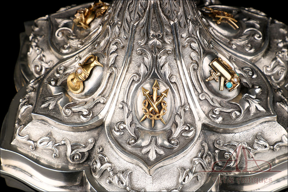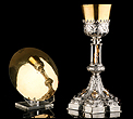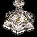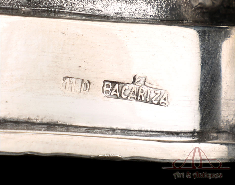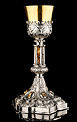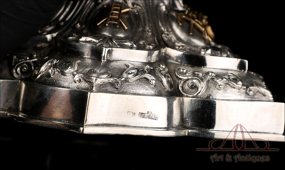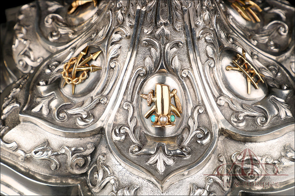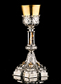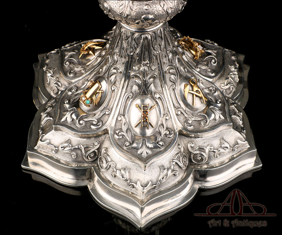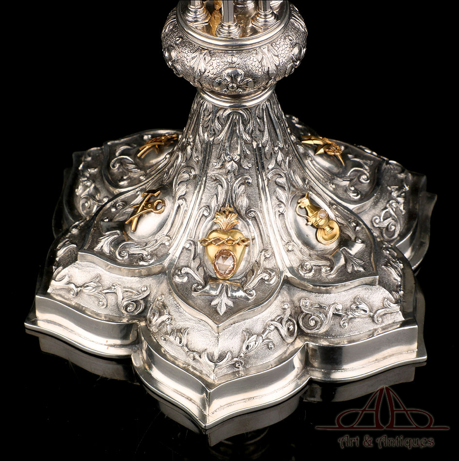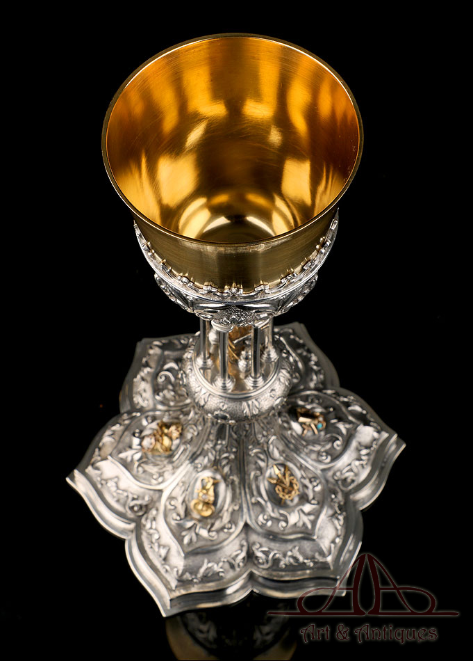 Extraordinario cáliz antiguo en plata, oro y plata dorada con diamante central, fabricado en España en 1900 por el orfebre Emilio Bacariza. Este artista tenía su platería en la Rúa del Villar, 58, en Santiago de Compostela; su impresionante habilidad queda patente en esta espectacular pieza, que destaca por su delicadeza y por el elegante uso de los materiales preciosos. El cáliz va acompañado por una patena totalmente lisa en plata dorada. La base del cáliz está dividida en seis secciones con forma puntiaguda, de estilo neo-medieval y decoradas con relieves de oro realizados a mano. Sobre un fondo de plata en su color y con volutas podemos ver seis símbolos relacionados con la Crucifixión y la Pasión de Cristo.