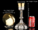 Medidas: Cáliz: Ancho de la Base: 15,5 cm. Ancho de la Copa: 8 cm. Altura: 26 cm. Peso: 745 g. Patena: Diámetro: 14 cm. Peso: 95 g.