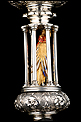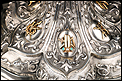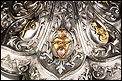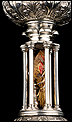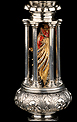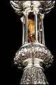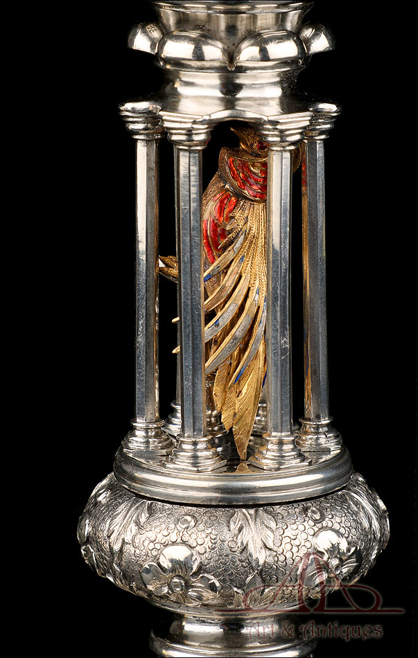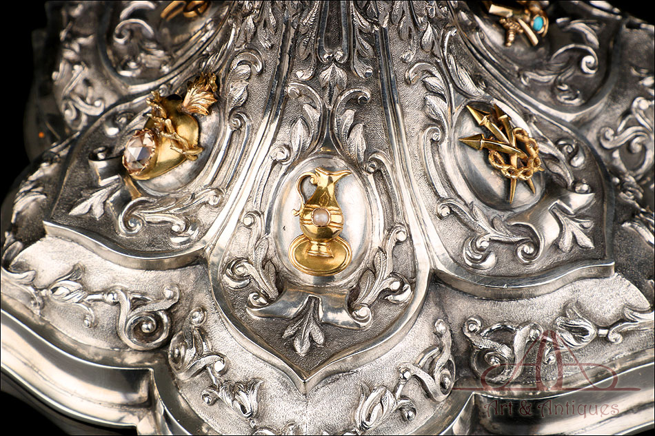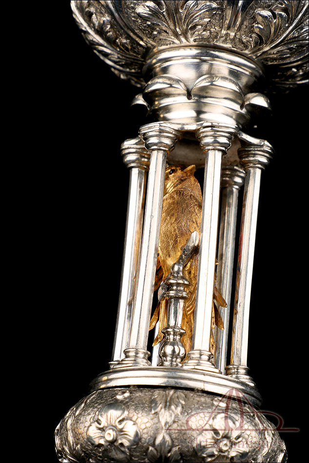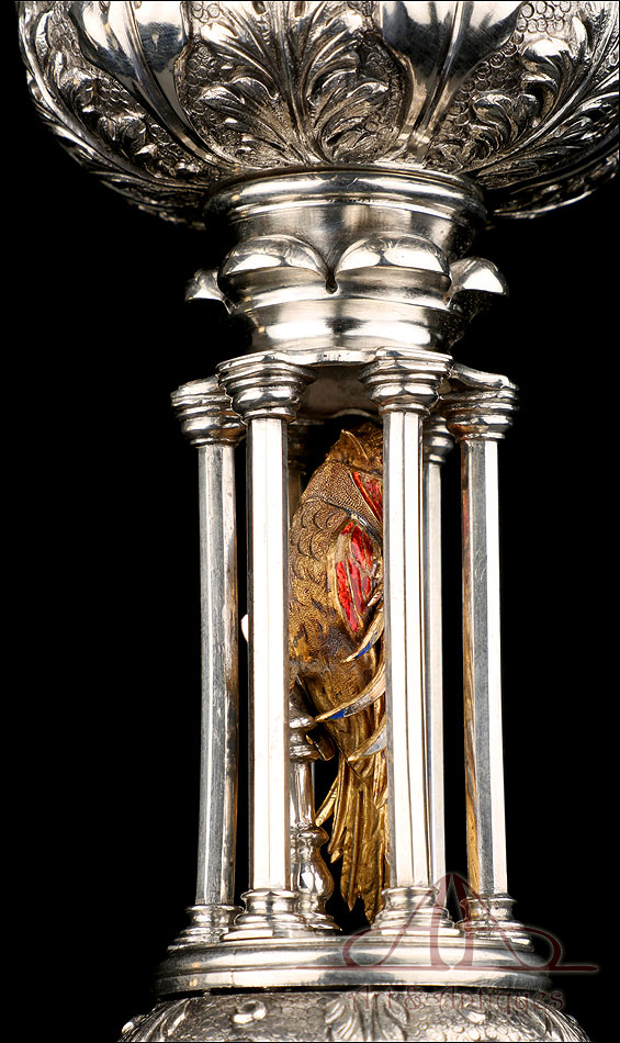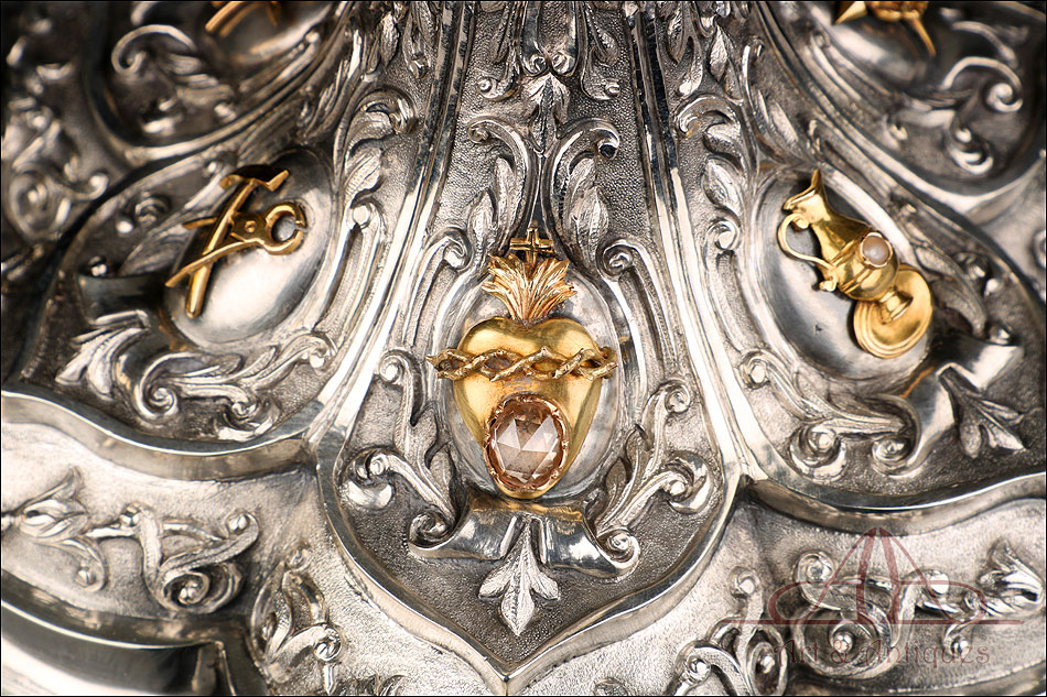 El símbolo principal, el Sagrado Corazón, lleva engarzado un gran diamante rosa tallado de forma ovalada. El resto de los motivos (la jarra, la columna del martirio, la corona de espinas con las lanzas, la escalera con la lanza y la esponja, las tenazas con el martillo) destacan por su delicadeza y bella factura; algunos de ellos están adornados con perlas naturales y turquesas auténticas. Sobre la base destaca una de las partes más hermosas de esta pieza: el tallo, en forma de jaula y con una preciosa figura de plata dorada en su interior que representa a un ave del paraíso, posada en una rama. El ave está decorada con esmaltes rojos y azules; podemos distinguir todas y cada una de las plumas, lo que revela la enorme habilidad y el talento del artista.