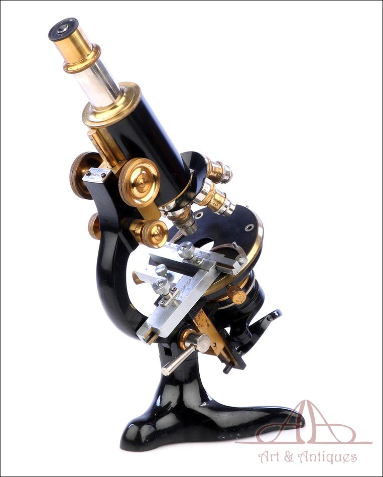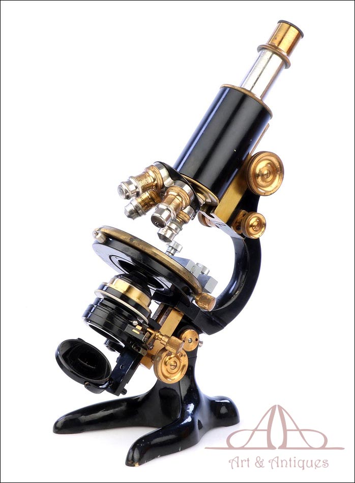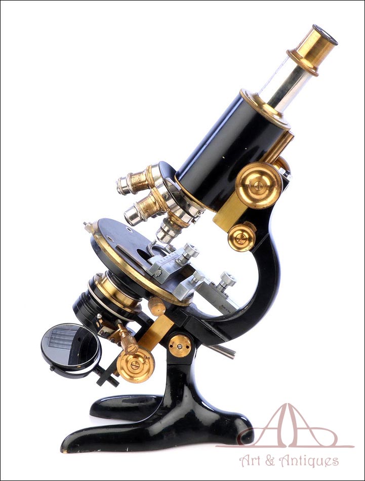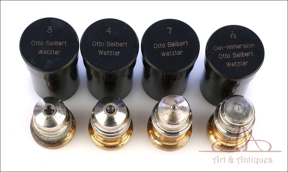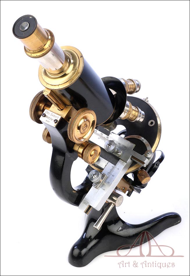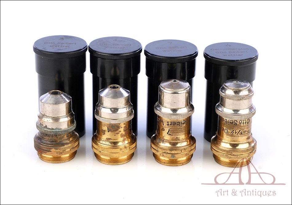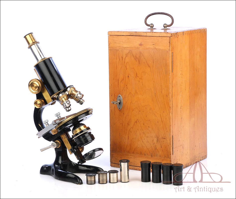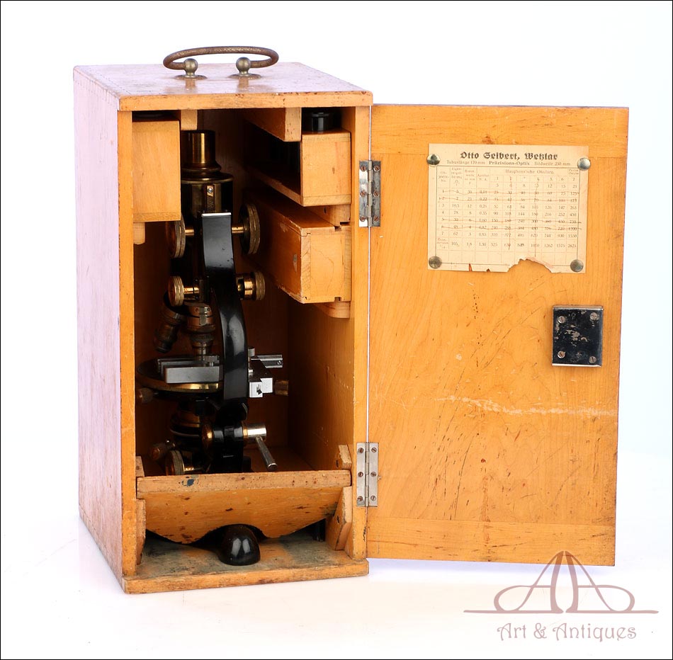 Extraordinario microscopio antiguo profesional Otto Seibert fabricado en Alemania circa 1920, en magnífico estado de conservación. El microscopio se presenta en su estuche de madera maciza y va acompañado de un juego de accesorios completo, según las especificaciones de la tarjeta. El juego incluye cuatro objetivos originales de la marca y cinco oculares. El microscopio lleva cuerpo de metal esmaltado en negro y piezas móviles de latón; los dos materiales están en muy buenas condiciones, lisos y brillantes. Incluye una pletina mecánica de ajuste micrométrico, revólver de 4 lentes y diafragma con regulación lateral. Todas las piezas funcionan a la perfección, incluyendo la cremallera y el sistema de enfoque.