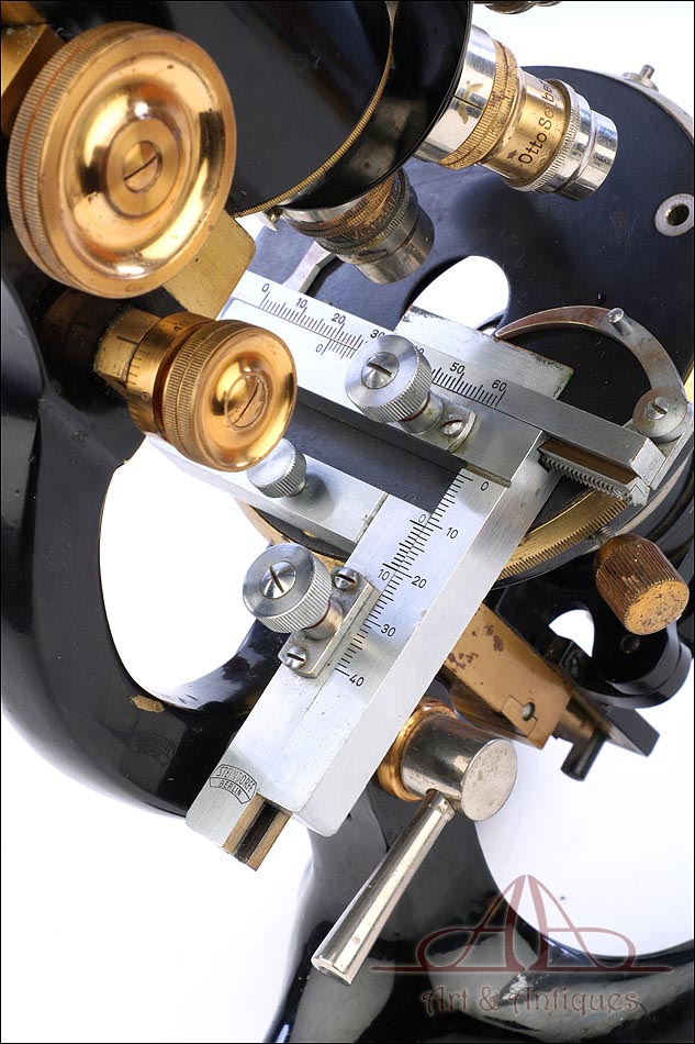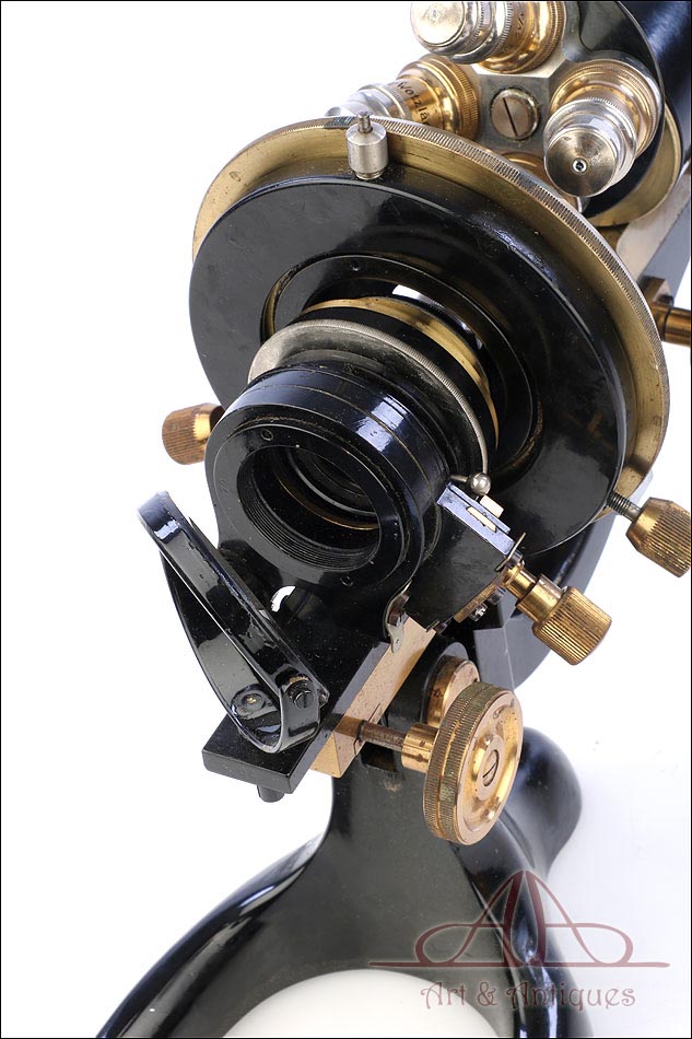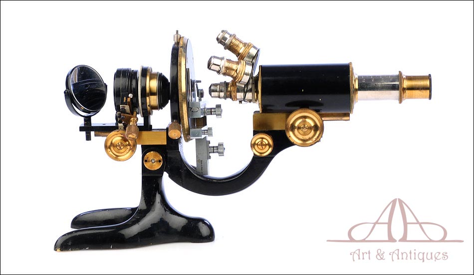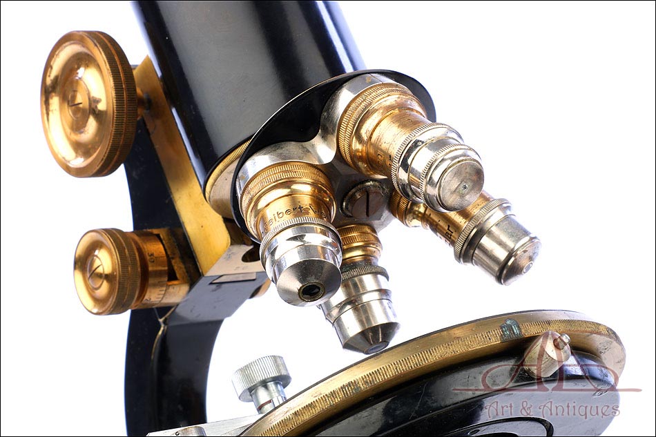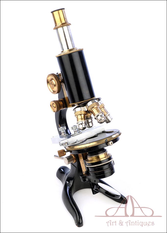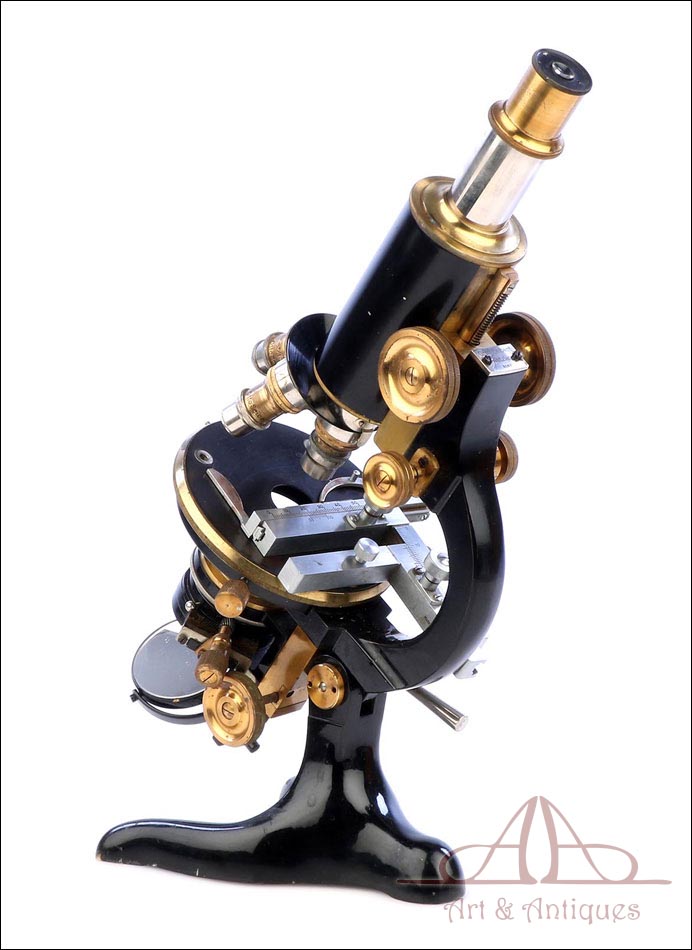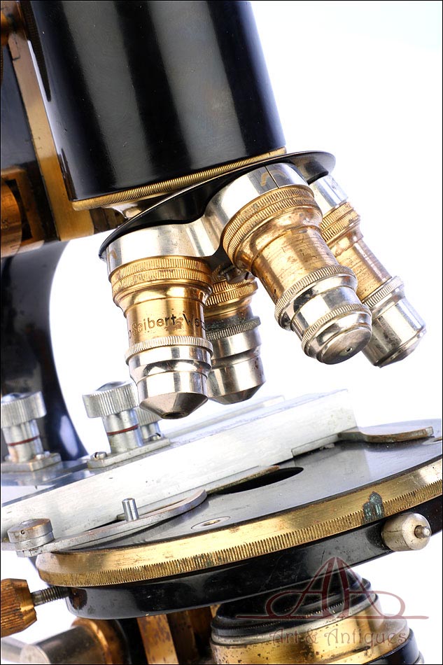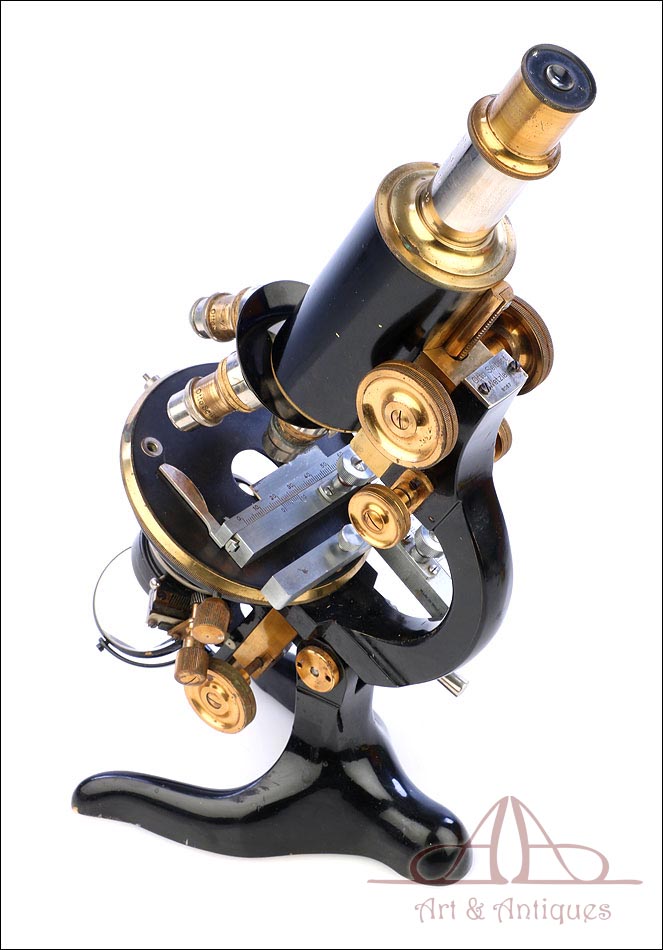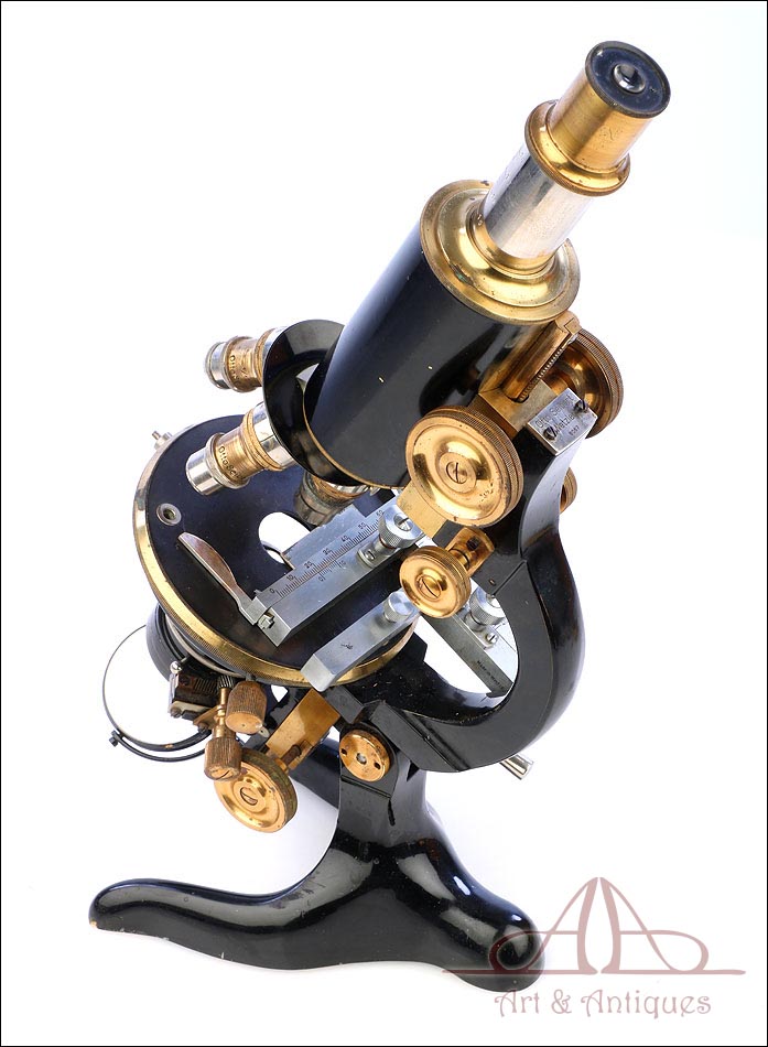 Extraordinario microscopio antiguo profesional Otto Seibert fabricado en Alemania circa 1920, en magnífico estado de conservación. El microscopio se presenta en su estuche de madera maciza y va acompañado de un juego de accesorios completo, según las especificaciones de la tarjeta. El juego incluye cuatro objetivos originales de la marca y cinco oculares. El microscopio lleva cuerpo de metal esmaltado en negro y piezas móviles de latón; los dos materiales están en muy buenas condiciones, lisos y brillantes. Incluye una pletina mecánica de ajuste micrométrico, revólver de 4 lentes y diafragma con regulación lateral. Todas las piezas funcionan a la perfección, incluyendo la cremallera y el sistema de enfoque.
