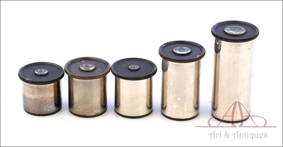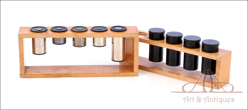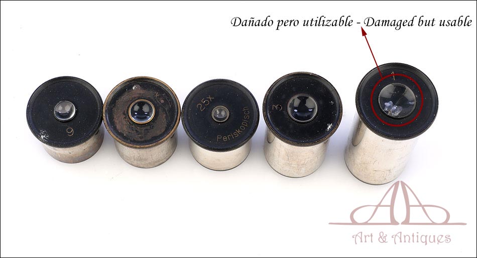Estéticamente aparecen algo rozados, pero interiormente están muy limpios y permiten una visualización de preparados magnífica. En cuanto a los oculares, llevan los números 1, 3, 5 y 6; el 7 ha sido sustituido por un modelo x25. El ocular nº 1 está ligeramente dañado; ofrece una visión correcta, pero se ve una línea en uno de los laterales. Tanto el microscopio como los accesorios se guardan ordenadamente en el estuche original de madera maciza, de tono claro y con cerradura y llave en estado de funcionamiento.