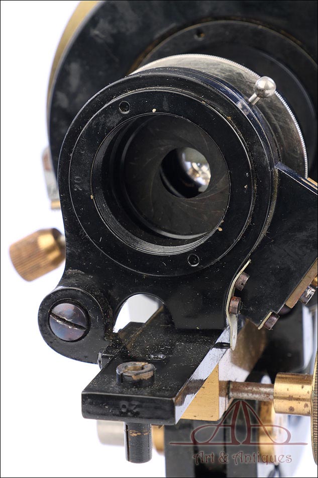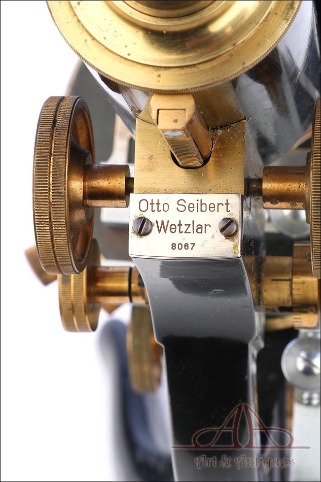 En la parte trasera superior del microscopio podemos ver el nombre de la marca y el número de serie del aparato grabados en el metal: Otto Seibert – Wetzlar – 8086. Por su parte, la pletina mecánica muestra también el nombre del fabricante: STEINDORFF – BERLIN. Los objetivos y oculares que acompaña al microscopio llevan el nombre de Seibert en las fundas; las lentes son nº 3, 4, 7 y de inmersión en aceite.