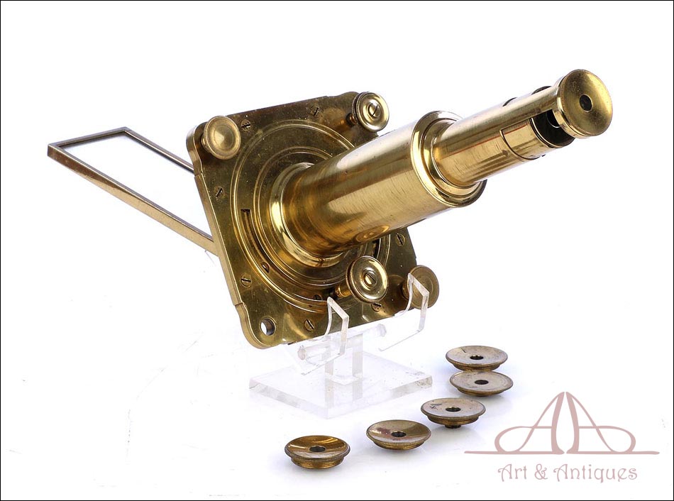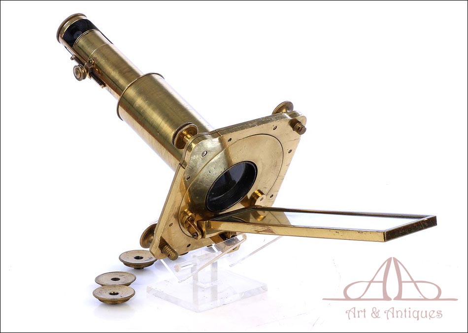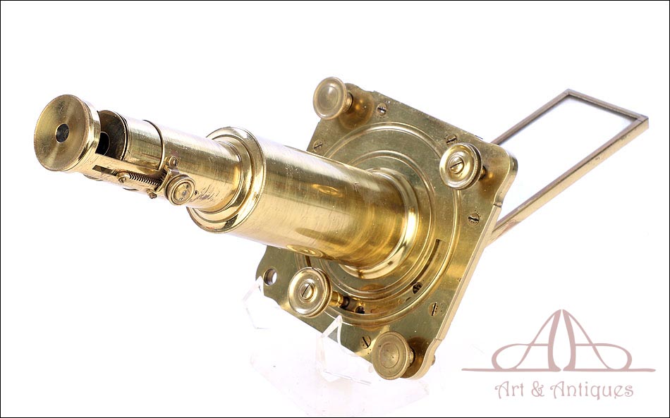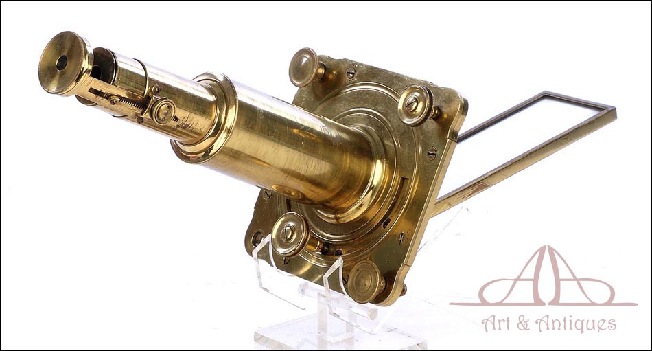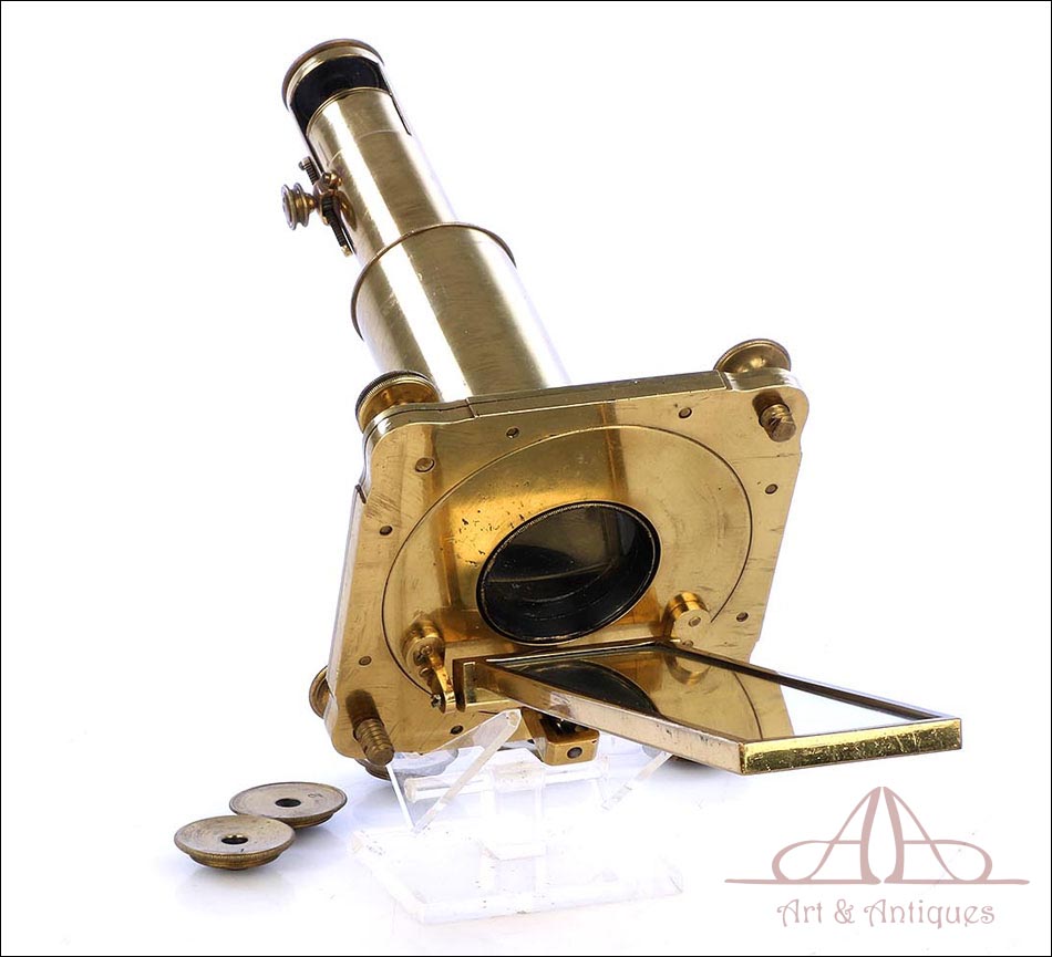 Extraordinario y rarísimo microscopio solar antiguo fabricado en Francia en el siglo XIX, en buenas condiciones y con lentes numeradas. El microscopio está íntegramente fabricado en latón y muestra un estado de conservación excelente. El espejo es original y está en buenas condiciones, al igual que las cremalleras y los engranajes. El metal está muy. El microscopio está completo; la única pieza que se echa de menos es un tornillo de fijación a la pared, detalle que no interfiere en su funcionamiento.