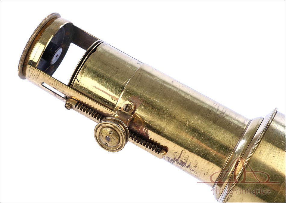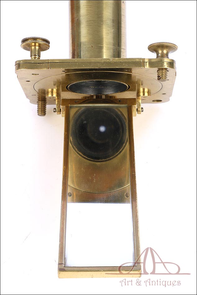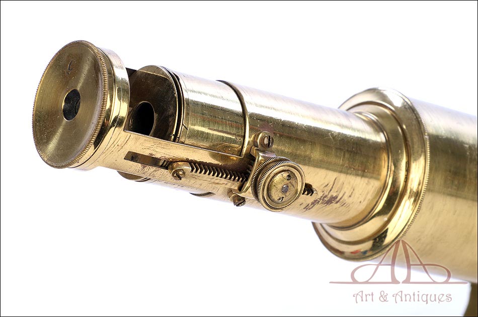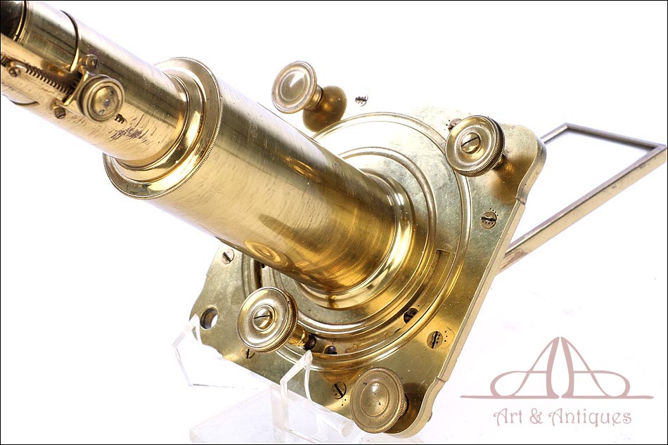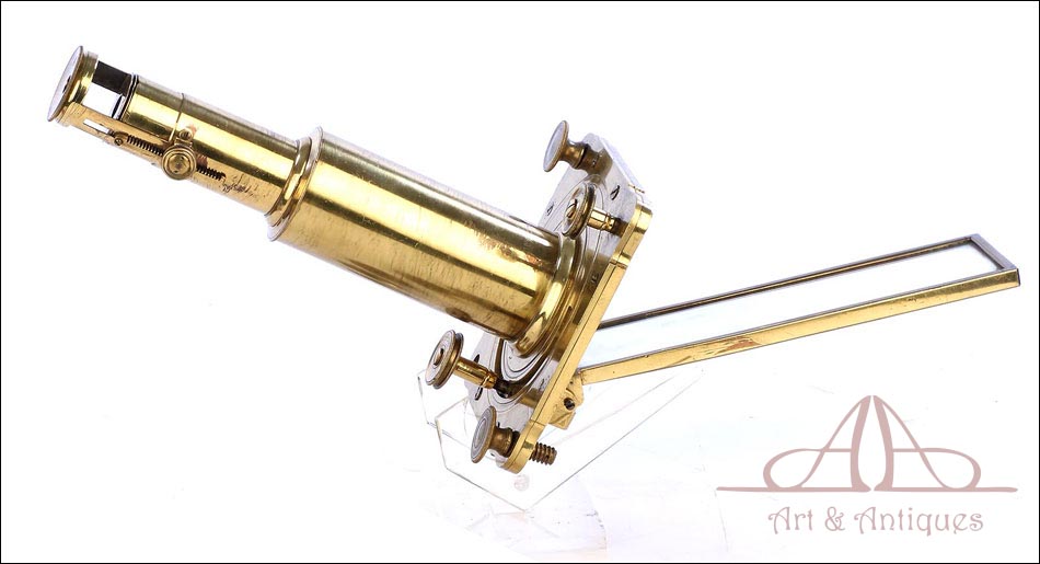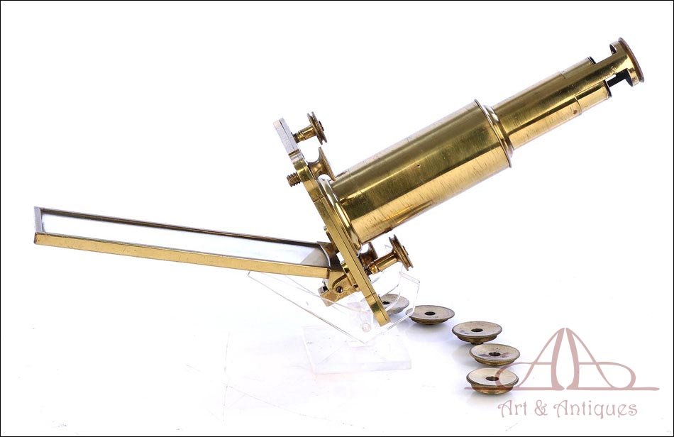Extraordinario y rarísimo microscopio solar antiguo fabricado en Francia en el siglo XIX, en buenas condiciones y con lentes numeradas. El microscopio está íntegramente fabricado en latón y muestra un estado de conservación excelente. El espejo es original y está en buenas condiciones, al igual que las cremalleras y los engranajes. El metal está muy. El microscopio está completo; la única pieza que se echa de menos es un tornillo de fijación a la pared, detalle que no interfiere en su funcionamiento.