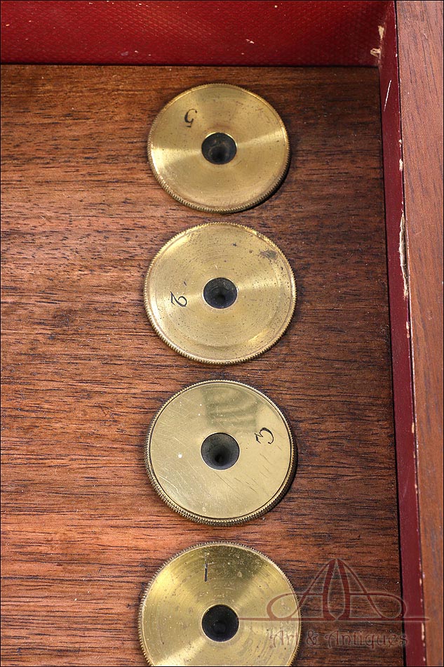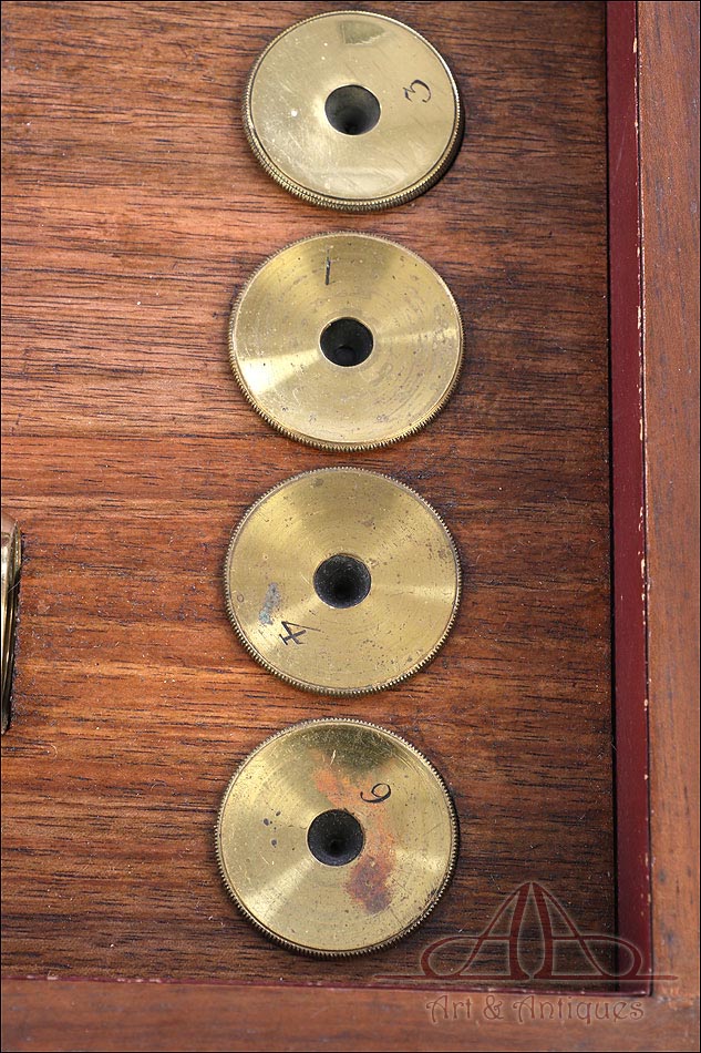 Este singular instrumento va acompañado de seis lentes, marcadas con números del 1 al 6. El microscopio no ha sido testado en las condiciones ideales (en una habitación oscura con un rayo de sol ajustado al aparato). La lente nº 3 tiene el cristal desplazado, pero aun así es el original y se conserva. En cuanto a la lente nº 6, no se ha podido confirmar la presencia o ausencia del vidrio de aumento. Las demás están bien. El estuche es muy antiguo y es posible que se trate del original, aunque no se puede certificar al cien por cien. Se trata de un bello maletín de madera de caoba maciza, con un soporte interior para los elementos realizado posteriormente a medida. Lleva delicadas uniones en cola de milano, asa y cerradura originales.
