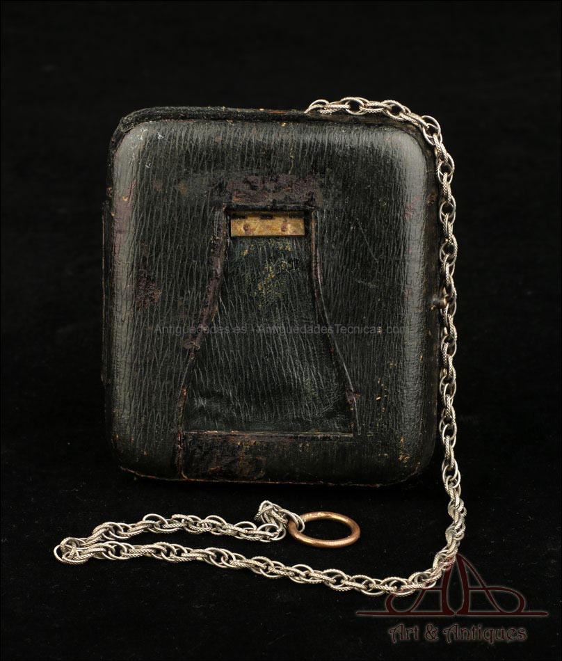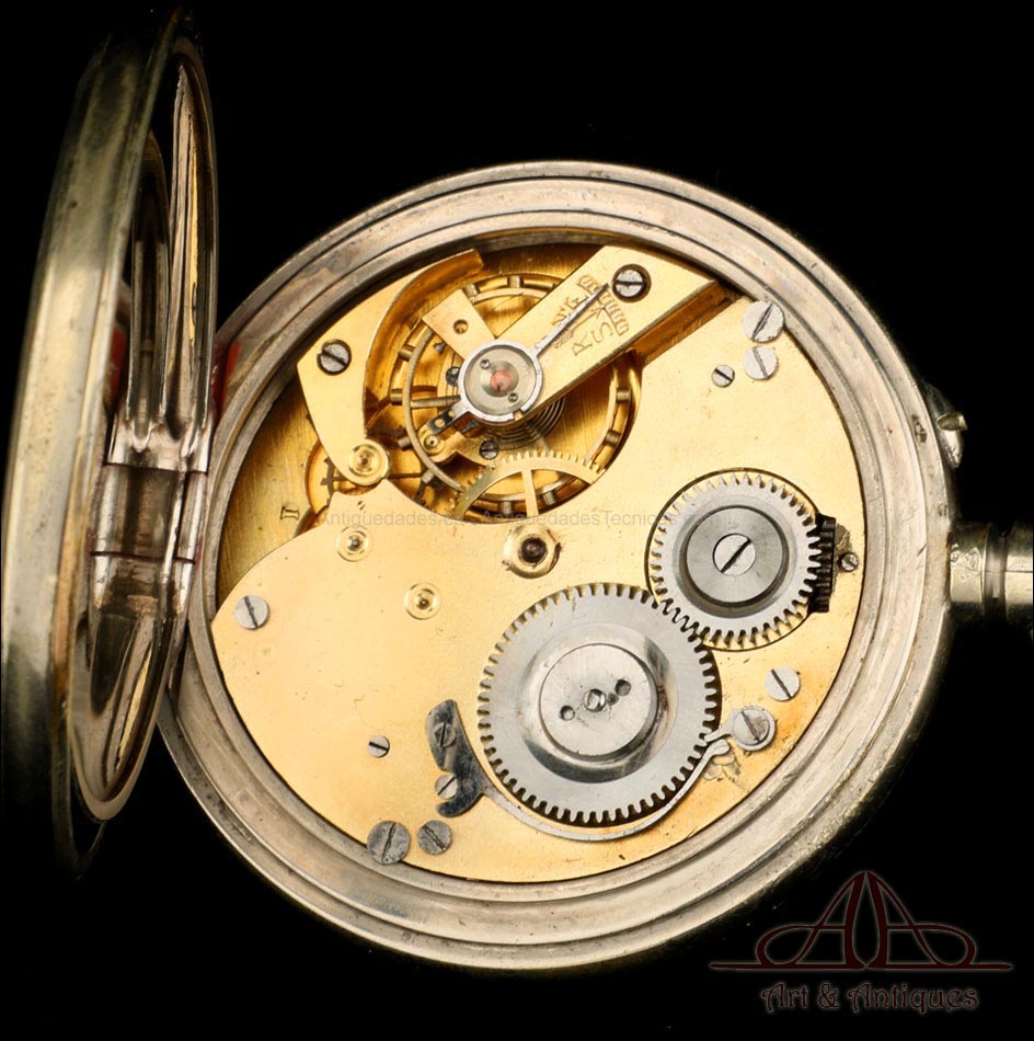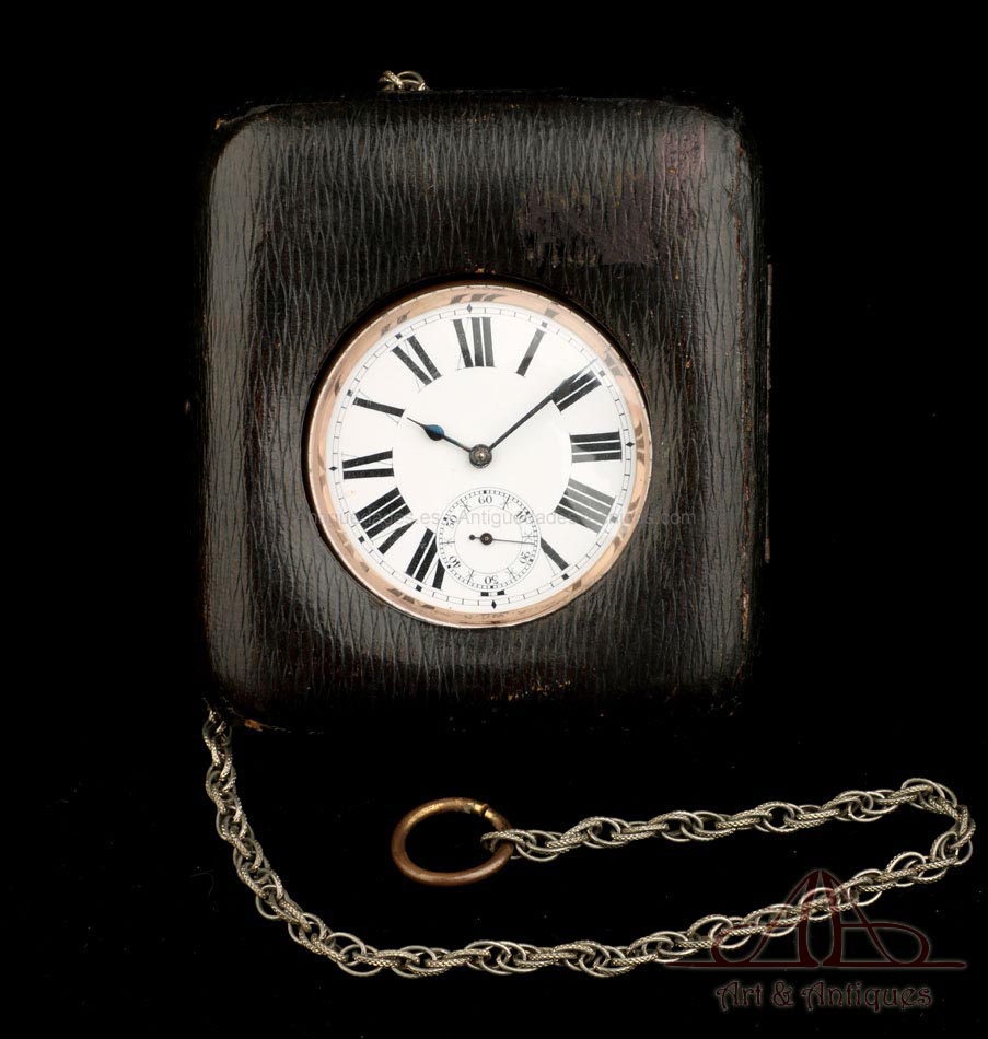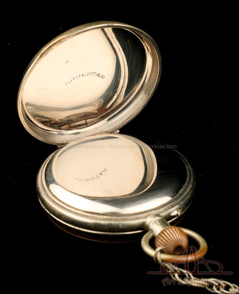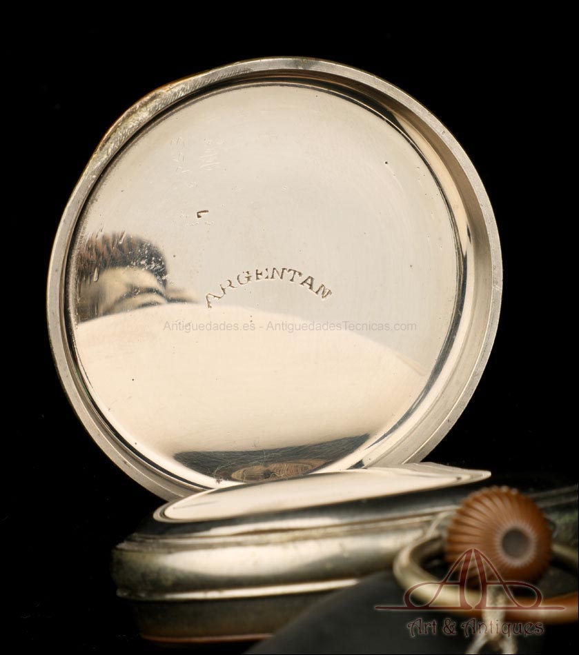 Antiguo reloj de bolsillo de 65 mm de diámetro fabricado en Francia circa 1900, en buen estado y funcionando bien. El reloj incluye la cadena original y se presenta con su estuche de guardado. El estuche tiene la peculiaridad de convertirse en soporte, permitiendo utilizar el reloj como modelo de sobremesa. Para ello, en origen contaba con una pata plegable trasera (actualmente desaparecida, pero fácil de reponer). La caja del reloj es más grande de lo habitual en un modelo de bolsillo. Está fabricada en metal plateado y no lleva decoración. En el interior de la tapa trasera encontramos la palabra ARGENTAN, que garantiza que el metal lleva un acabado de plata auténtica. La hermosa esfera es blanca, con grandes números romanos negros y agujas rectas. Está rodeada por una fina corona dorada. El estuche, por su parte, está forrado en símil de piel negra en excelente estado de conservación.