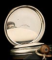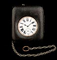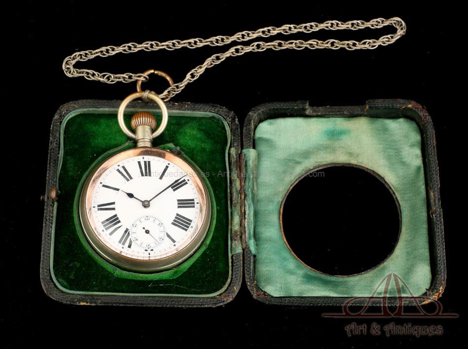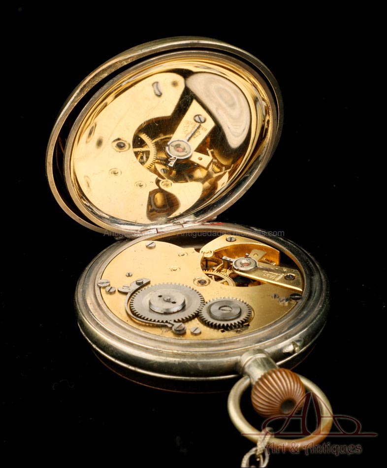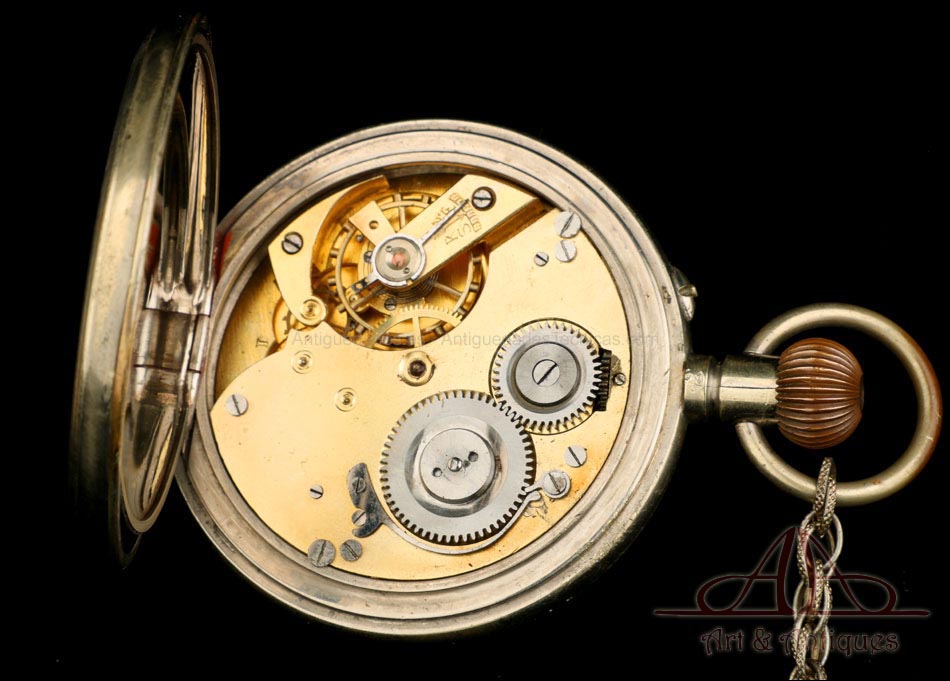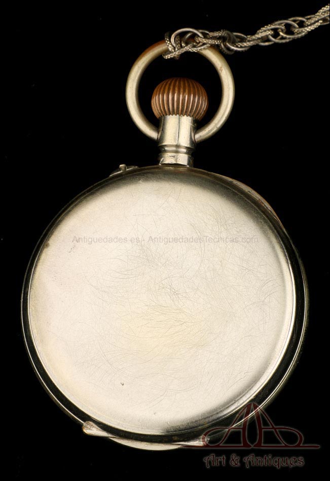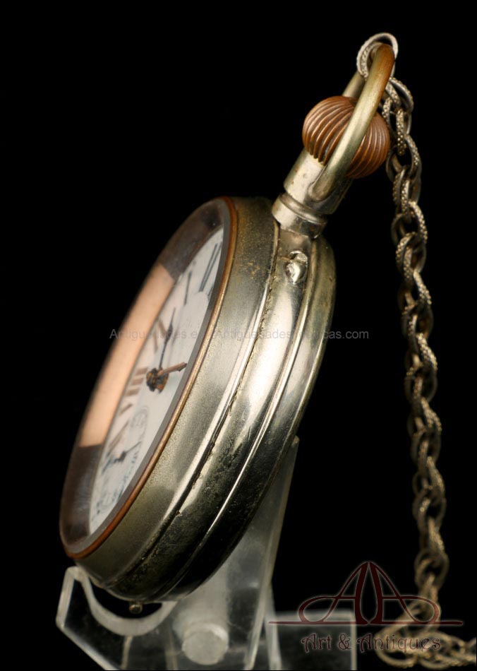 Antiguo reloj de bolsillo de 65 mm de diámetro fabricado en Francia circa 1900, en buen estado y funcionando bien. El reloj incluye la cadena original y se presenta con su estuche de guardado. El estuche tiene la peculiaridad de convertirse en soporte, permitiendo utilizar el reloj como modelo de sobremesa. Para ello, en origen contaba con una pata plegable trasera (actualmente desaparecida, pero fácil de reponer). La caja del reloj es más grande de lo habitual en un modelo de bolsillo. Está fabricada en metal plateado y no lleva decoración. En el interior de la tapa trasera encontramos la palabra ARGENTAN, que garantiza que el metal lleva un acabado de plata auténtica. La hermosa esfera es blanca, con grandes números romanos negros y agujas rectas. Está rodeada por una fina corona dorada. El estuche, por su parte, está forrado en símil de piel negra en excelente estado de conservación.
