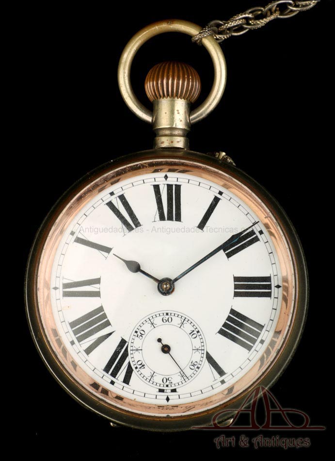 Este original y antiguo reloj de bolsillo de 65 mm de diámetro destacará en una buena colección, sobre un mueble o como parte de una elegante indumentaria.