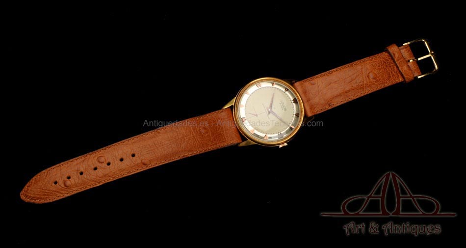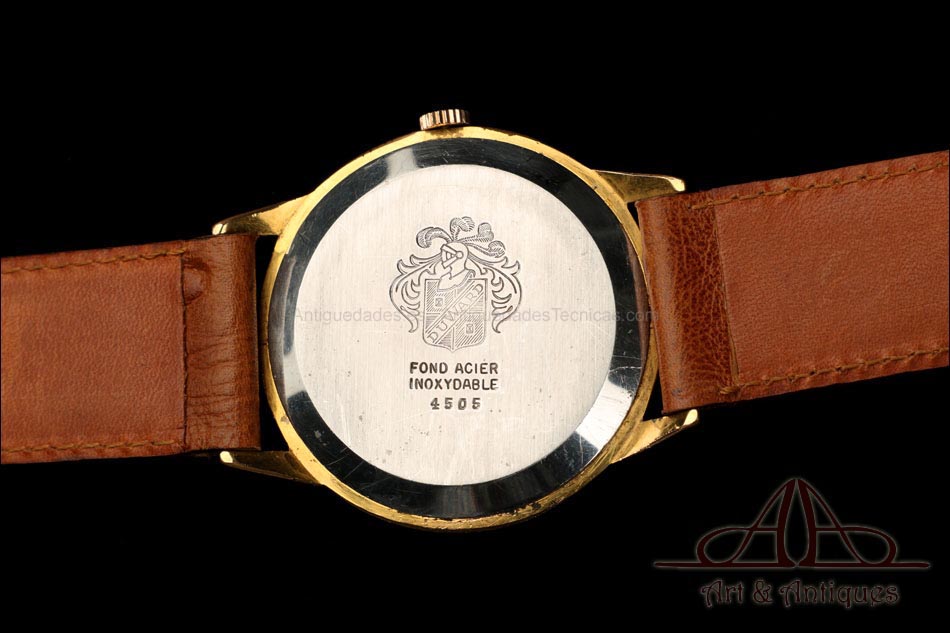Precioso reloj clásico de pulsera para caballero Duward de 21 rubís, con caja dorada y tapa de acero. Fabricado en España en los años 60, está muy bien conservado y funciona perfectamente. Se trata de un reloj de gran elegancia, con un atractivo y atemporal diseño que combinará a la perfección con cualquier estilo. La esfera es muy sencilla y lleva marcadores de color cobre en las horas, con agujas rectas doradas y segundero inferior. El nombre de DUWARD aparece impreso en la posición de las doce. La tapa trasera lleva grabada la inscripción FOND ACIER INOXIDABLE y el número de serie 4505, bajo el escudo de la marca. La maquinaria también está firmada por el fabricante y es de cuerda manual. El reloj se presenta con una correa nueva de avestruz de color castaño claro.