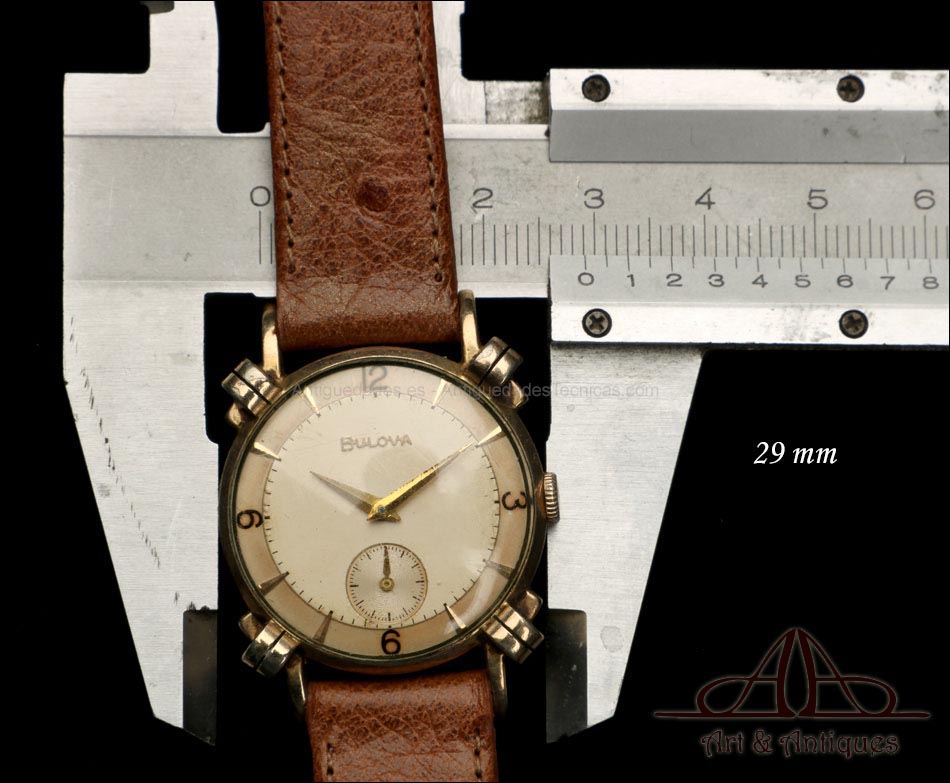 Estiloso reloj de pulsera clásico Bulova para caballero, fabricado en Suiza en 1954y chapado en oro de 10K. Este precioso reloj funciona perfectamente y está bien conservado, siendo un artículo de diseño elegante y atemporal. Lleva maquinaria con cuerda manual en perfecto estado de funcionamiento. La esfera es de color beige en dos tonos, con anillo horario y números dorados en las 12, las 3, las 6 y las 9. Incluye un segundero en la posición de las 6 y agujas rectas doradas. La caja chapada en oro de 10K muestra un curioso y atractivo diseño de estilo industrial. La tapa trasera lleva la inscripción 10K ROLLED GOLD PLATE - BULOVA - L4 y el número de serie 8550600. El nombre de la marca aparece también grabado en la cara interna de la tapa trasera y en la maquinaria.