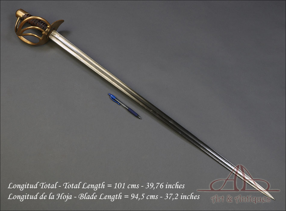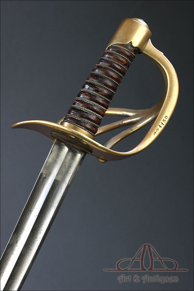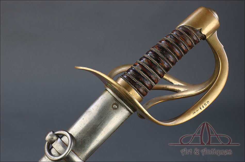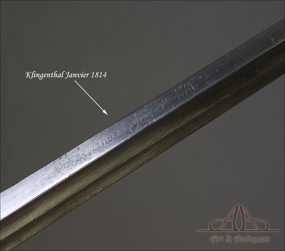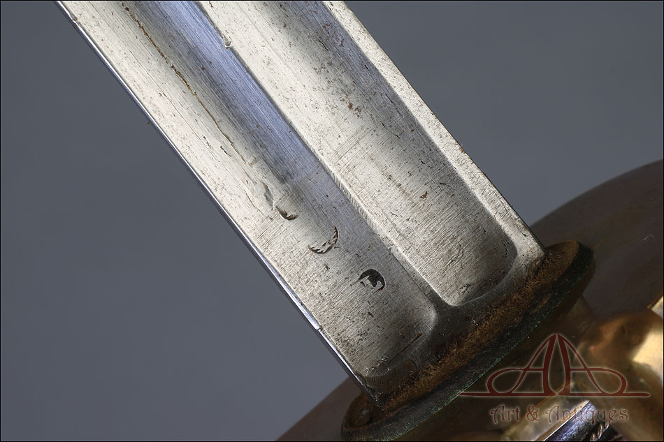 Muy rara y antigua espada napoleónica para caballería de coraceros modelo AN XIII fabricada en Francia en 1814, durante el Primer Imperio Francés. Esta hermosa arma lleva hoja de acero en muy buen estado. La hoja lleva una inscripción grabada a mano, que a pesar de estar bastante desgastada permanece legible: “Klingenthal, Janvier 1814”. En la parte superior de la hoja, cerca de la empuñadura encontramos varios sellos y contrastes grabados en el metal. La empuñadura es de latón, con guardamano dividido en cuatro. hermosos gavilanes curvos. El principal lleva grabado un número de serie y dos contrastes. El puño es de madera oscura y conserva el torzal original. La vaina de acero está también en muy buen estado: en el batiente podemos ver otro número grabado, 159 A.