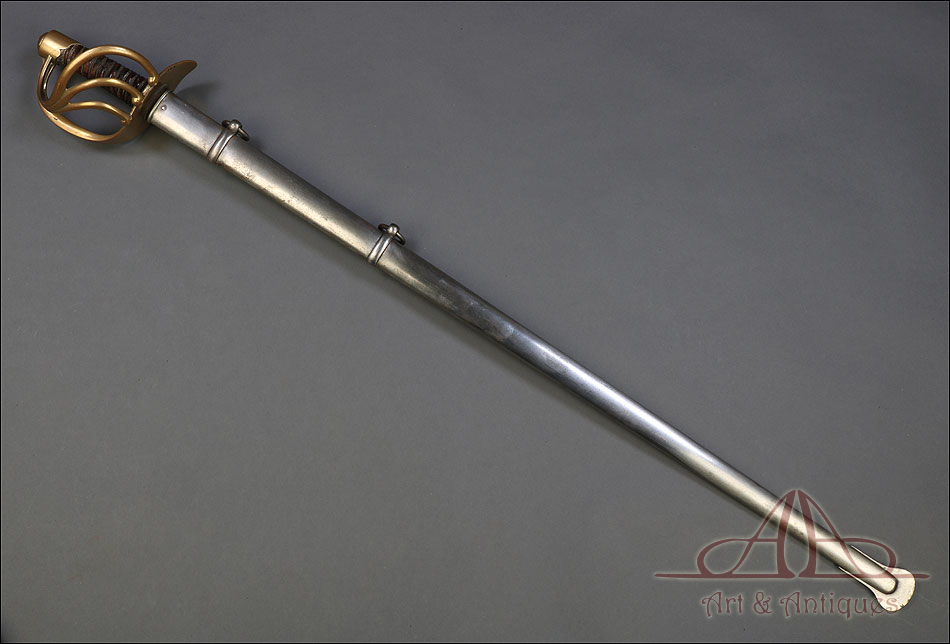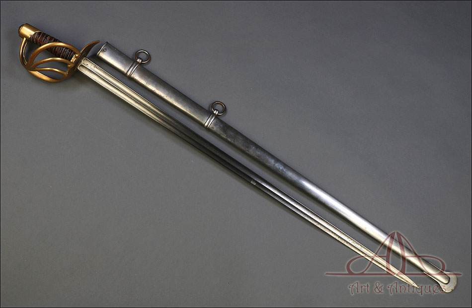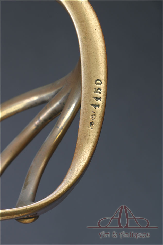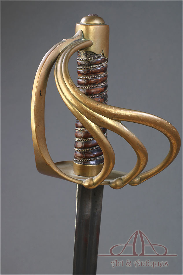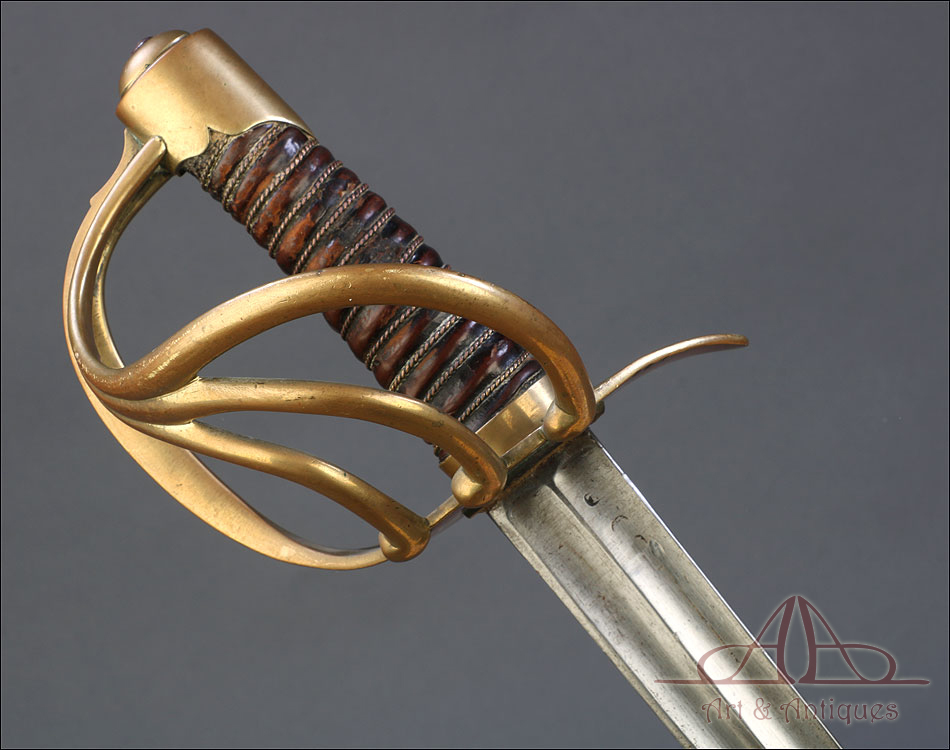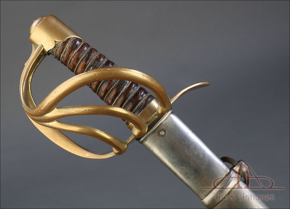 Muy rara y antigua espada napoleónica para caballería de coraceros modelo AN XIII fabricada en Francia en 1814, durante el Primer Imperio Francés. Esta hermosa arma lleva hoja de acero en muy buen estado. La hoja lleva una inscripción grabada a mano, que a pesar de estar bastante desgastada permanece legible: “Klingenthal, Janvier 1814”. En la parte superior de la hoja, cerca de la empuñadura encontramos varios sellos y contrastes grabados en el metal. La empuñadura es de latón, con guardamano dividido en cuatro. hermosos gavilanes curvos. El principal lleva grabado un número de serie y dos contrastes. El puño es de madera oscura y conserva el torzal original. La vaina de acero está también en muy buen estado: en el batiente podemos ver otro número grabado, 159 A.