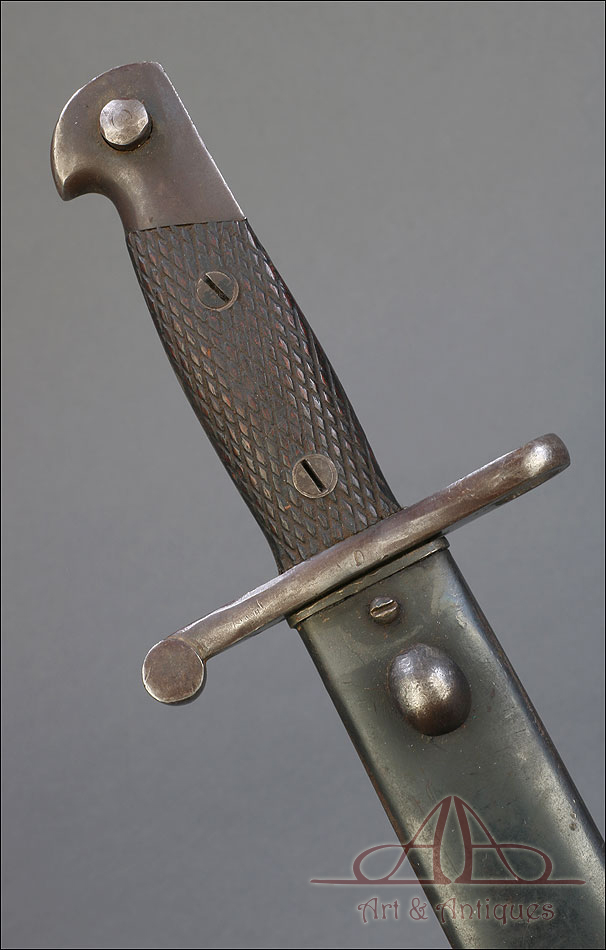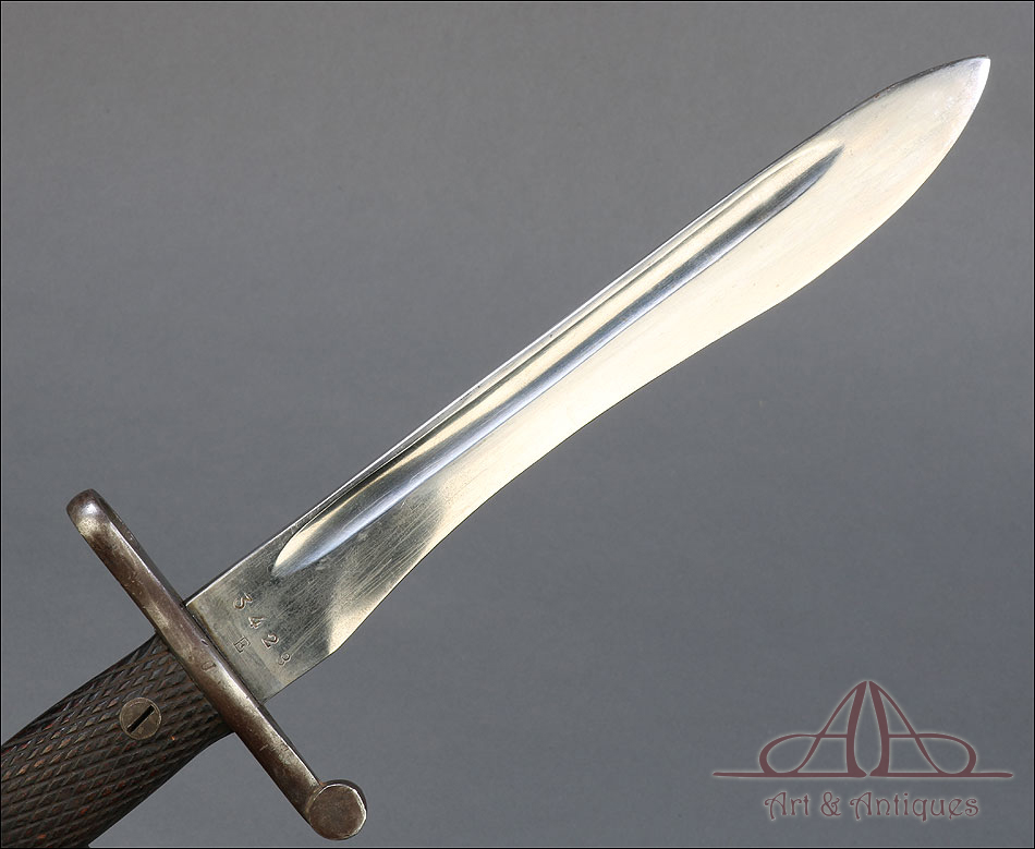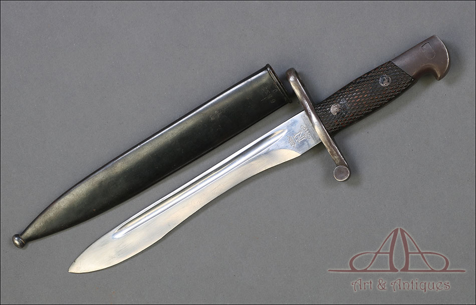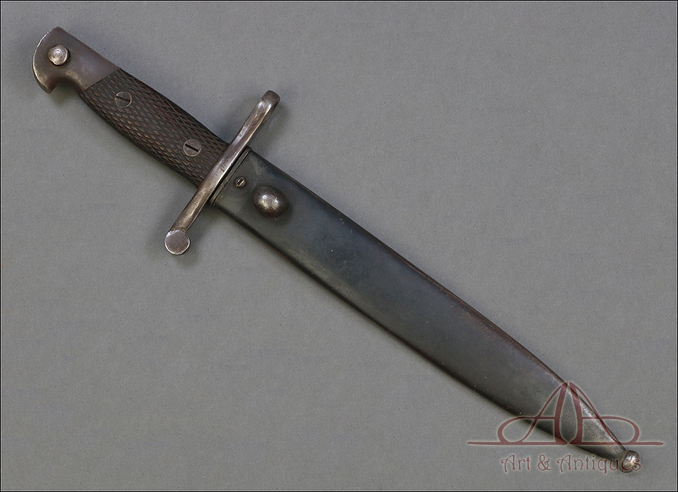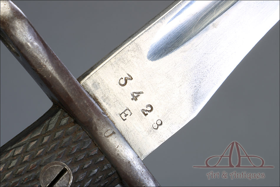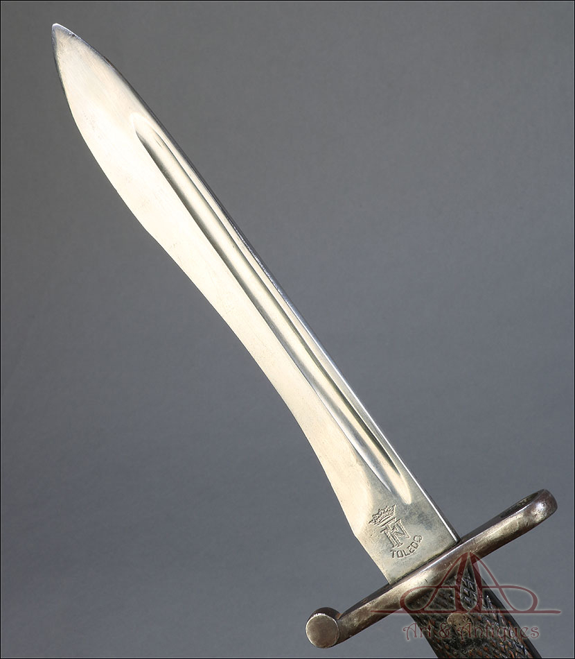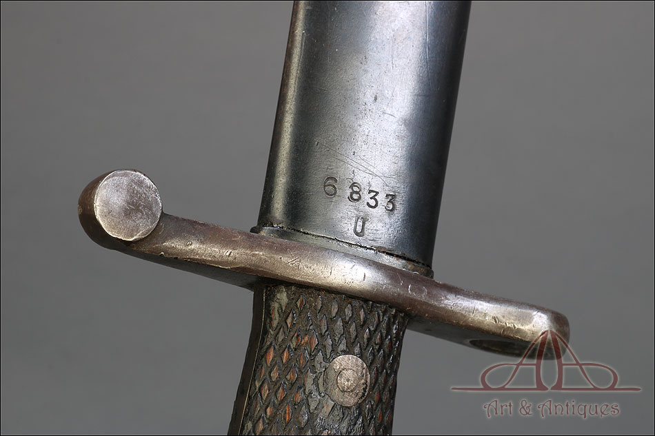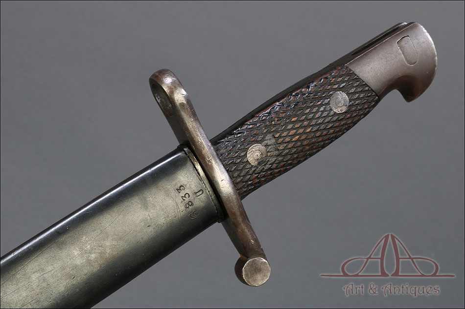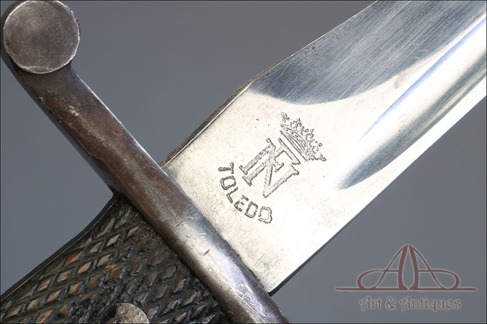 Antigua bayoneta española modelo 1941, forjada en España en la Real Fábrica de Armas de Toledo. Esta pieza tan singular se presenta completa, con todas sus partes originales y su vaina de acero. Además, está en muy buenas condiciones; la hoja de acero se muestra lisa y pulida, sin señales de óxido o desgaste, mientras que la empuñadura también está en excelente estado de conservación. El puño lleva cachas de madera tallada con motivo de rombos, destinado a mejorar el agarre, y remachadas a la base. La cruz incluye un gavilán curvo y otro con el orificio para introducir el cañón del arma. En la hoja, junto a la cruz podemos ver el sello de la Real Fábrica de Armas de Toledo y el número 3428 E. La vaina de acero está bien conservada y lleva su propio número de serie, junto a la boquilla: 6833 U.