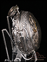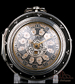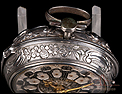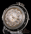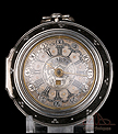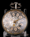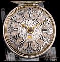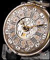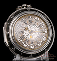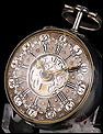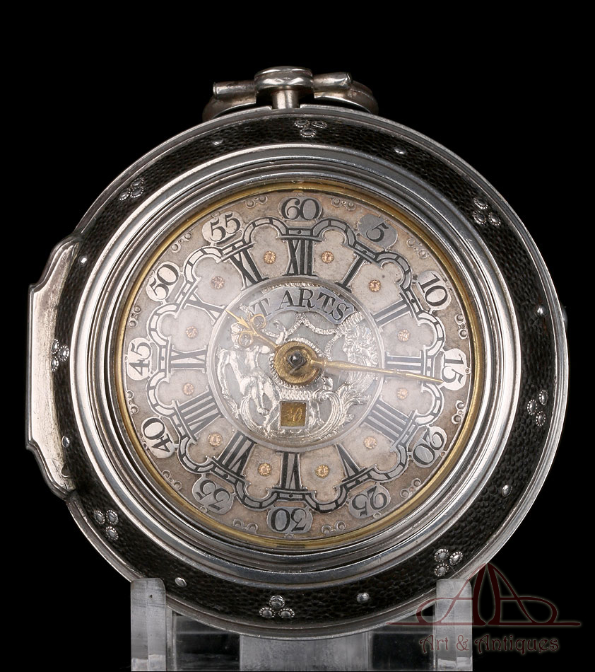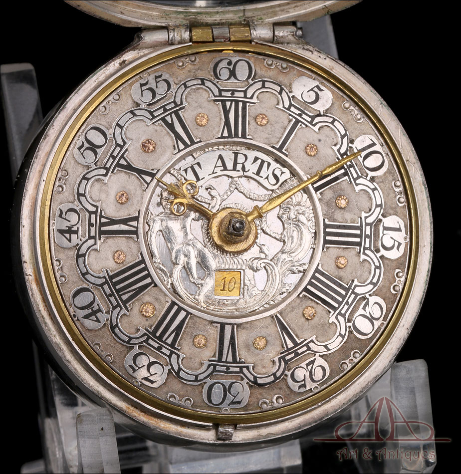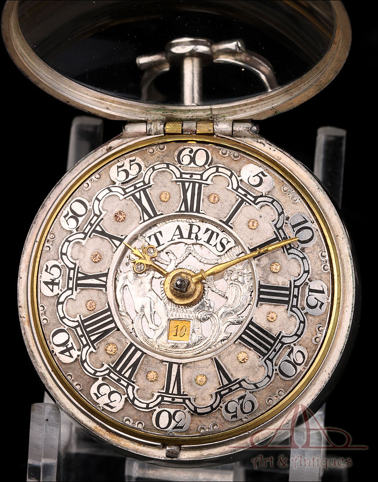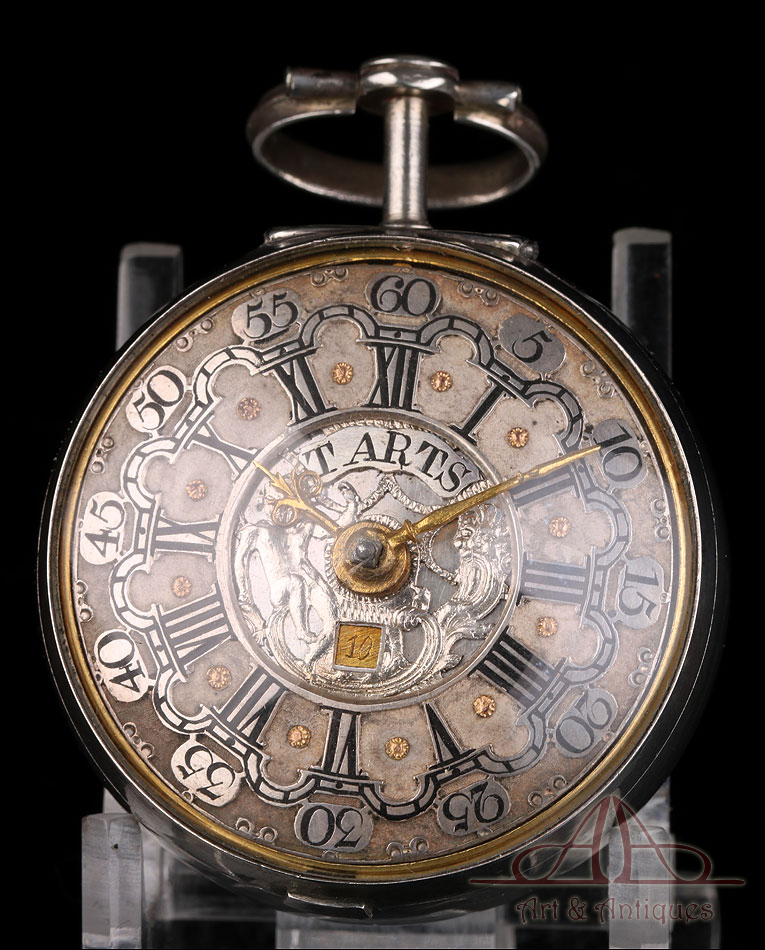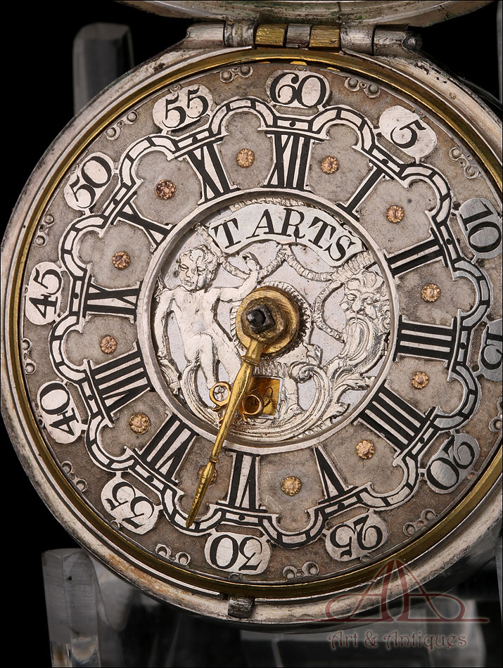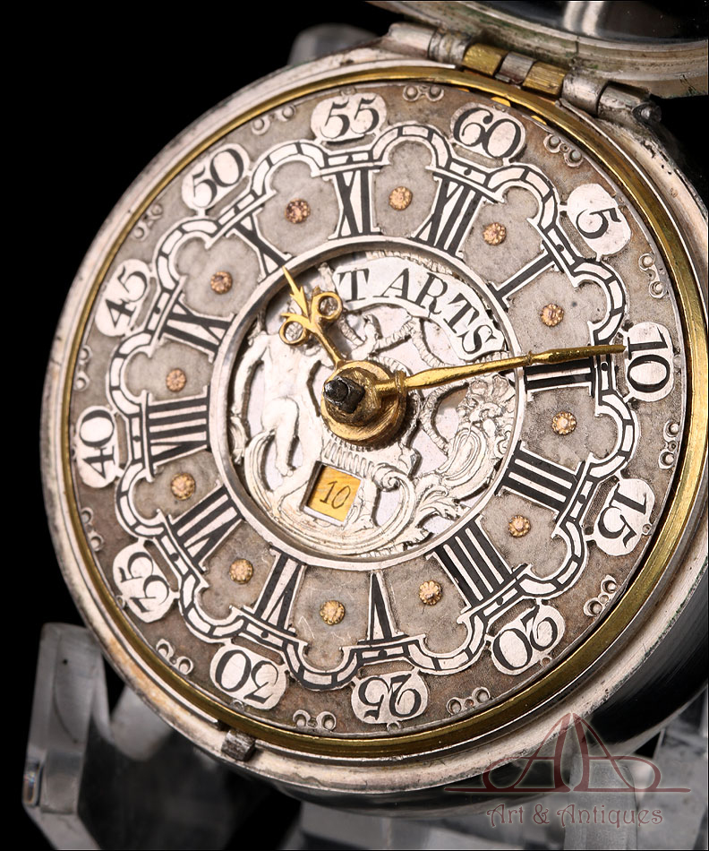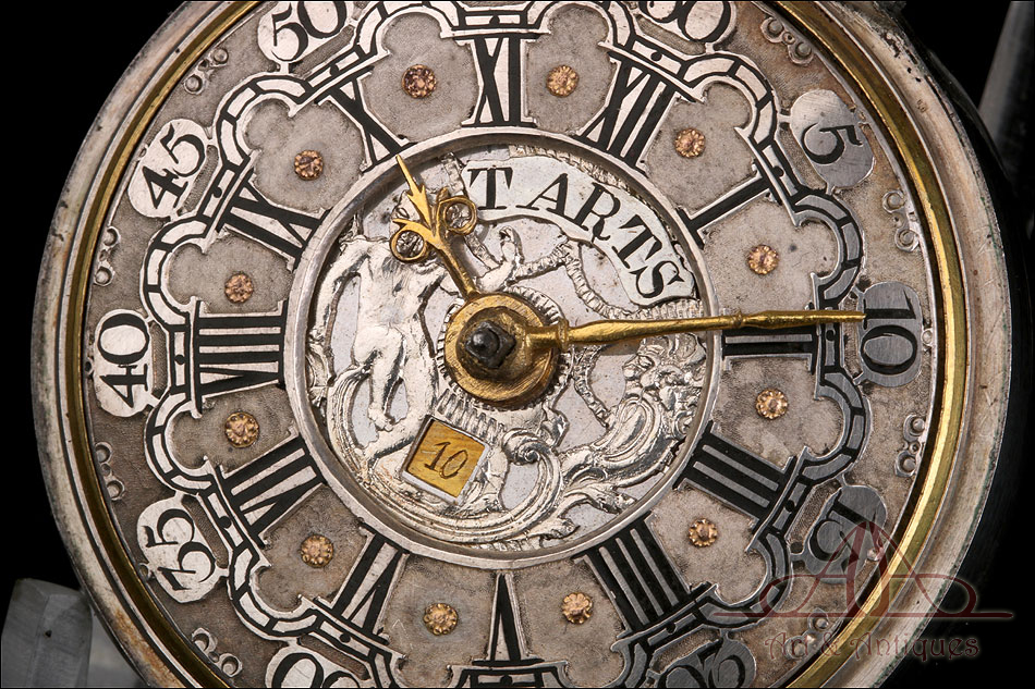 El reloj lleva esfera plateada champlevé con números romanos, marcadores de media hora con roseta dorada, circunferencia de minutos decorada con arcos (a la manera holandesa) y números arábigos árabes colocados cada cinco minutos alrededor de la esfera. Hay una ventana sobre las seis donde aparece el día, agujas doradas tipo Beetle & Poker y el nombre TARTS grabado en el centro, correspondiente al fabricante. En el centro podemos ver un querubín y una máscara grotesca grabados a mano.