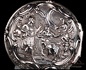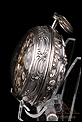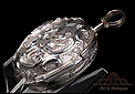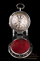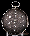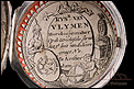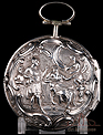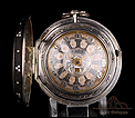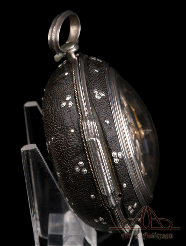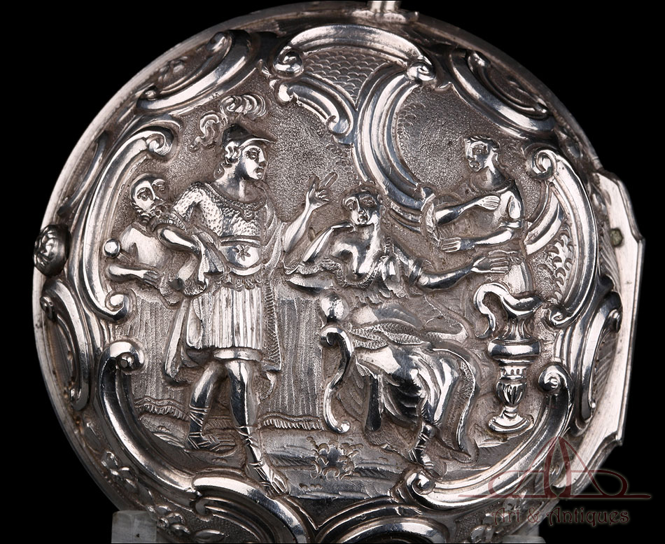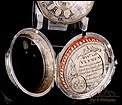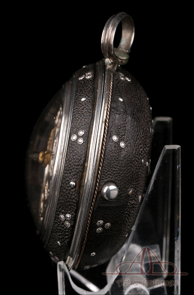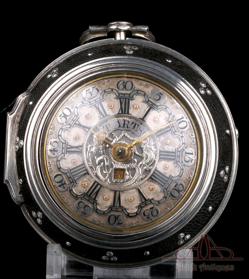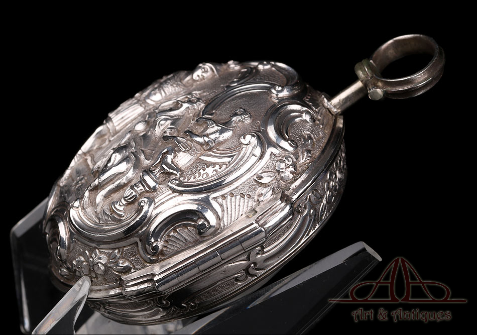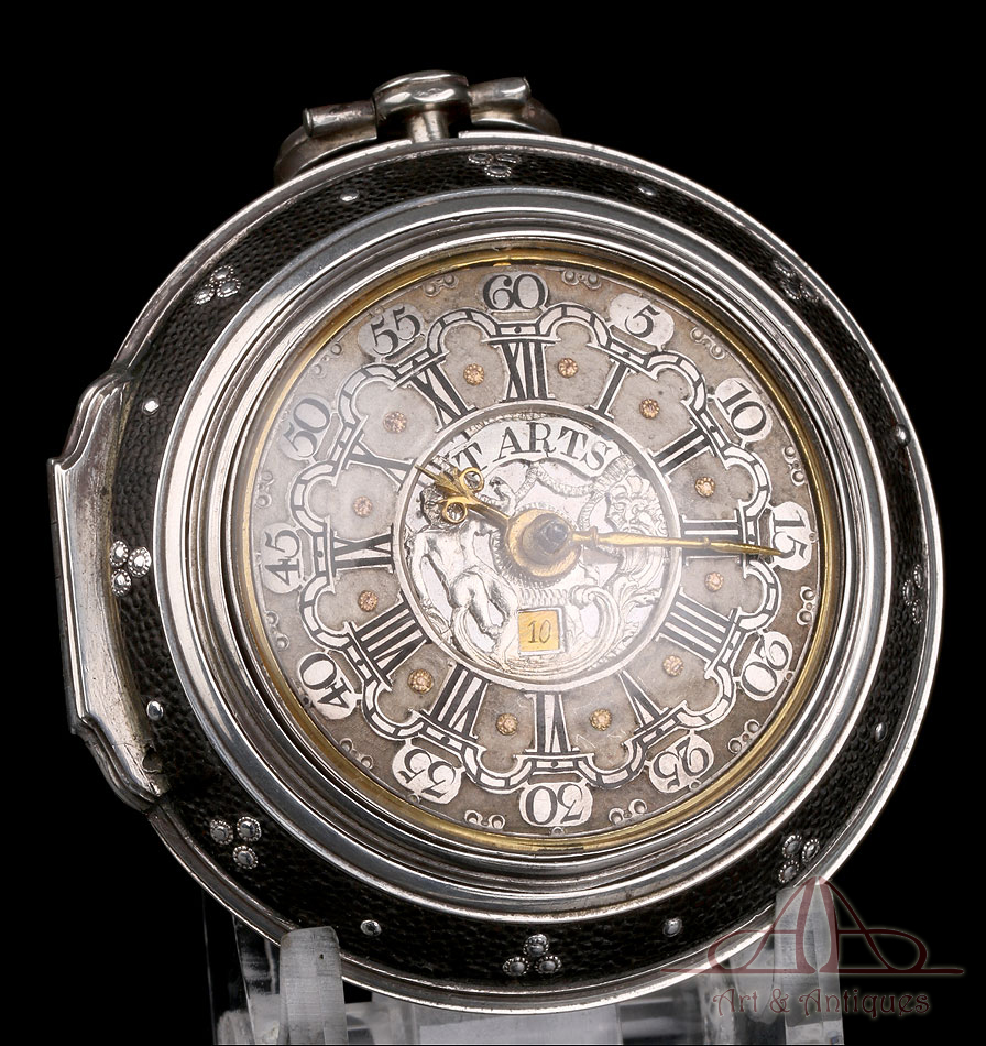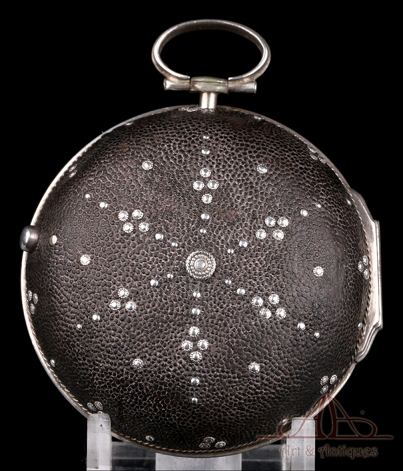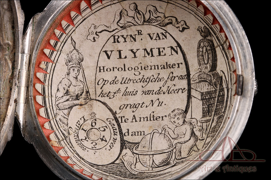 Es un modelo de triple caja, con caja exterior cubierta de piel de pescado (creo que raya) y apliques de metal estrellados. La caja exterior se puede retirar para descubrir la segunda caja, fabricada en plata maciza y con un relieve realizado a mano que representa una escena mitológica. La escena está rodeada por volutas en forma de C. El interior de la tapa trasera contiene una etiqueta en holandés donde se menciona a Ryn (Reiner) Van Vlymen, relojero de Ámsterdam. La tercera caja, fabricada en plata de ley pulida, lleva contrastes ingleses en el interior de la tapa trasera: un leopardo con una corona (contraste de la plata londinense anterior a 1822), un león (plata de ley) y una letra d, correspondiente al año 1779. Las iniciales JC corresponden al fabricante de la caja.