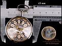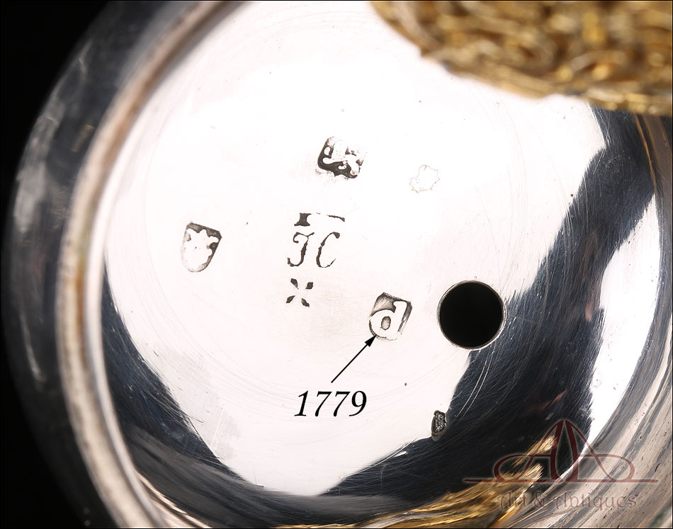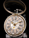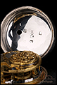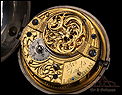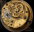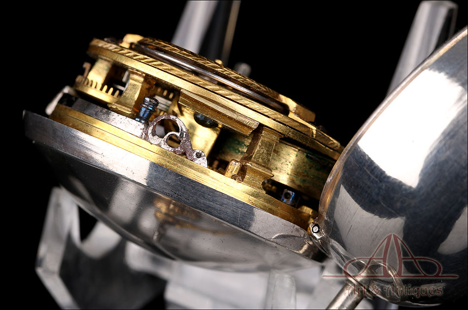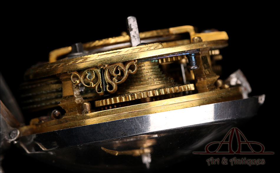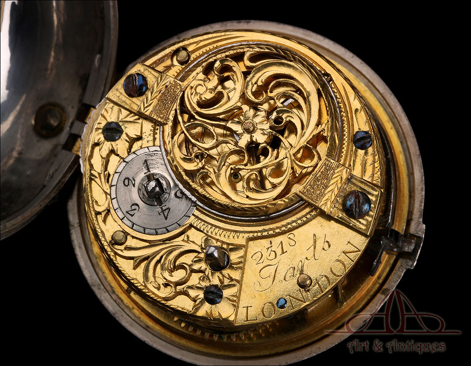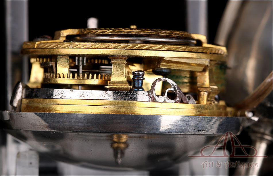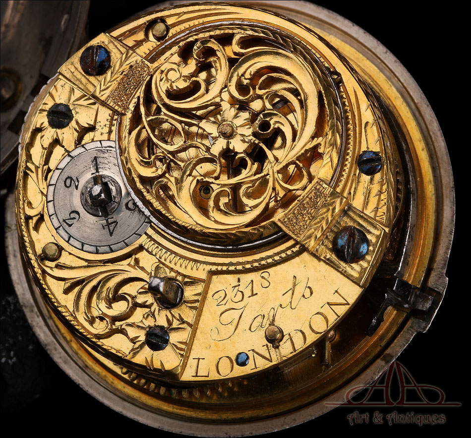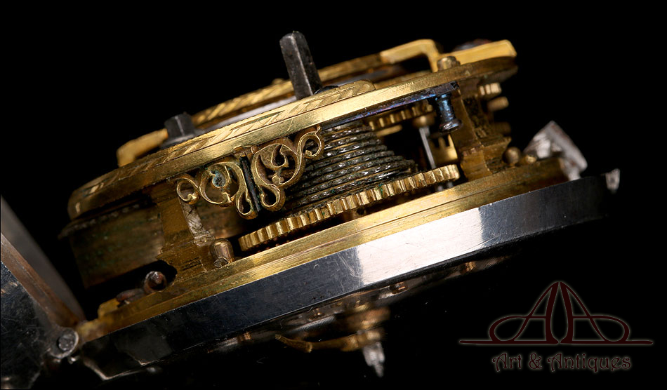 La maquinaria del reloj es de tipo catalino, con pilares de balaustres cuadrados, decoración con motivos vegetales en celosía foliada y puente perforado, grabado con motivos de hojas de acanto rizadas. En la placa posterior podemos ver el nombre del fabricante y el número de serie grabados en el metal: TARTS, London 2318. El nombre J. Tarts (John) es probablemente un seudónimo de J. Stratton (John), relojero londinense que trabajó a finales del siglo XVIII y legó su negocio a su hijo James. La marca se especializó en fabricar cajas de reloj de plata de estilo holandés.