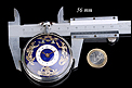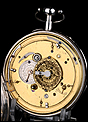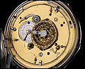 La maquinaria es original de época y se encuentra en magníficas condiciones. Está fabricada en latón dorado y es de tipo catalino, con volante Continental grabado en celosía y fijado con dos tornillos colocados en ángulo de 180g grados. El carillón de cuartos funciona con dos martillos que golpean sendos gongs de acero pavonado; el mecanismo se activa presionando el colgante del reloj.