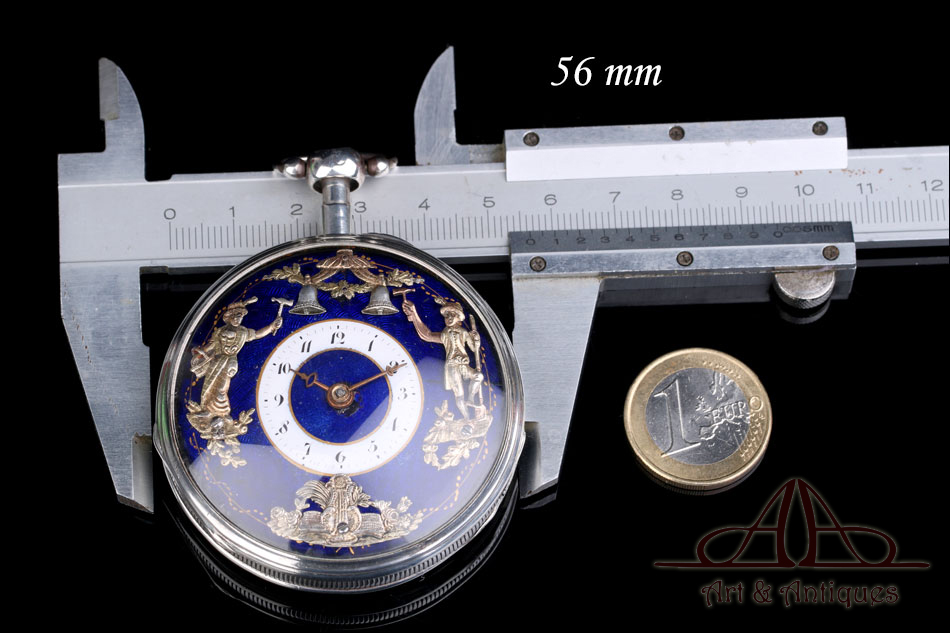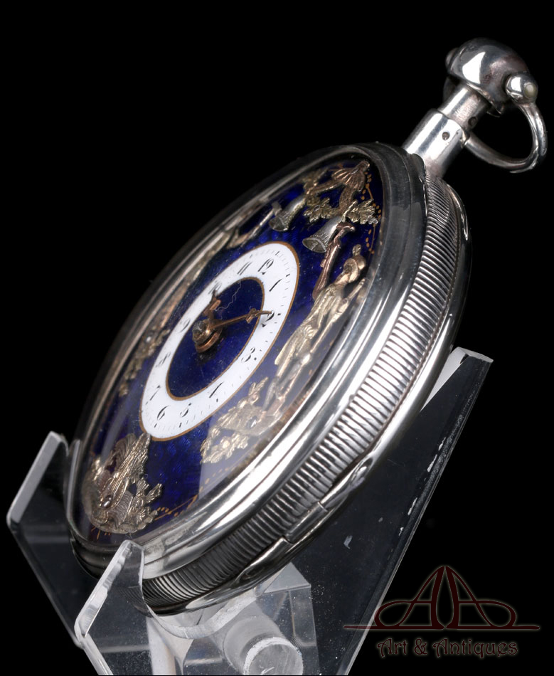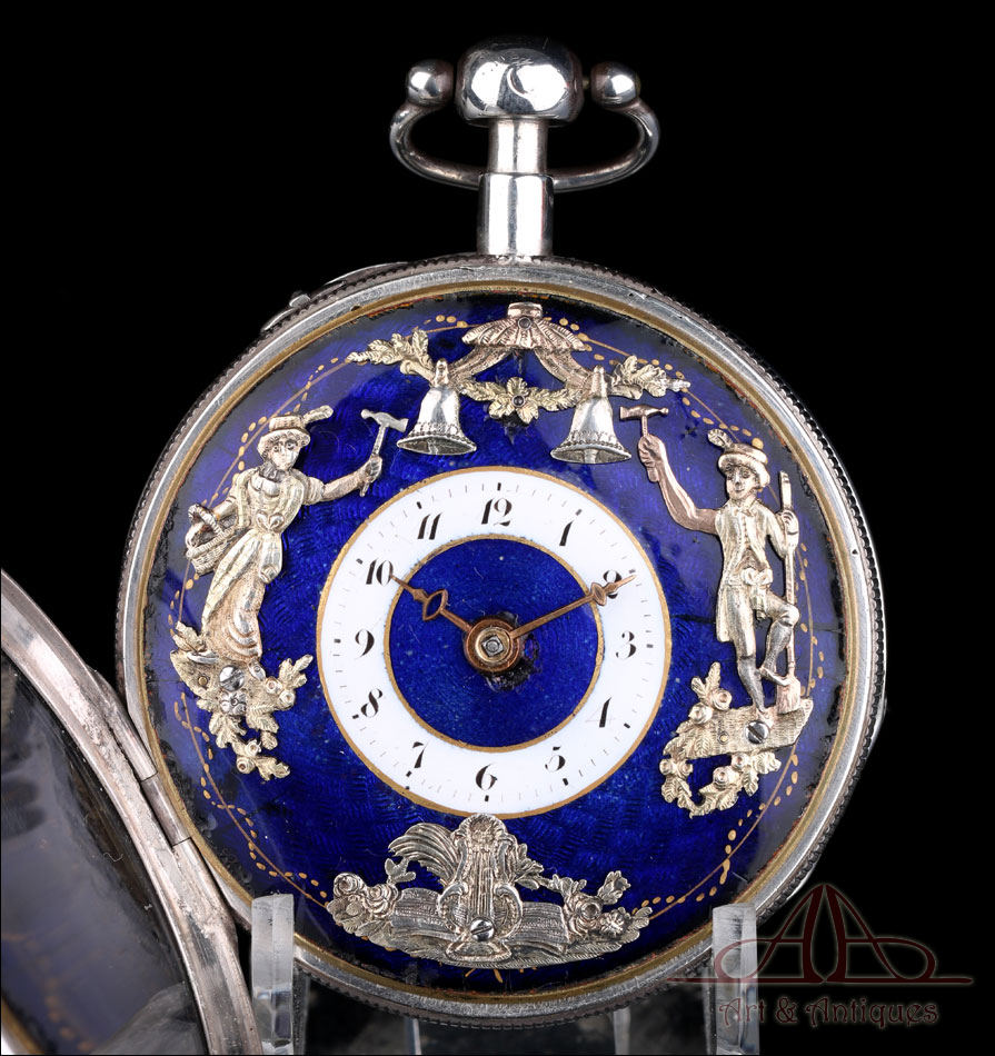 Este precioso y antiguo reloj de bolsillo de repetición de cuartos autómata es una auténtica joya, con cerca de 200 años de historia y un diseño lleno de encanto y originalidad.
