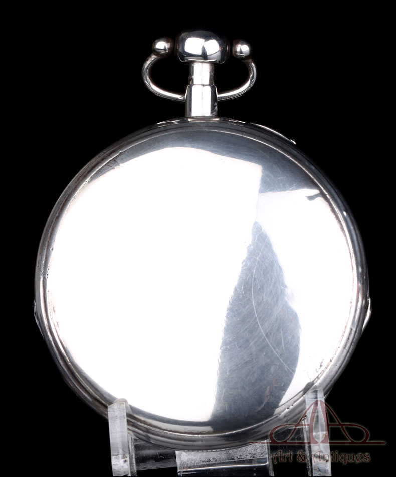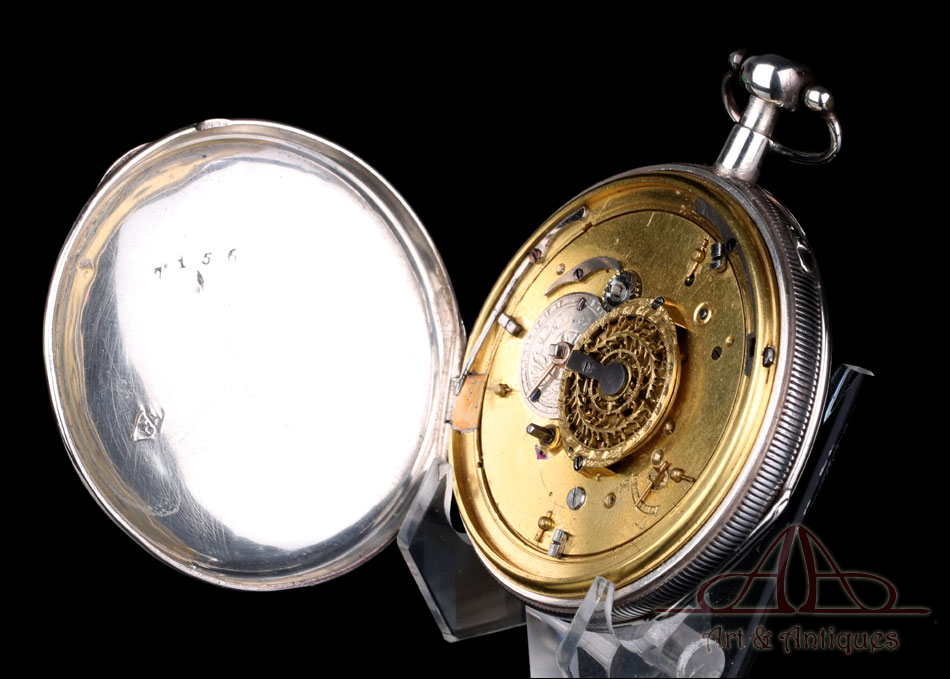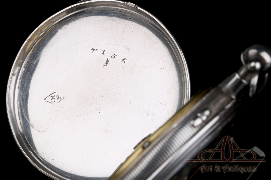 Antiguo reloj catalino de bolsillo de repetición de cuartos autómata, fabricado en Francia circa 1810 y en muy buen estado. El reloj es muy hermoso y funciona bien, tanto la sonería a cuartos como el movimiento de los autómatas de la esfera. Lleva caja de tres tapas de plata maciza, con colgante y anilla de plata o plateada. La tapa trasera es de plata pulida y lisa, con el número de serie 7156 grabado en el interior y las iniciales del fabricante, CHP.