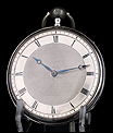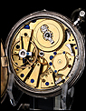 La esfera muestra un elegante diseño con anillo de numeración con números romanos negros, sobre fondo en guilloché. En el borde podemos ver la barra correspondiente a los minutos. Las agujas son de estilo Breguet antiguo y están fabricadas en acero color cobalto. En cuanto a la maquinaria, va protegida por una tapa guardapolvo en plata dorada. Esta pieza lleva una inscripción grabada a mano con detalles sobre la maquinaria, junto con la palabra Aiguilles grabada en una preciosa grafía cursiva. La maquinaria en sí es de latón dorado, con cuerda y ajuste a llave y escape de cilindro con ocho rubíes. Lleva volante de tres brazos del tipo suizo y sonería de cuartos, que funciona con dos martillos y un gong doble en espiral.