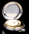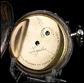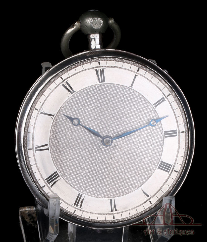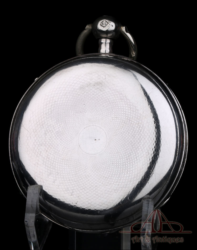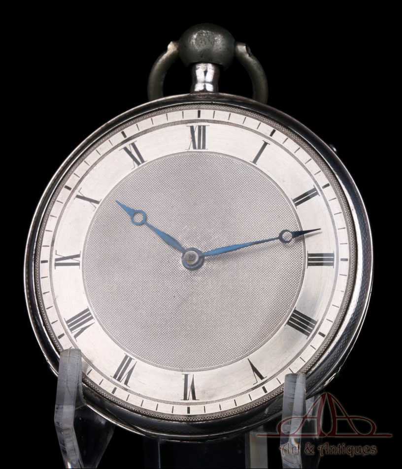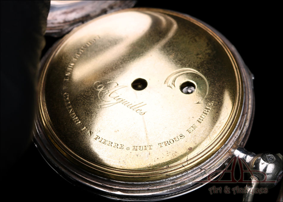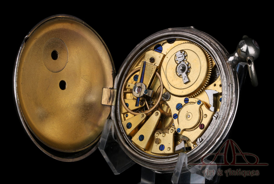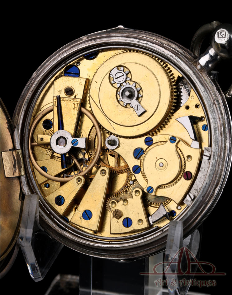Este estiloso y antiguo reloj de bolsillo de cilindro con sonería cuartos y plata maciza es un artículo lleno de elegancia y personalidad, digno de un buen coleccionista.