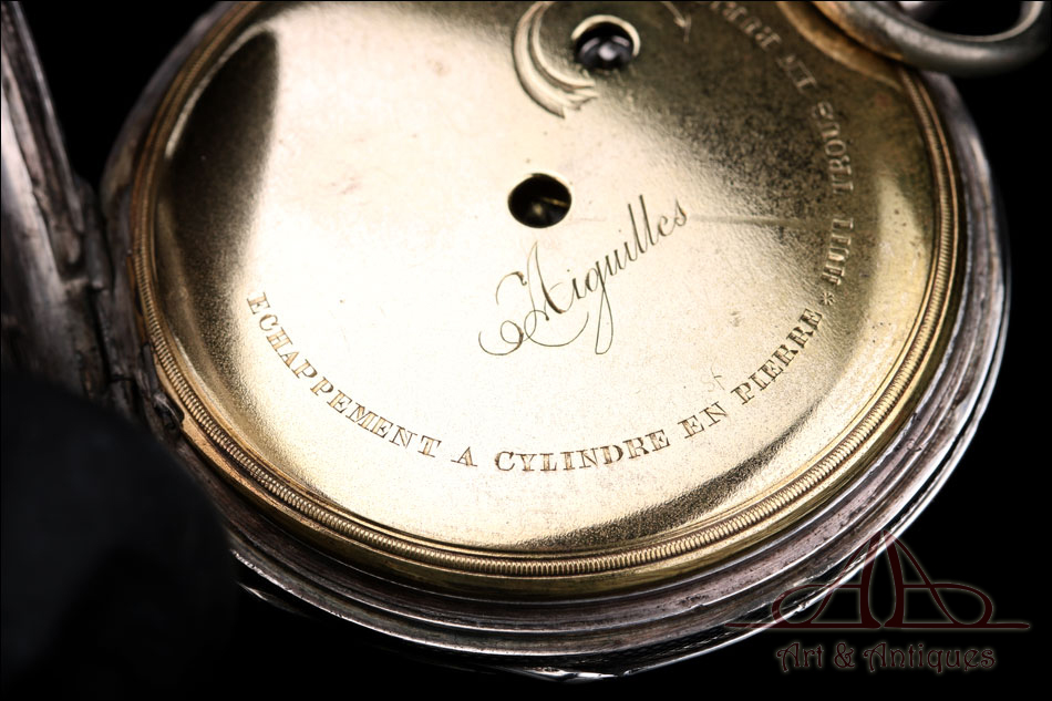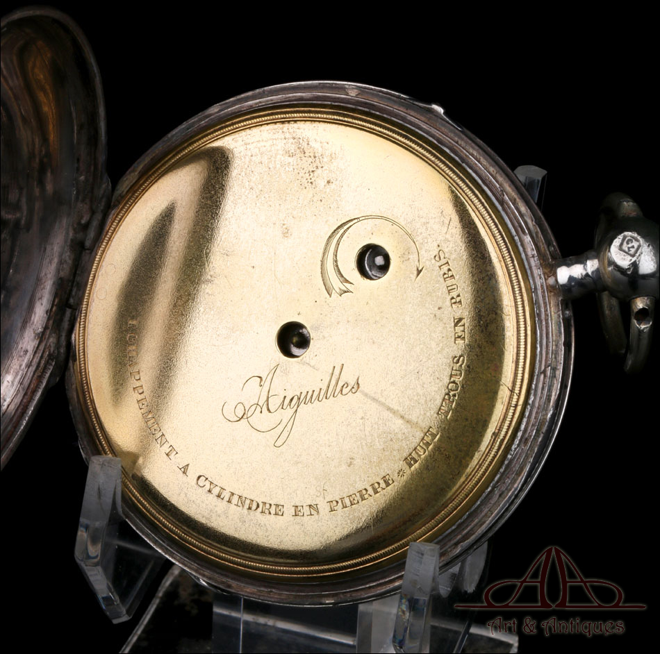 Antiguo Reloj de Bolsillo de Cilindro con Sonería a Cuartos. Plata Maciza. Francia, Circa 1820 |