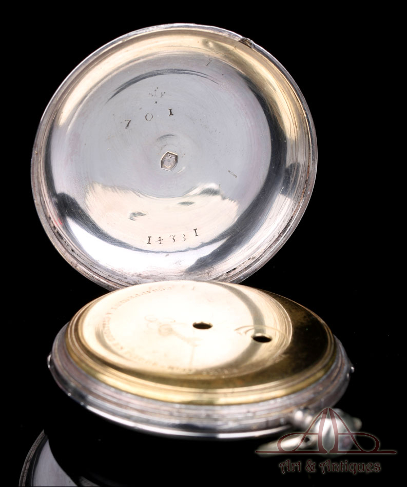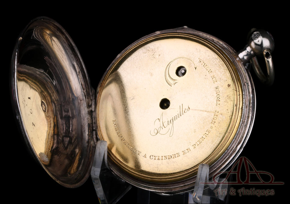 Elegante y antiguo reloj de bolsillo de cilindro con sonería a cuartos y plata maciza, procedente de Francia y fabricado circa 1820. El reloj está en muy excelentes condiciones y funciona muy bien. La caja de tres tapas está fabricada en plata maciza, con la cara delantera abierta y tapa de cristal original de época. Lleva colgante con botón de plata y anilla ovoide, y plata trasera con fondo en guilloché grano de avena en el centro. En el interior, la tapa lleva grabados los números 14331 y 701 junto con un contraste francés con el busto de un anciano. Este contraste cubre varios departamentos franceses entre los años 1819 y 1838.
