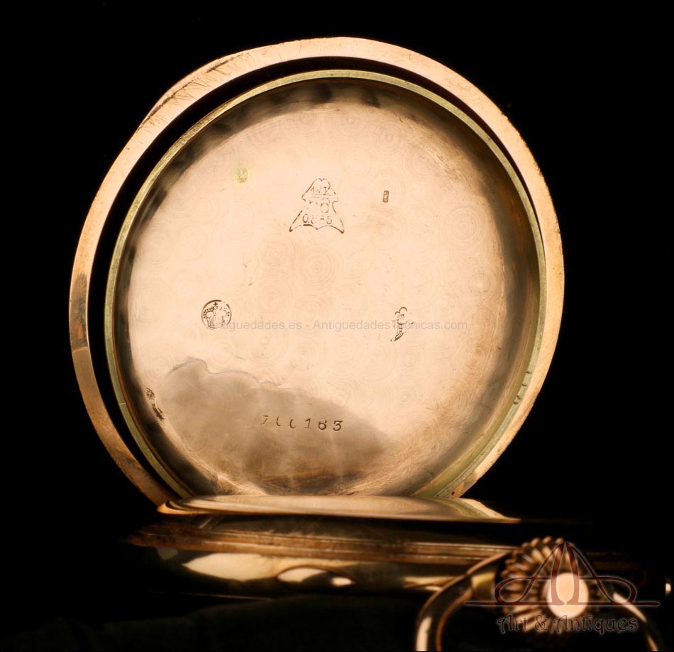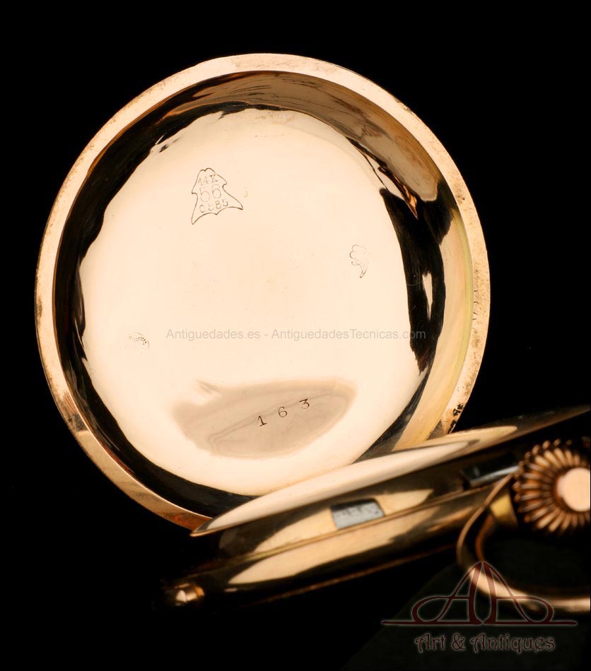 Antiguo reloj de bolsillo Invicta con sonería de minutos y cronómetro, en oro de 14K y fabricado en Suiza circa 1900. Este magnífico reloj está en excelentes condiciones, permaneciendo además en muy buen estado de funcionamiento. La caja lleva tres tapas: delantera, trasera y guardapolvo, las tres de oro de 14K. Las tapas son lisas, sin motivos grabados; el metal se muestra liso y pulido, en muy buen estado de conservación. En el interior podemos de las tres tapas podemos ver el sello donde se indican los quilates del oro (14K), así como distintos contrastes y el número de serie 700163, completo o en parte.