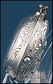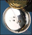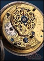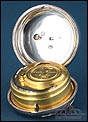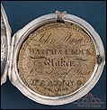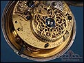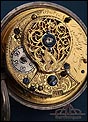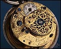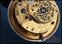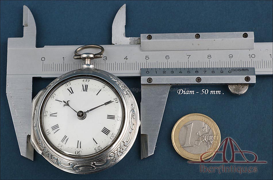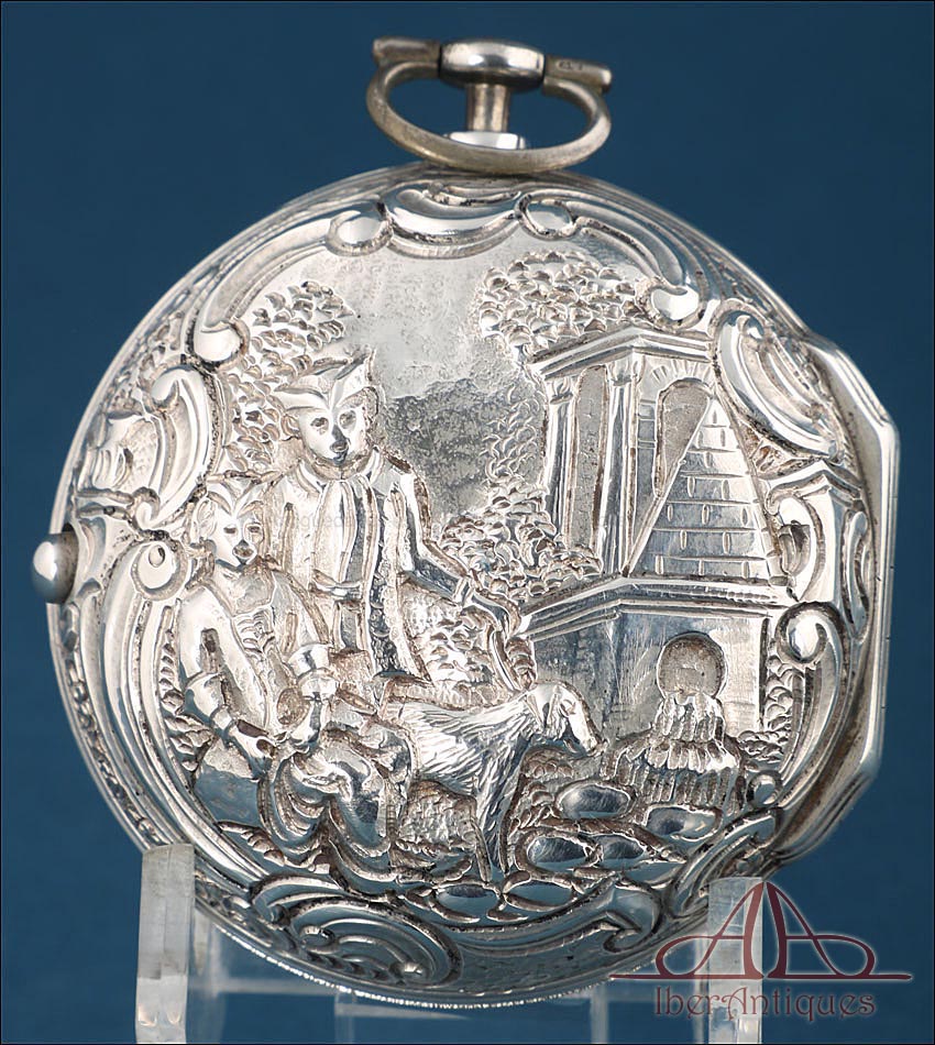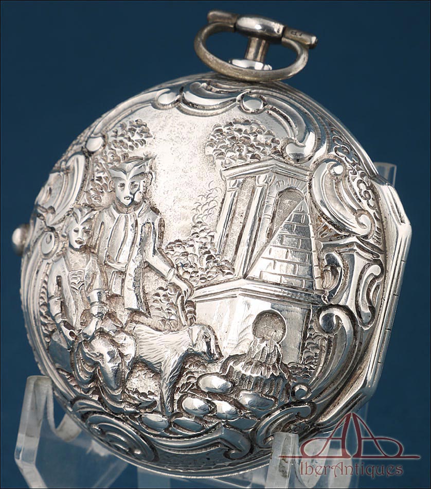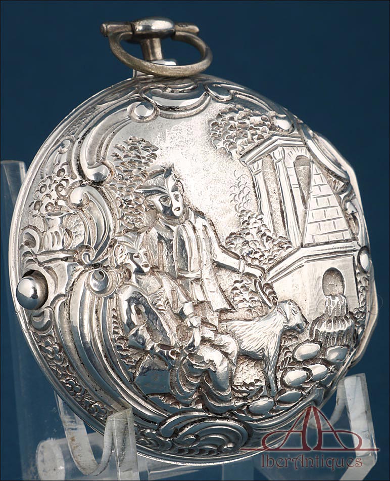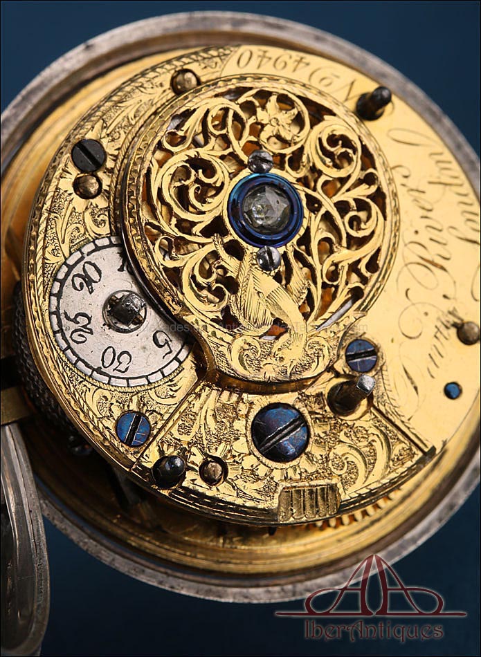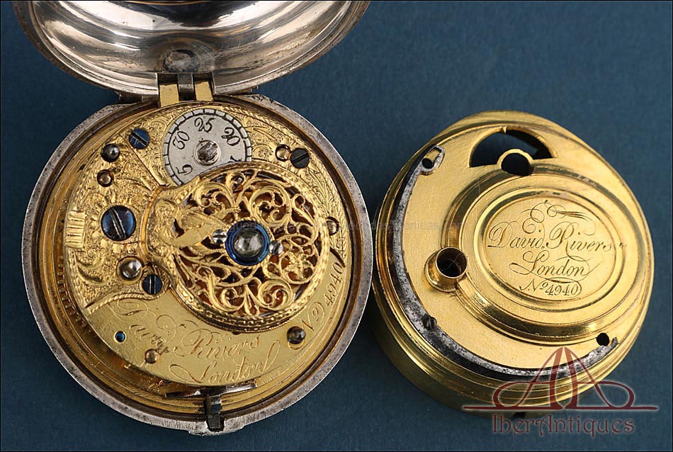 Antiguo reloj de bolsillo catalino fabricado por David Rivers, con dos cajas de plata, en Londres, Inglaterra en 1779 y en buen estado de conservación. La caja externa muestra una hermosa decoración grabada a mano, con una escena romántica en la tapa posterior que representa a una pareja con un perro en un entorno campestre, junto a una construcción de estilo clásico. La tapa delantera es de cristal, con un marco de plata grabado con volutas y flores. La esfera de porcelana blanca lleva agujas negras tipo Fassonzeiger y números romanos negros, encontrándose en buenas condiciones. La caja interna es también de plata y lleva una pequeña compuerta deslizante que oculta el agujero de la llave; en su interior podemos ver varios contrastes que indican la antigüedad, la calidad y la procedencia del reloj. La maquinaria está protegida por una tapa de latón, con el nombre del relojero inglés David Rivers y el número 4940 grabados a mano. Bajo ella, la preciosa maquinaria muestra la misma inscripción junto con la ciudad, London.