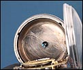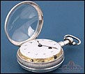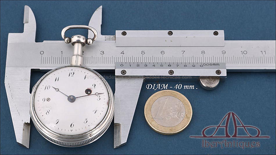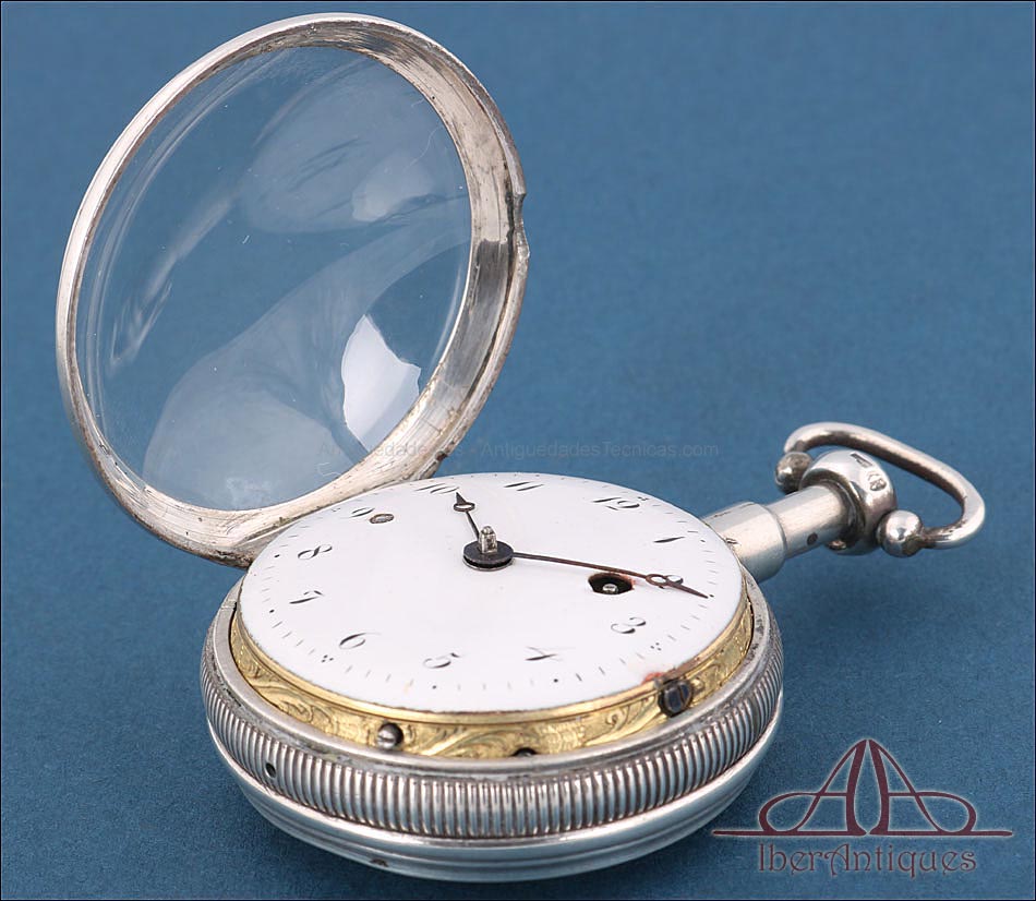 Antiguo reloj de bolsillo catalino con sonería de cuartos fabricado por Pierre Michaud en París, circa 1760. El reloj es de plata, está en estado de funcionamiento y lleva sonería sobre campanilla. La campanilla lleva una antigua reparación. Pierre Michaud, el relojero que lo fabricó, trabajó en París entre 1755 y 1771: tenemos ante nosotros una pieza muy antigua, con la firma de un artesano de prestigio. La esfera del reloj es de porcelana blanca, con finos números arábigos negros y agujas Breguet azul cobalto. La esfera y las agujas muestran algunos signos del paso del tiempo, que nos hablan sobre el pasado del reloj y no interfieren en su encanto ni su rendimiento. En el interior, la hermosa y compleja maquinaria está firmada a mano por Pr. Michaud, París, y lleva grabado también el número de serie 6249.
