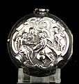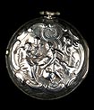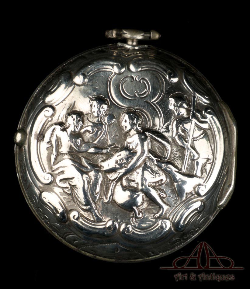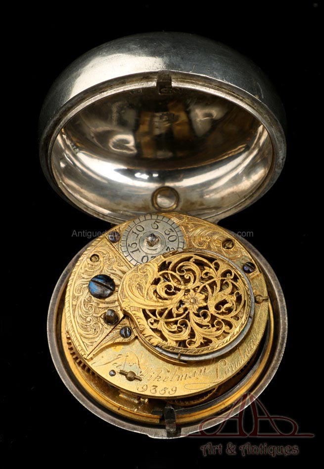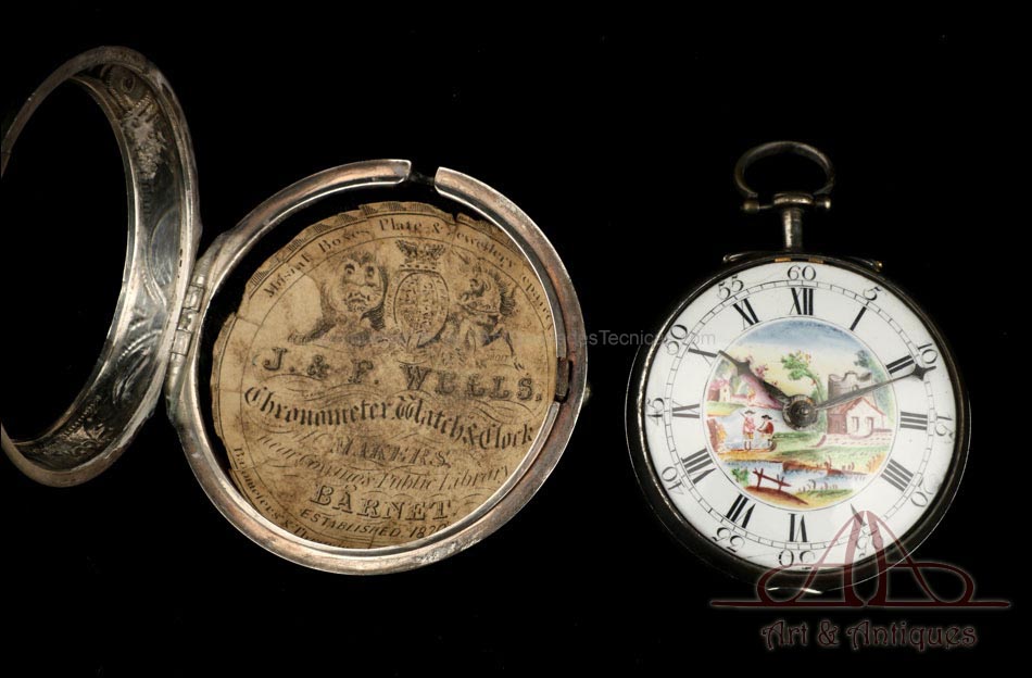 Antiguo reloj de bolsillo catalino Wikelmann con doble caja de plata, fabricado en Londres (Inglaterra) en 1784 y en muy buenas condiciones. El reloj funciona bien y muestra un diseño muy bello, con exterior repujado a mano y esfera pintada. La caja del reloj es de plata maciza y también lo es la caja exterior, lo que hace de este reloj una auténtica joya de época. La tapa trasera de la caja exterior lleva una decoración repujada que muestra a varias figuras; a la derecha hay un grupo que parece conversar, mientras que a la izquierda podemos ver a un hombre en un bote. La escena está rodeada de volutas. Dentro de la tapa trasera de esta caja hay una etiqueta de papel con varias inscripciones impresas, entre ellas J. & F. WELLS – Chronometer, Watch & Clock MAKERS.