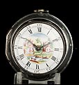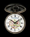 El reloj lleva una tapa delantera es de cristal y protege una delicada esfera blanca, con un encantado paisaje rural pintado a mano en distintos colores. La esfera lleva números romanos negros para las horas y numeración arábiga para los segundos. Las agujas son de metal negro, con remates en forma de cruz. Podemos distinguir un pequeño pelo en la parte inferior, pero en general la pieza está en muy buenas condiciones. La tapa trasera del reloj es de plata lisa; en su interior podemos ver varios contrastes, entre ellos el correspondiente al año 1784 y las iniciales S.P. La maquinaria es muy hermosa, con una compleja decoración de volutas grabadas y la firma del fabricante en letra cursiva: Wikelmann, London, junto con el número de serie 9359.