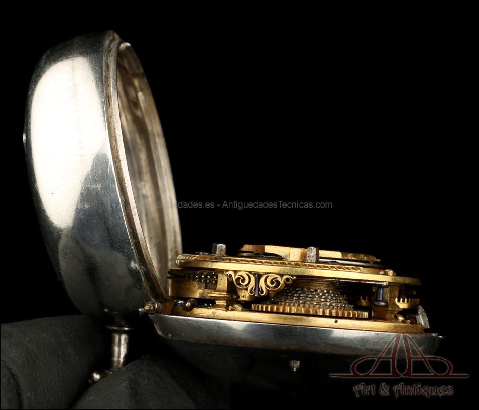 Este antiguo reloj catalino Wikelmann con doble caja de plata llamará la atención en la mejor de las colecciones, por su belleza y buen estado de conservación.