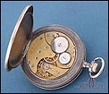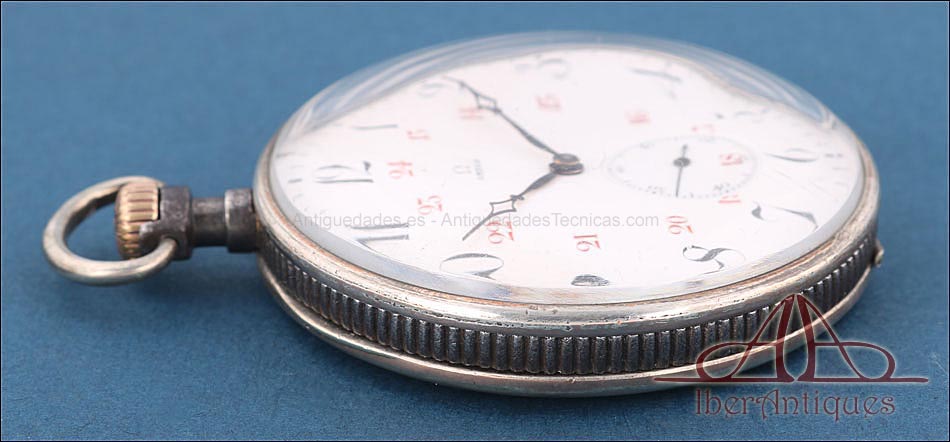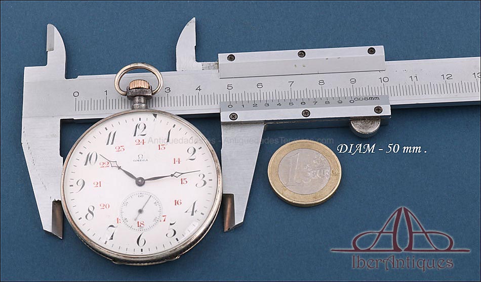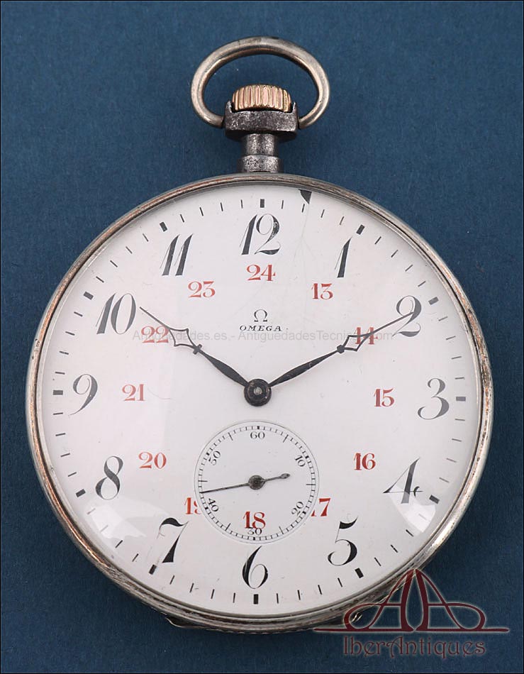 Antiguo reloj de bolsillo Omega en acero pavonado, fabricado en Suiza circa 1920 y de gran elegancia. El reloj está bien conservado, con tan solo ligeros signos del paso del tiempo y del uso, lógicos en un artículo con cerca de cien años de antigüedad. La tapa delantera es de cristal y deja ver una preciosa esfera de porcelana blanca, con números arábigos negros, numeración de 24 horas roja y agujas negras tipo catedral. Lleva el nombre y el logotipo de OMEGA en la posición de las 12. La caja de acero pavonado tiene borde estriado y tapa trasera lisa; la única pieza que se diferencia del resto es la corona, de metal dorado. La tapa guardapolvo protege una maquinaria sobria y precisa, muy bien conservada y con el nombre de la marca grabado en una de sus piezas.