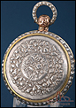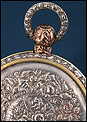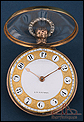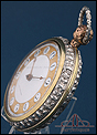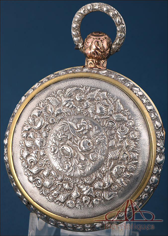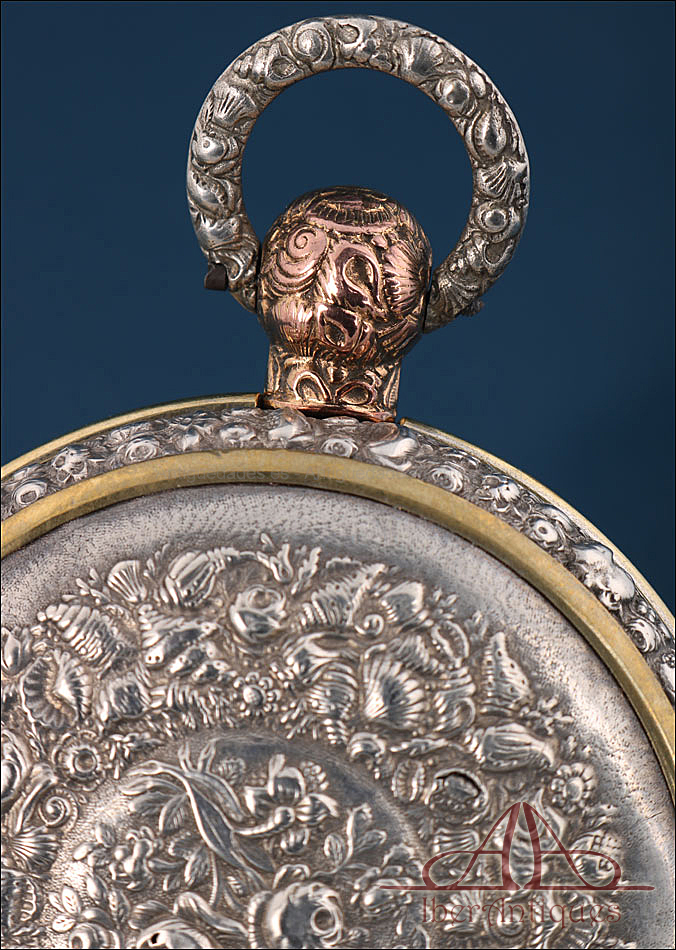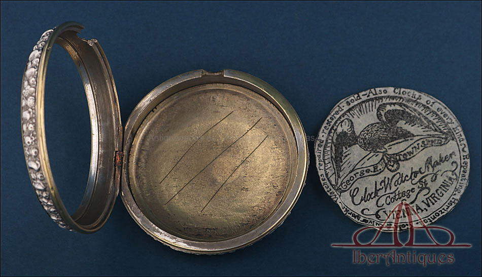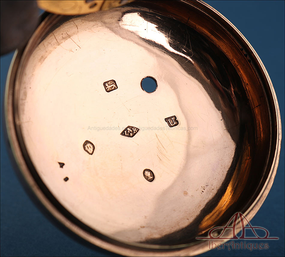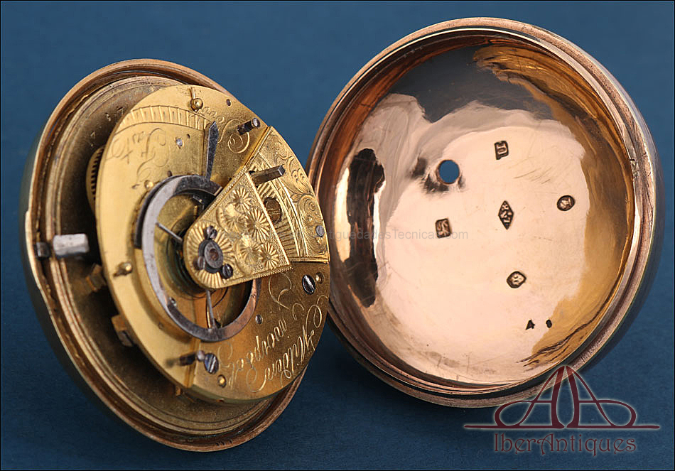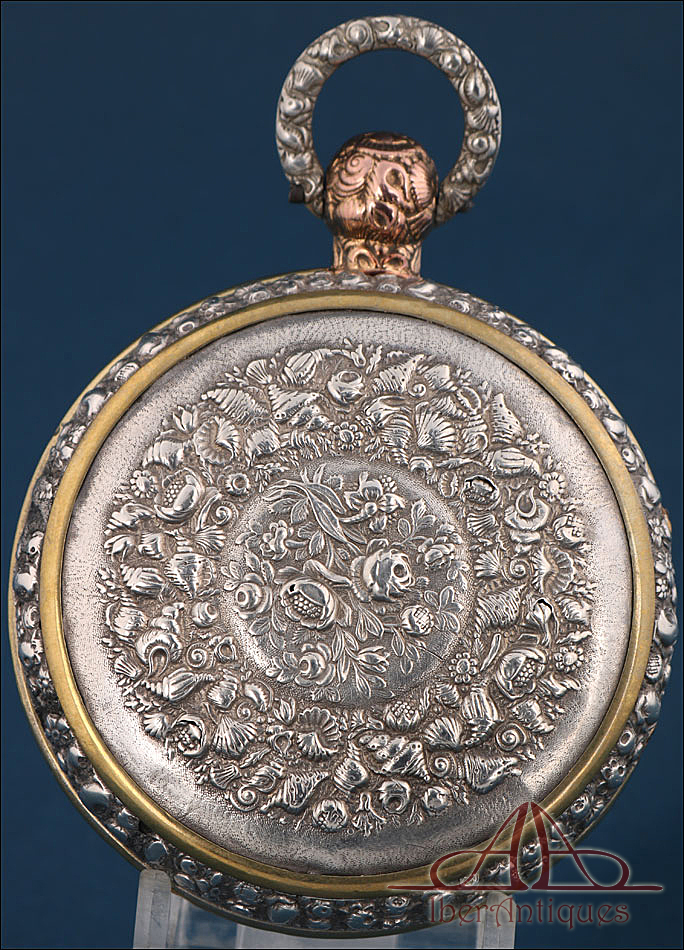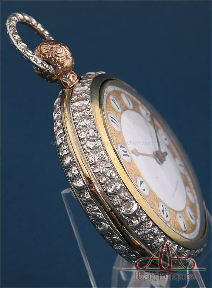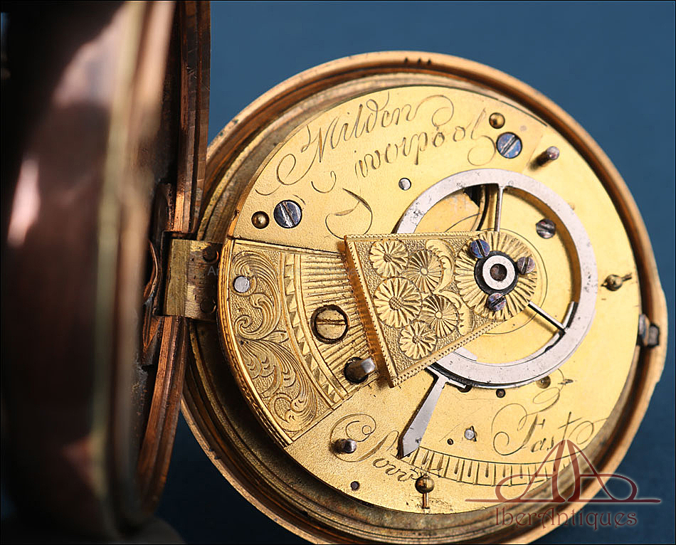 Fantástico reloj de bolsillo catalino antiguo de plata de 62 mm, firmado por Milden, Liverpool UK y fabricado en 1835. Se trata de un artículo realmente bello, con doble caja y una hermosa decoración labrada. La caja exterior es de metal plateado, repujada en ambas caras con un motivo floral grabado al detalle. La frontal lleva tapa de cristal que deja ver la preciosa esfera, de porcelana blanca y corona dorada, con números arábigos negros esmaltados. Lleva agujas doradas tipo ‘poire’ (pera) y la palabra LIVERPOOL en la posición de las 6. La caja interna es de plata dorada; en el interior de la tapa trasera podemos los contrastes de Londres y del año 1835. La maquinaria es muy bella y está firmada a mano por Milden, Liverpool, un relojero inglés que vivió y trabajó a principios del siglo XIX. El reloj incluye una llave; no es la original, pero cumple perfectamente su función.