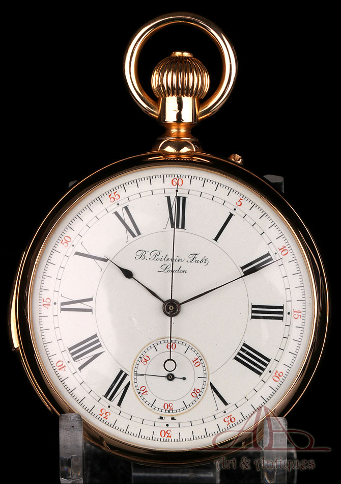 Antiguo reloj de oro macizo B. Poitevin (Bernard Poitevin) con sonería de minutos y cronómetro, fabricado en París circa 1890, en muy buenas condiciones y en funcionamiento. Bernard Poitevin estaba situado en la Rue de Vivienne en París, y tenía también sucursal en Londres y Ginebra. El reloj lleva caja de oro rosado de 18 quilates; la tapa delantera decorada con un complicado monograma grabado a mano (MB) con una corona de Marqués. El reloj lleva corona, colgante y anilla de oro en la posición de las 12.