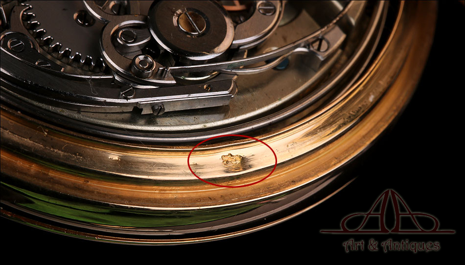 La tapa guardapolvo está grabada con la inscripción No. 33292, POITEVIN FABt, 1rc Medaille, Exposition de Vienne 1873. En el interior hay dos contrastes ilegibles, probablemente marcas para el oro francés de la época. La esfera blanca lleva números romanos, anillo de minutos cerrado con marcadores arábigos en color rojo cada cinco minutos y segundero en la posición de las seis.
