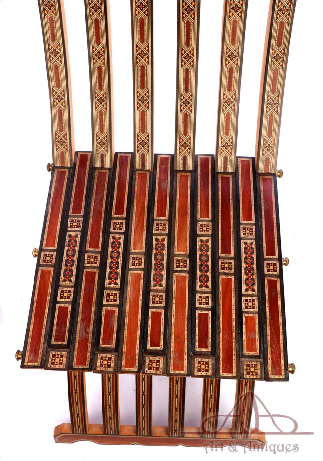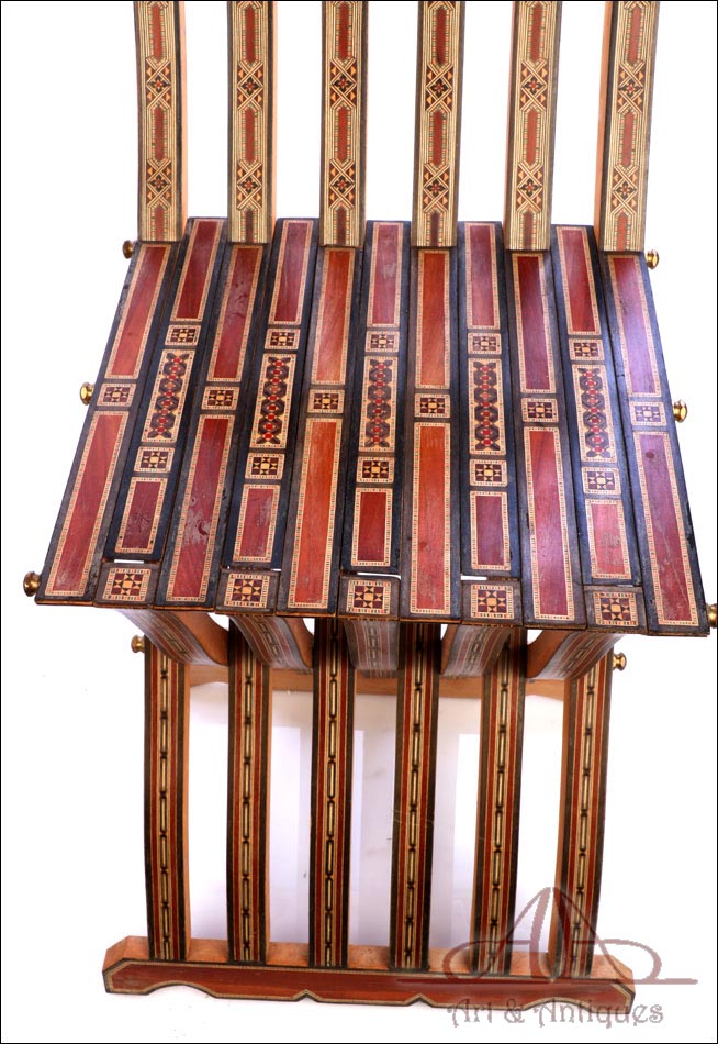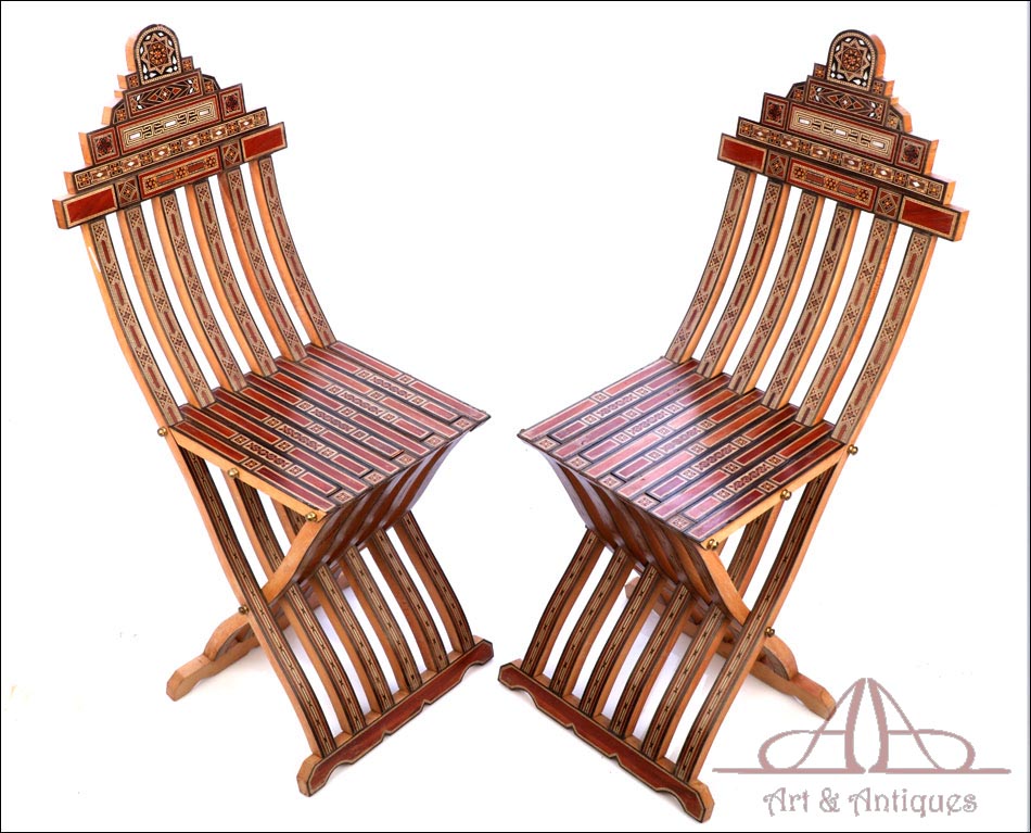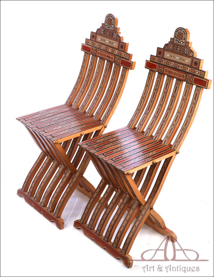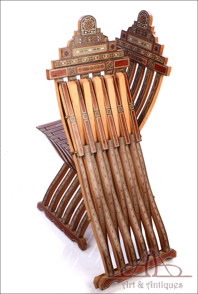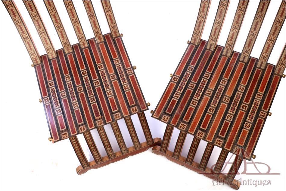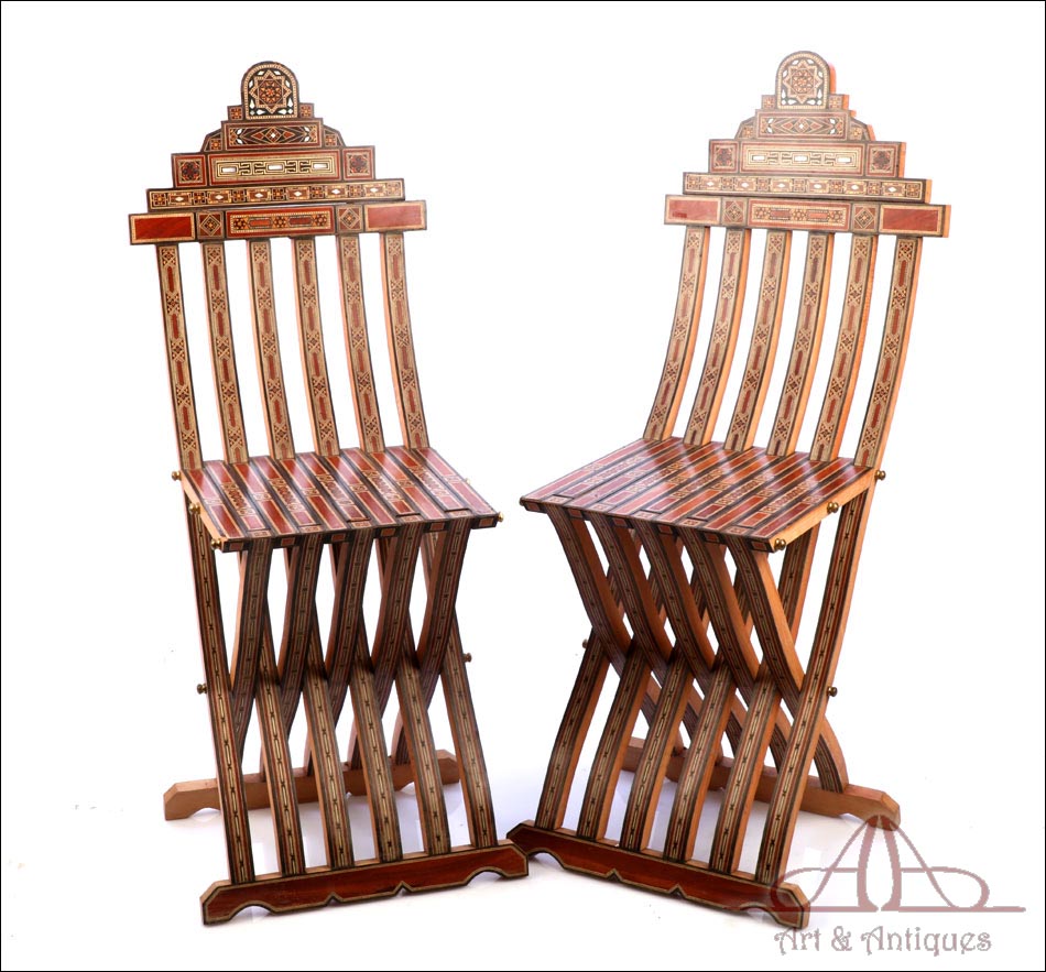 Antigua pareja de sillas de tijera con marquetería, originales de mediados del siglo XX y en fantástico estado de conservación. Las sillas son plegables y están decoradas con un excepcional trabajo de marquetería que cubre toda su parte delantera. La marquetería está realizada con chapa de madera de distintas especies y nácar natural. Se trata de una decoración de inspiración arábiga, formada por motivos geométricos, estrellas simétricas y cenefas regulares. La hermosa combinación de materiales genera un atractivo despliegue cromático: ébano negro, limoncillo dorado, nogal pardo, caoba rojiza y nácar blanco. Las sillas están fabricadas en madera de haya maciza, que se puede apreciar en su parte posterior (sin revestimiento de marquetería). Están formadas por un ligero y original entramado de listones, unidos entre sí por ejes y remaches de latón que permiten su plegado.