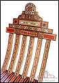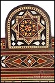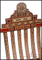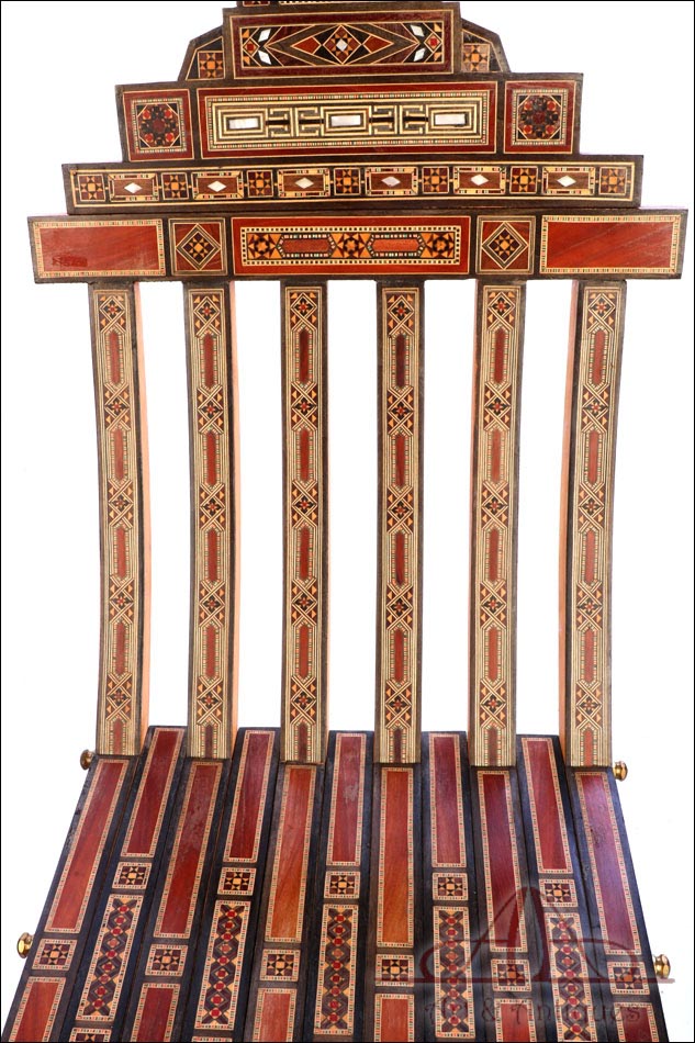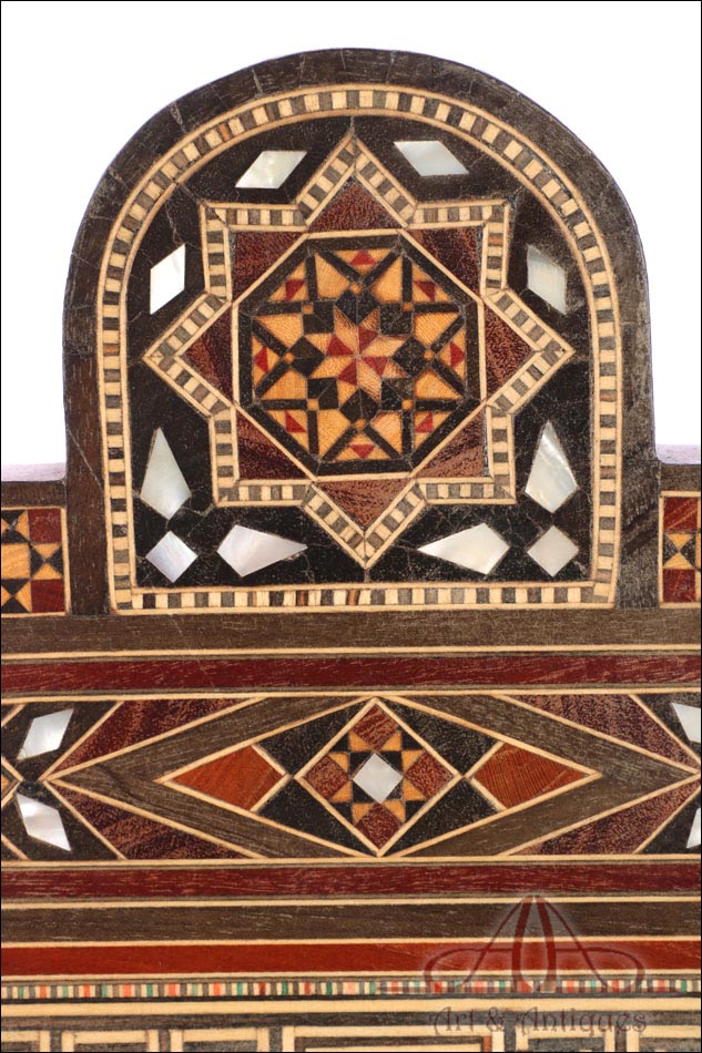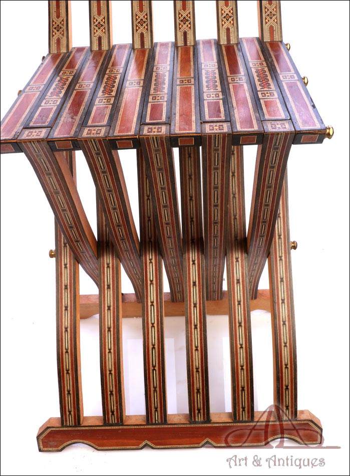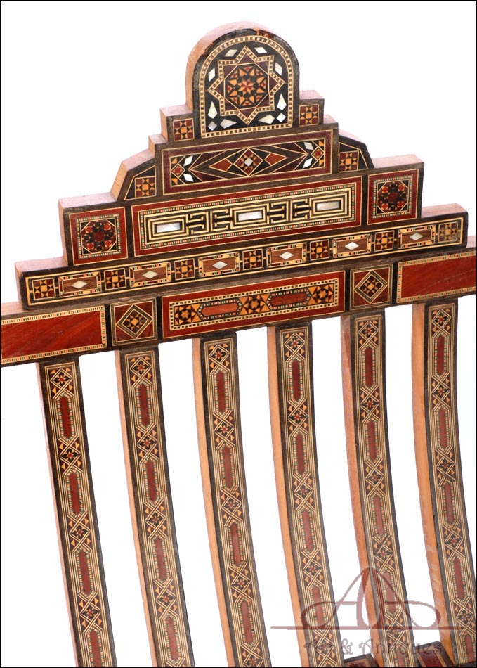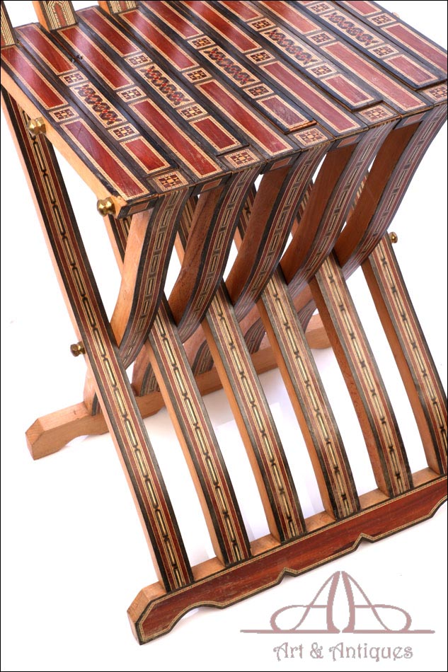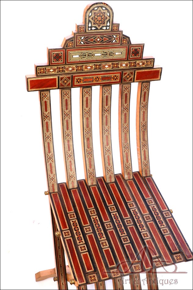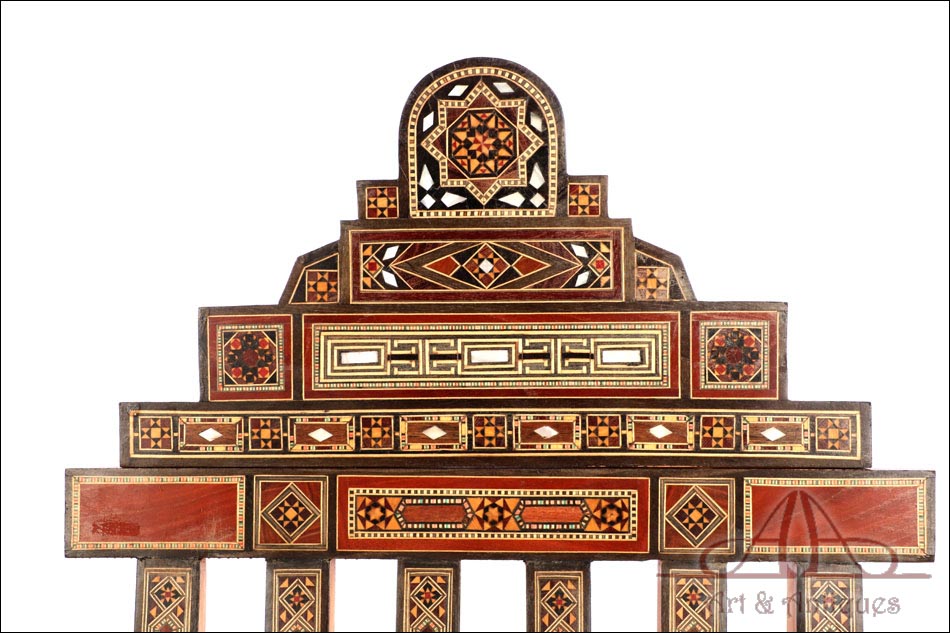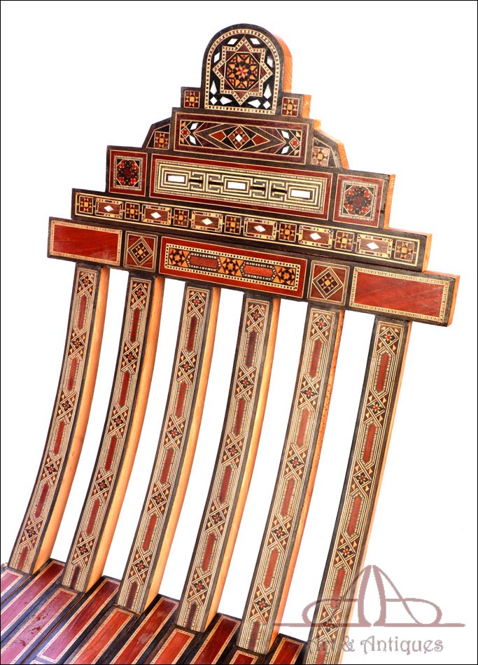 Antigua pareja de sillas de tijera con marquetería, originales de mediados del siglo XX y en fantástico estado de conservación. Las sillas son plegables y están decoradas con un excepcional trabajo de marquetería que cubre toda su parte delantera. La marquetería está realizada con chapa de madera de distintas especies y nácar natural. Se trata de una decoración de inspiración arábiga, formada por motivos geométricos, estrellas simétricas y cenefas regulares. La hermosa combinación de materiales genera un atractivo despliegue cromático: ébano negro, limoncillo dorado, nogal pardo, caoba rojiza y nácar blanco. Las sillas están fabricadas en madera de haya maciza, que se puede apreciar en su parte posterior (sin revestimiento de marquetería). Están formadas por un ligero y original entramado de listones, unidos entre sí por ejes y remaches de latón que permiten su plegado.