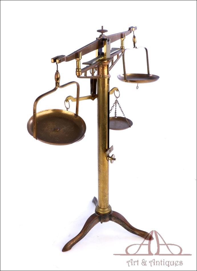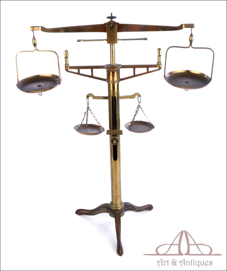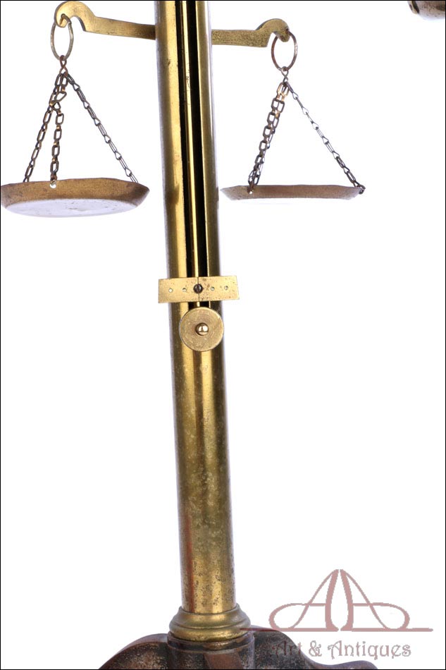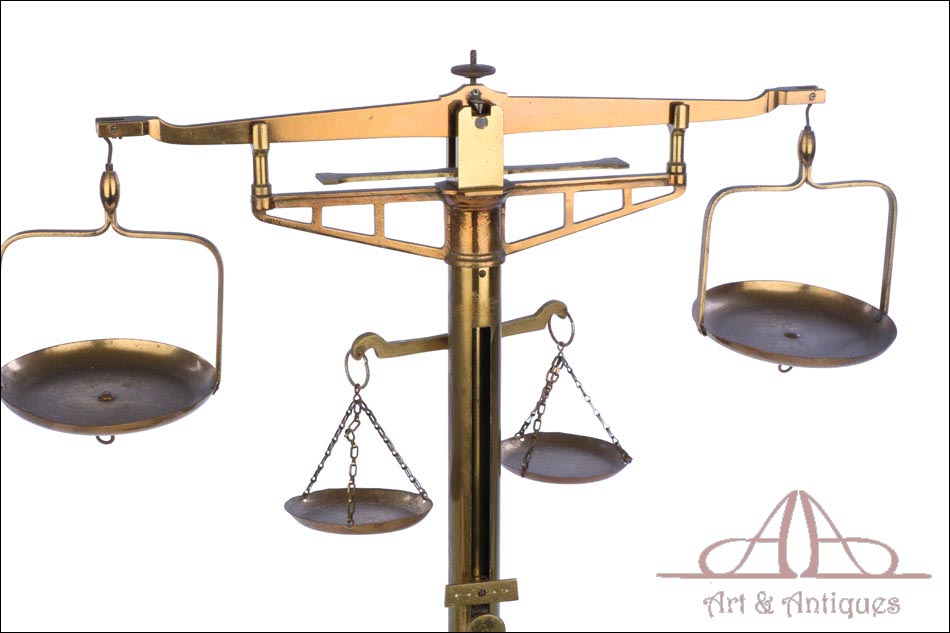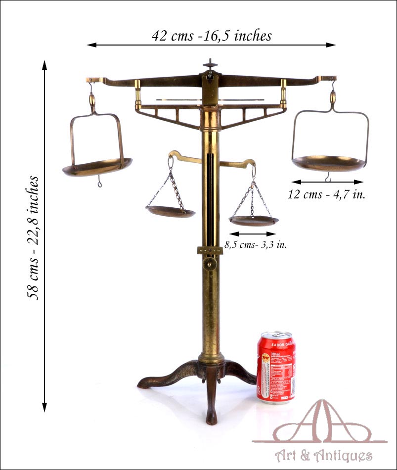 Antigua balanza de comercio fabricada circa 1900, en muy buen estado y con un diseño lleno de encanto y belleza. La balanza está bien conservada y en funcionamiento, si bien el fiel y la escala se han perdido con los años. Aun así, su aspecto es realmente atractivo y todavía se podría emplear con un juego de pesas. La balanza lleva una base de tres patas con soporte central cilíndrico, cruz superior con dos platillos, pieza horizontal para mantener la cruz parada y otra pequeña cruz debajo de la superior para pesar productos de menor tamaño. Los platillos de la cruz superior llevan dos pequeños ganchos en la parte inferior, que permiten pesar objetos colgándolos de ellos. La balanza está fabricada íntegramente en latón; el metal se encuentra en excelente estado y conserva el barniz transparente original de época, que le aporta una bella pátina.