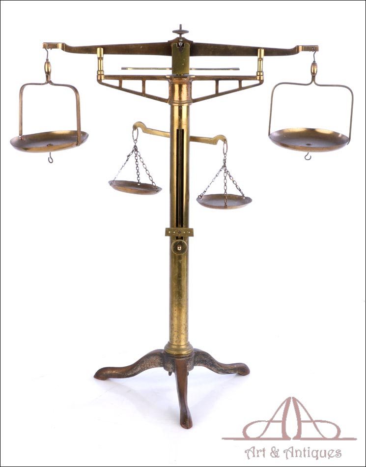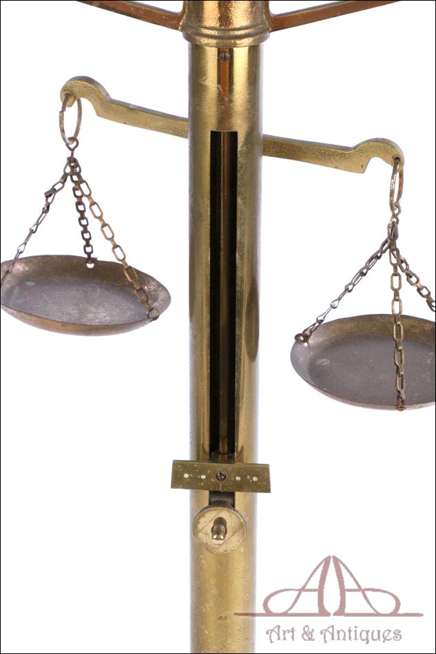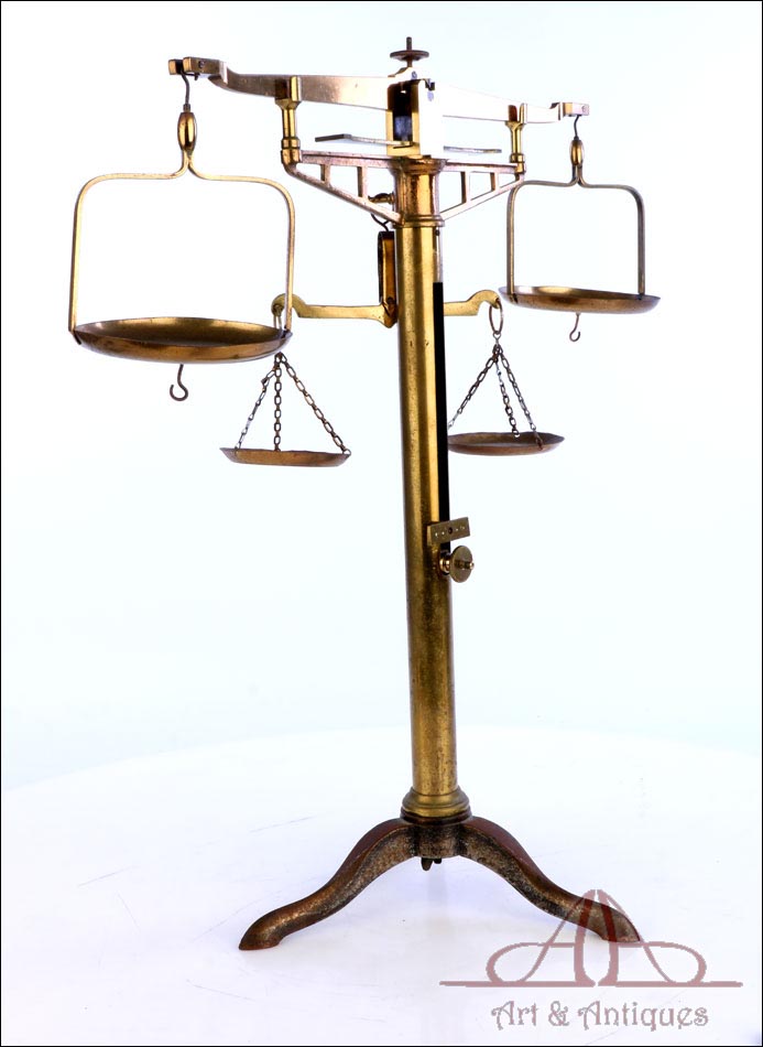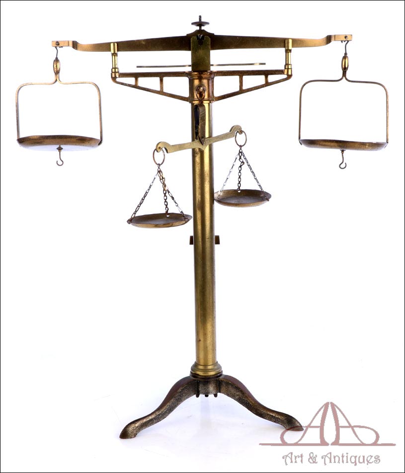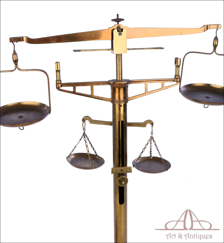 Antigua balanza de comercio fabricada circa 1900, en muy buen estado y con un diseño lleno de encanto y belleza. La balanza está bien conservada y en funcionamiento, si bien el fiel y la escala se han perdido con los años. Aun así, su aspecto es realmente atractivo y todavía se podría emplear con un juego de pesas. La balanza lleva una base de tres patas con soporte central cilíndrico, cruz superior con dos platillos, pieza horizontal para mantener la cruz parada y otra pequeña cruz debajo de la superior para pesar productos de menor tamaño. Los platillos de la cruz superior llevan dos pequeños ganchos en la parte inferior, que permiten pesar objetos colgándolos de ellos. La balanza está fabricada íntegramente en latón; el metal se encuentra en excelente estado y conserva el barniz transparente original de época, que le aporta una bella pátina.