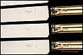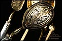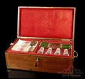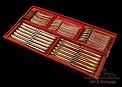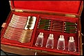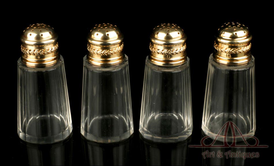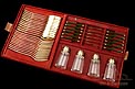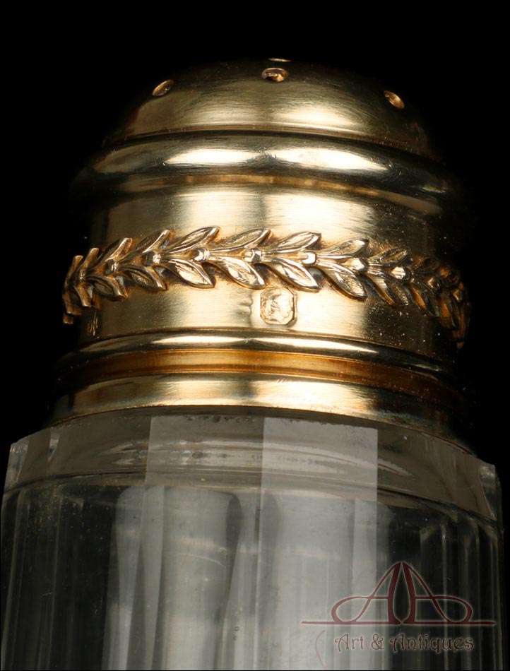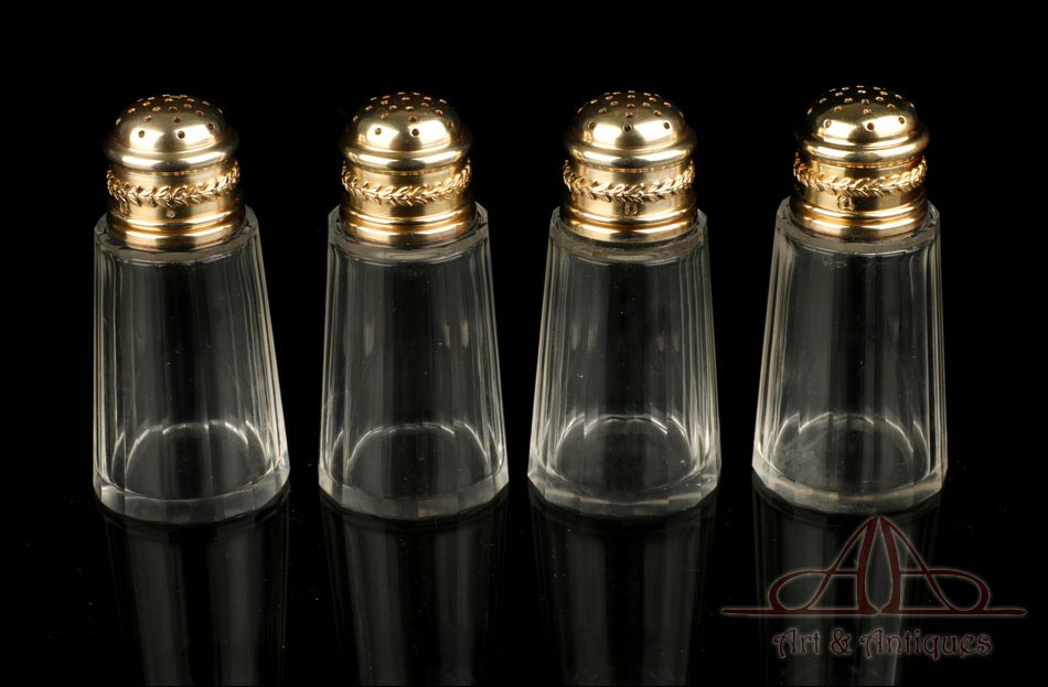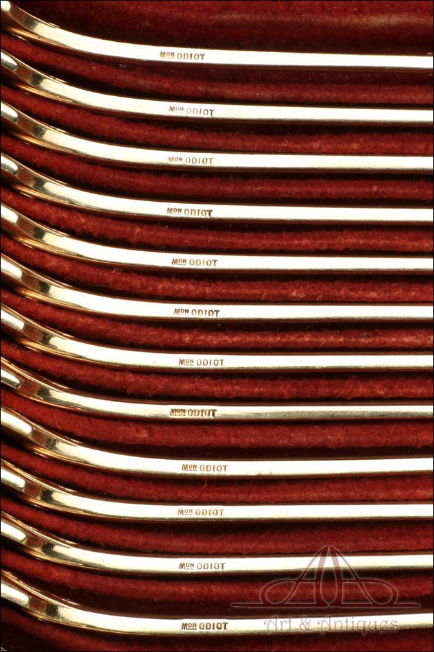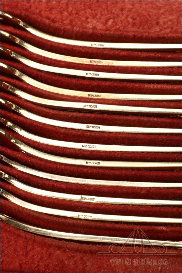 Los cubiertos muestran un elegante diseño clásico, con estilizados mangos que se amplían en el extremo y delicados motivos grabados y en relieve. Los motivos son abstractos y simétricos, tan discretos como estilosos. Las partes doradas conservan el acabado en excelentes condiciones, liso y uniforme. La cubertería incluye cuatro preciosos saleros de cristal y plata dorada y un completo juego de cubiertos de servir, formado por diez utensilios. Todas las piezas se guardan en el estuche original de madera de roble maciza, un impresionante cofre con refuerzos y asas de latón en excelentes condiciones. En el forro interior de la tapa podemos ver la inscripción “Maison ODIOT – FAB-que ORFÉVRERIE – PARÍS”; en la cerradura podemos ver el nombre de la firma grabado a mano en elegante letra cursiva. El estuche conserva la llave, pero la cerradura no se encuentra operativa.